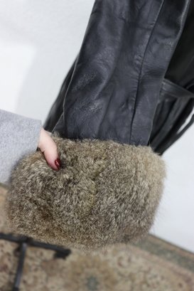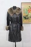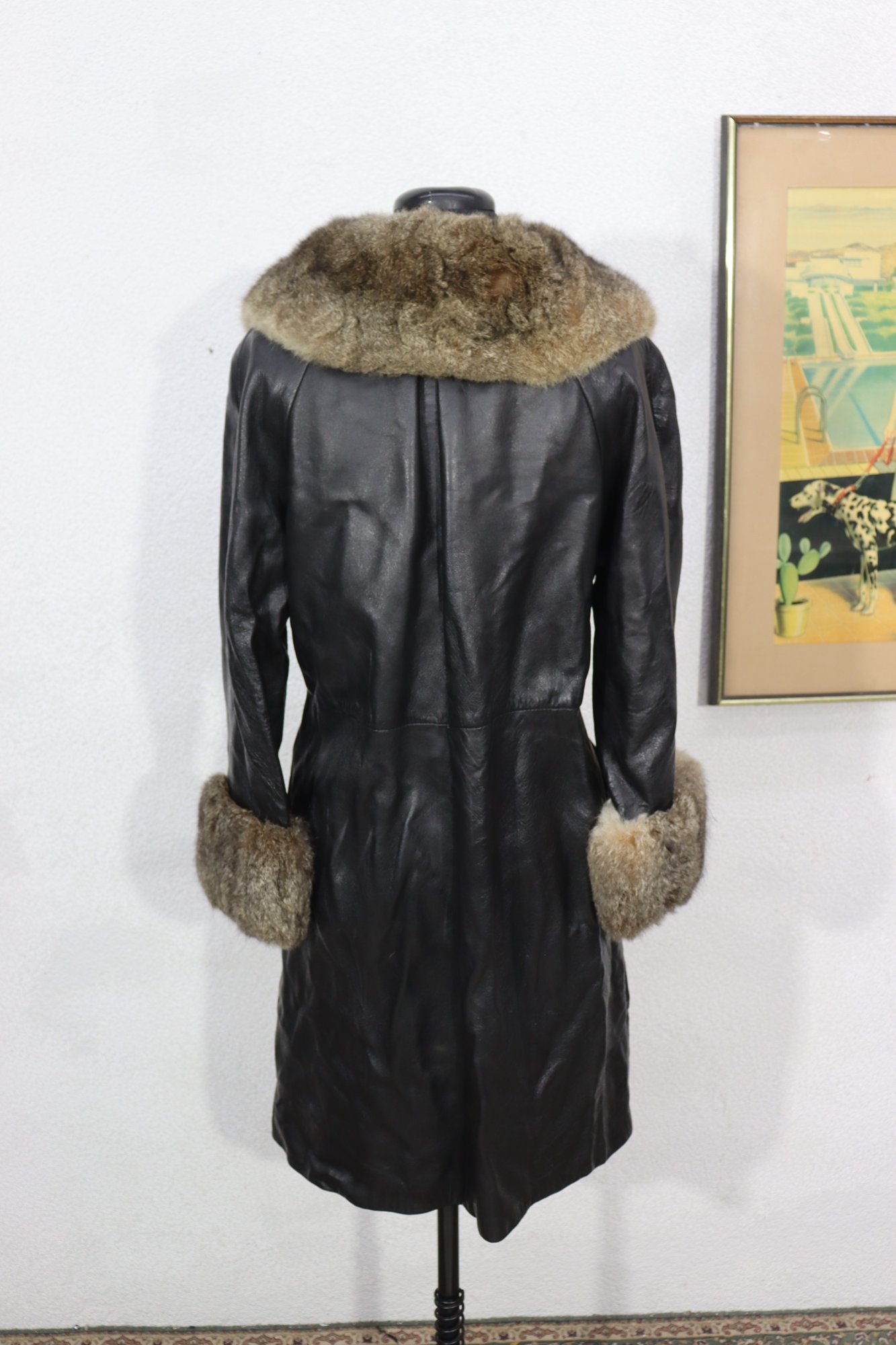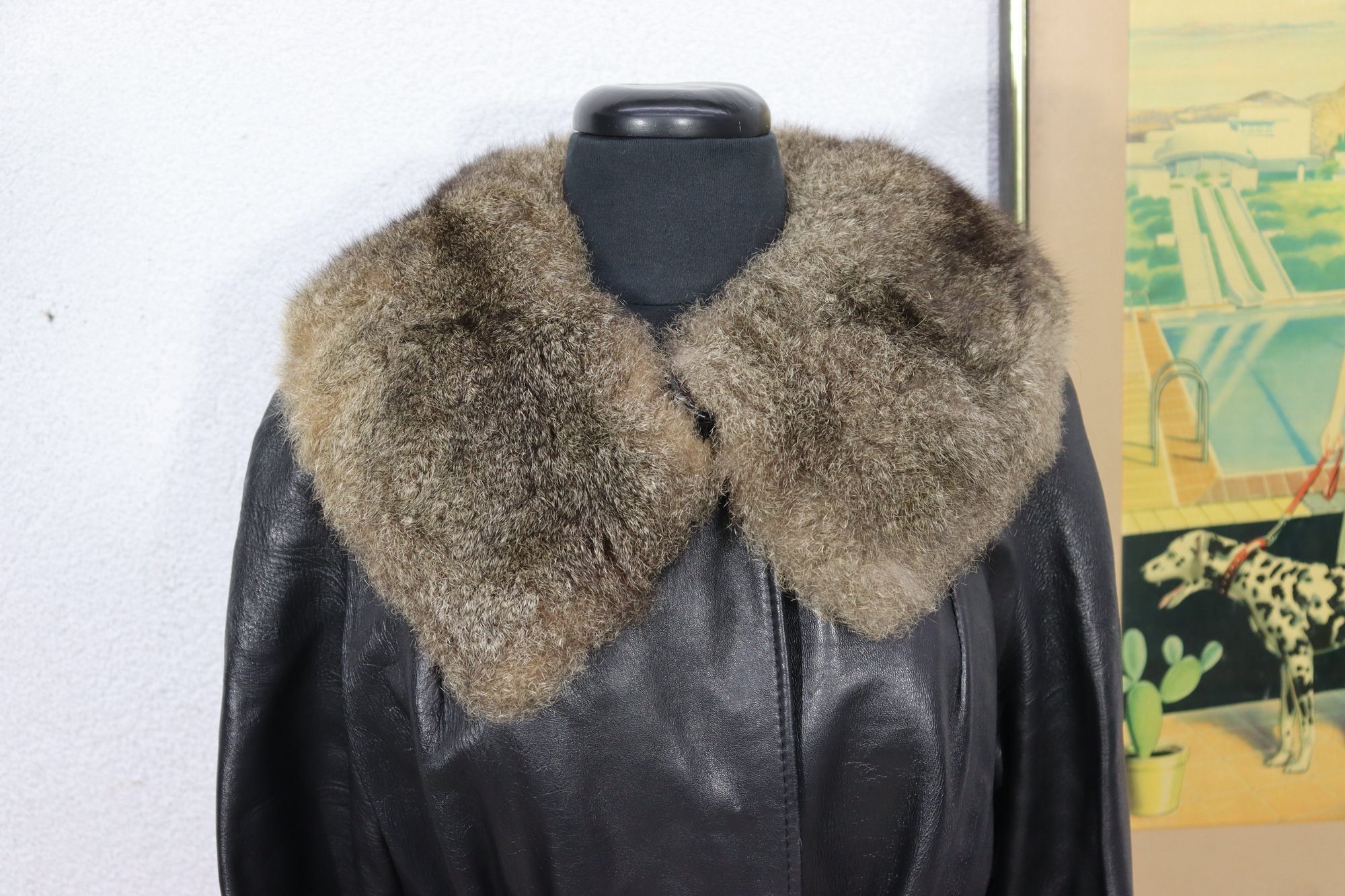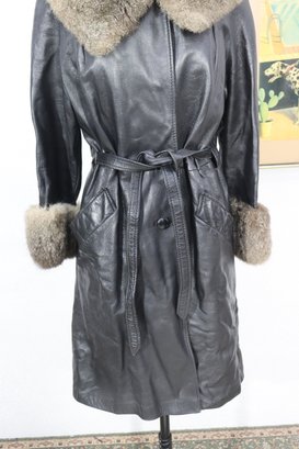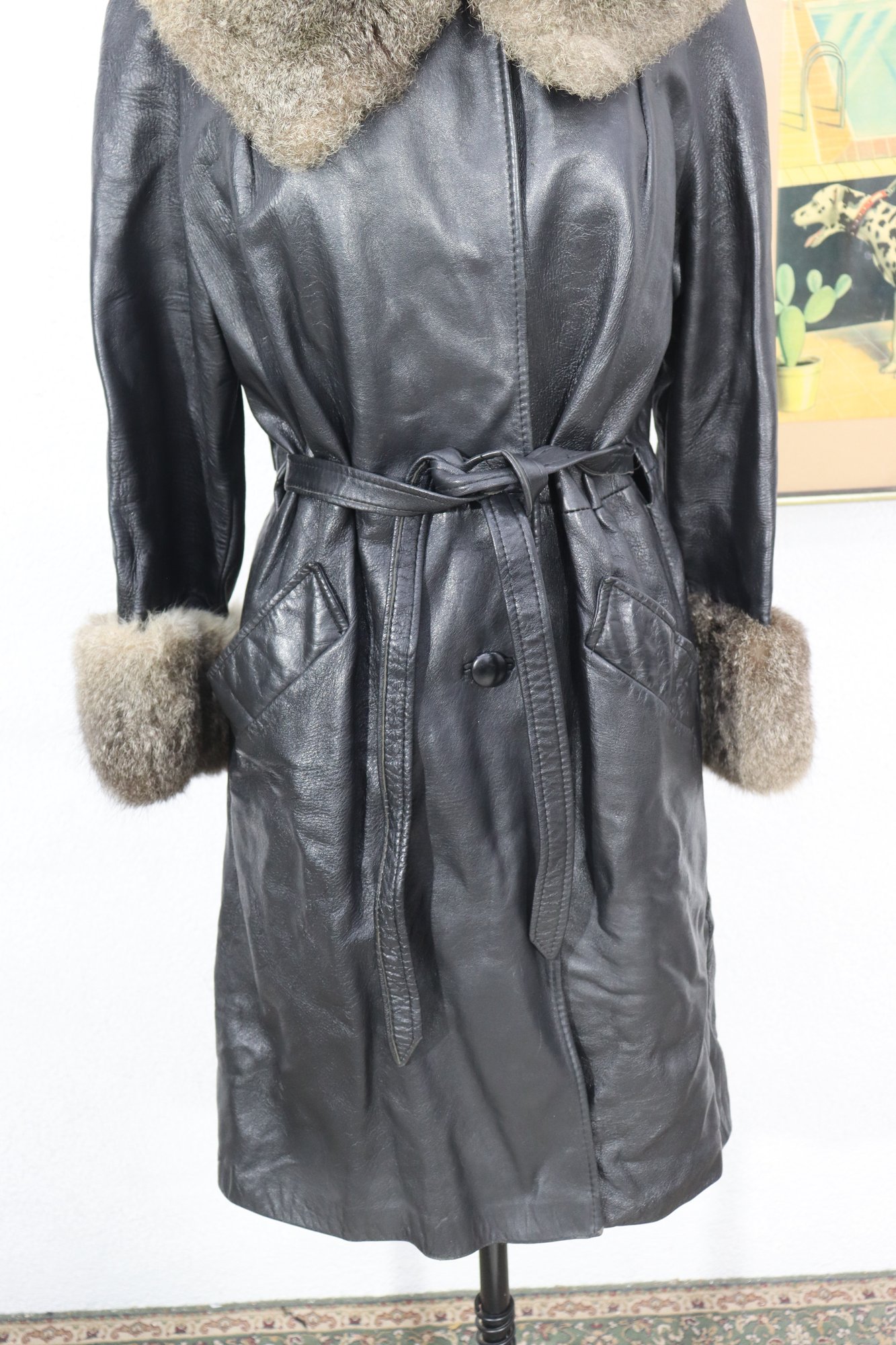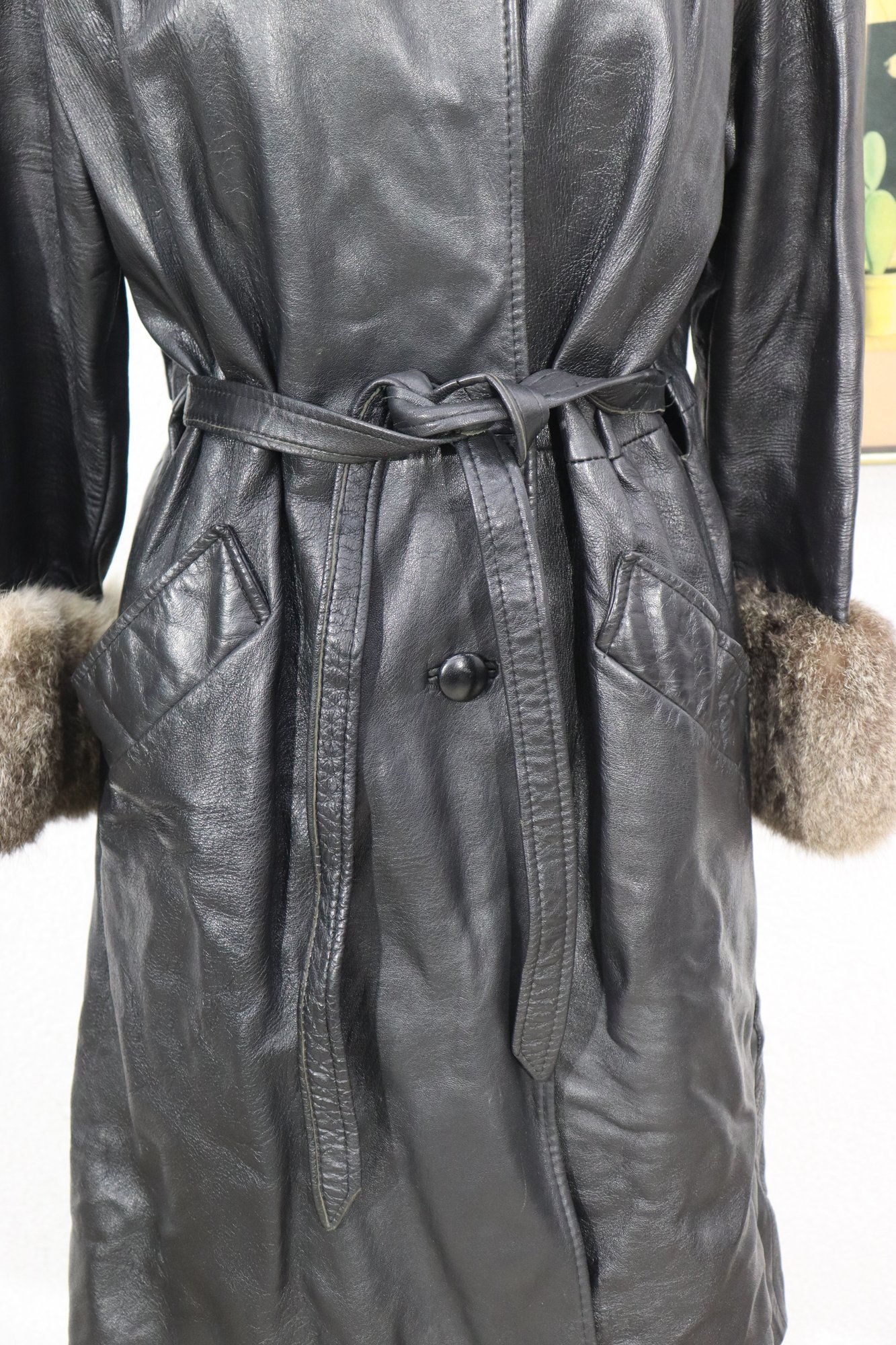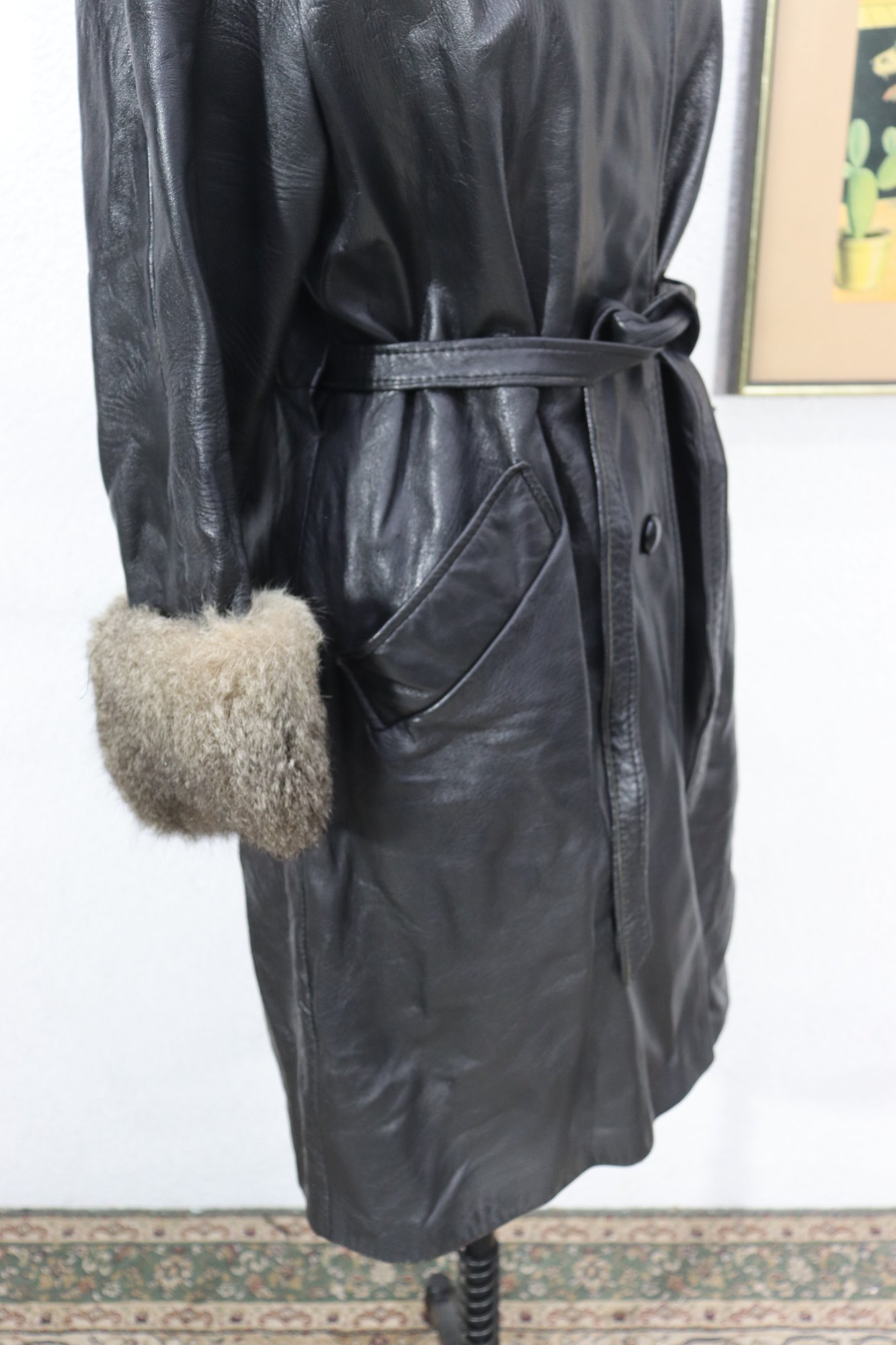 This vintage black leather trench coat with faux fur trim is the perfect mix of edgy sophistication and timeless elegance. Designed for both warmth and style, it features a flattering belted silhouette and plush faux fur accents.