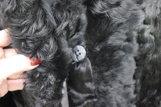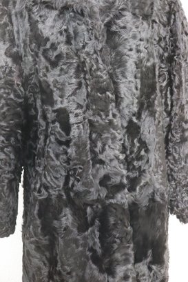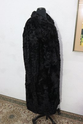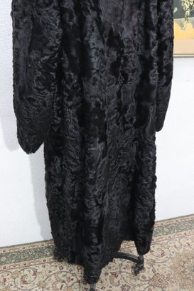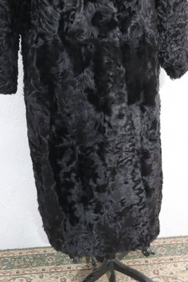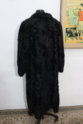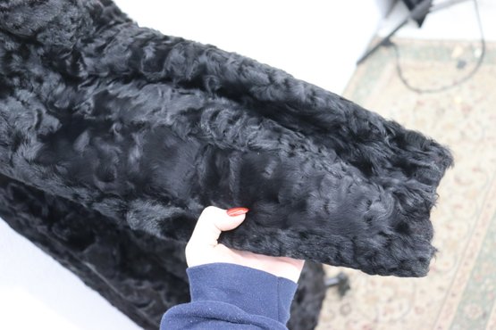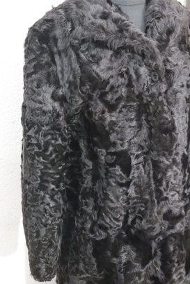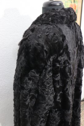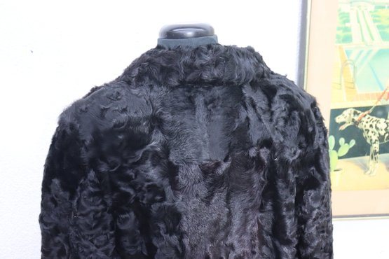 this vintage black Persian lamb style fur coat is a stunning statement piece for any collection or wardrobe. Made with a soft, richly textured curly fur exterior, it offers both warmth and classic sophistication.