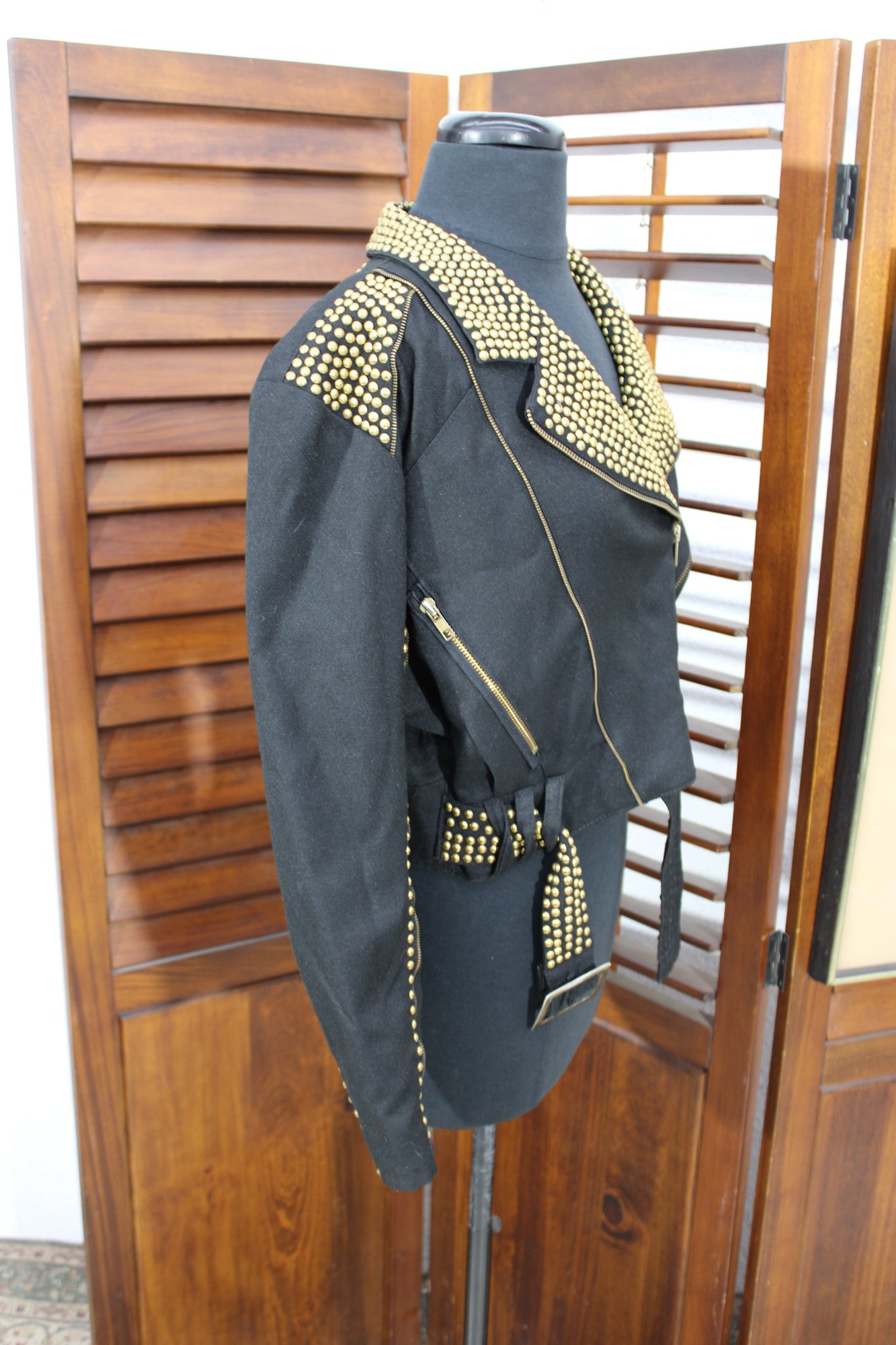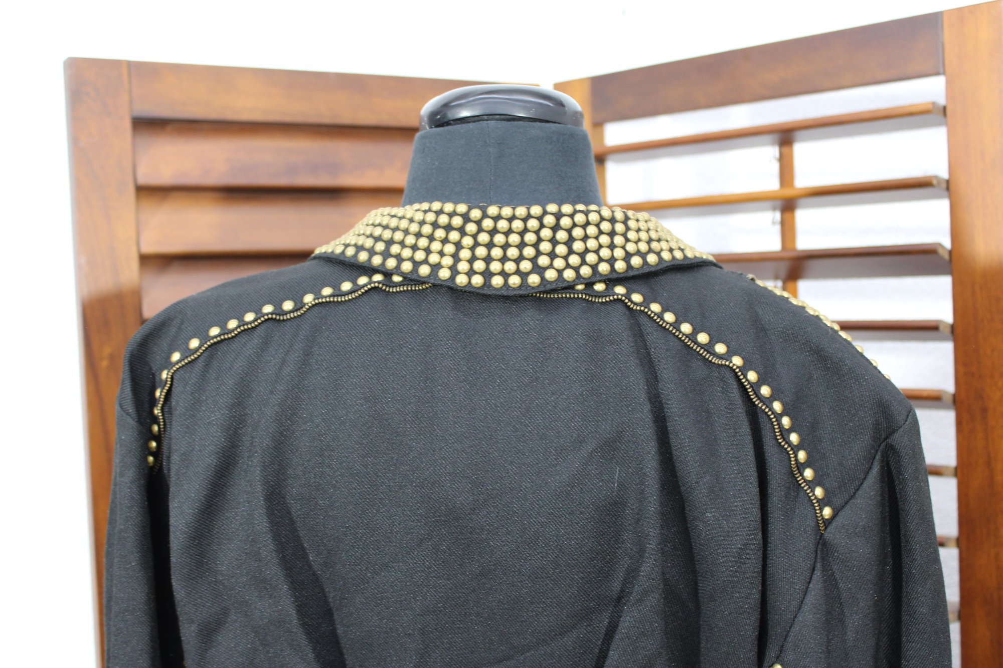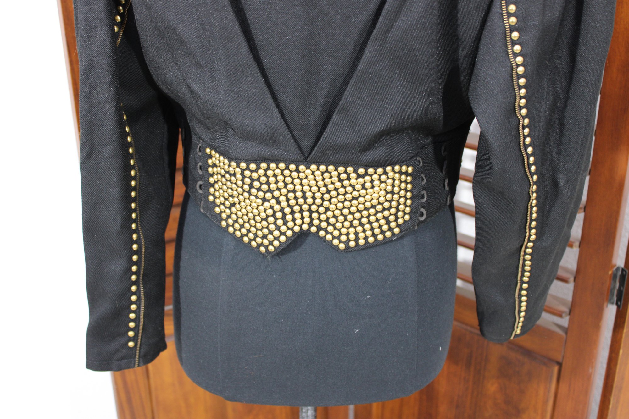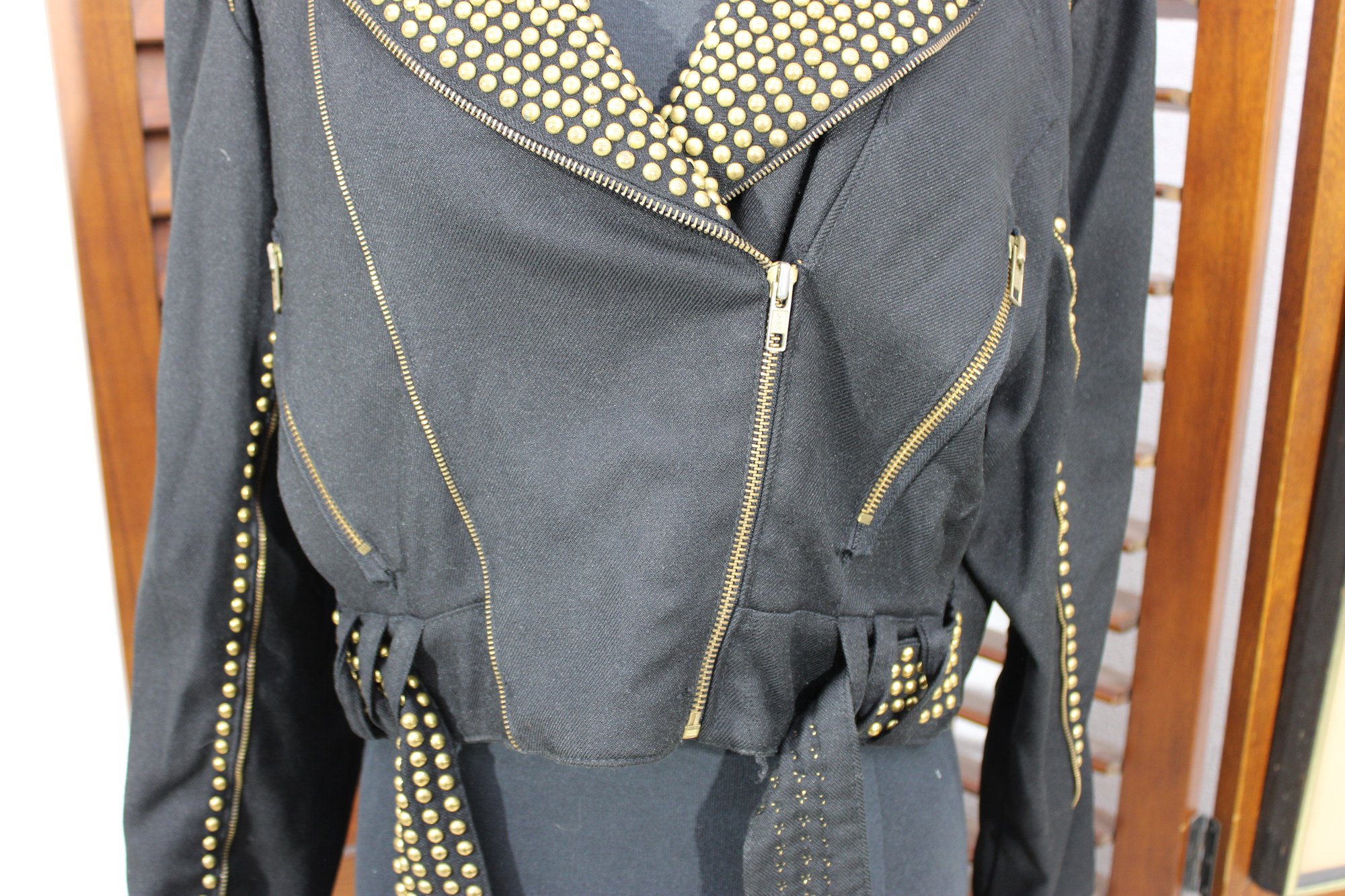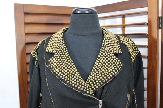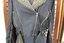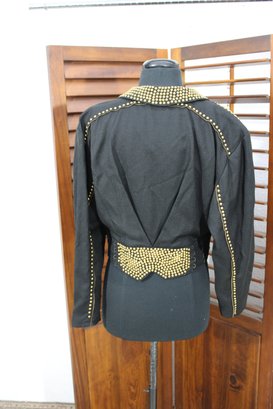 Bold and edgy, this vintage black moto-style jacket features dramatic gold-tone stud detailing throughout the collar, sleeves, and waist, paired with asymmetrical zipper accents and a belted waist for a striking silhouette. Designed with classic biker influence, this piece has strong visual impact and standout vintage attitude.