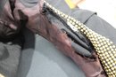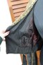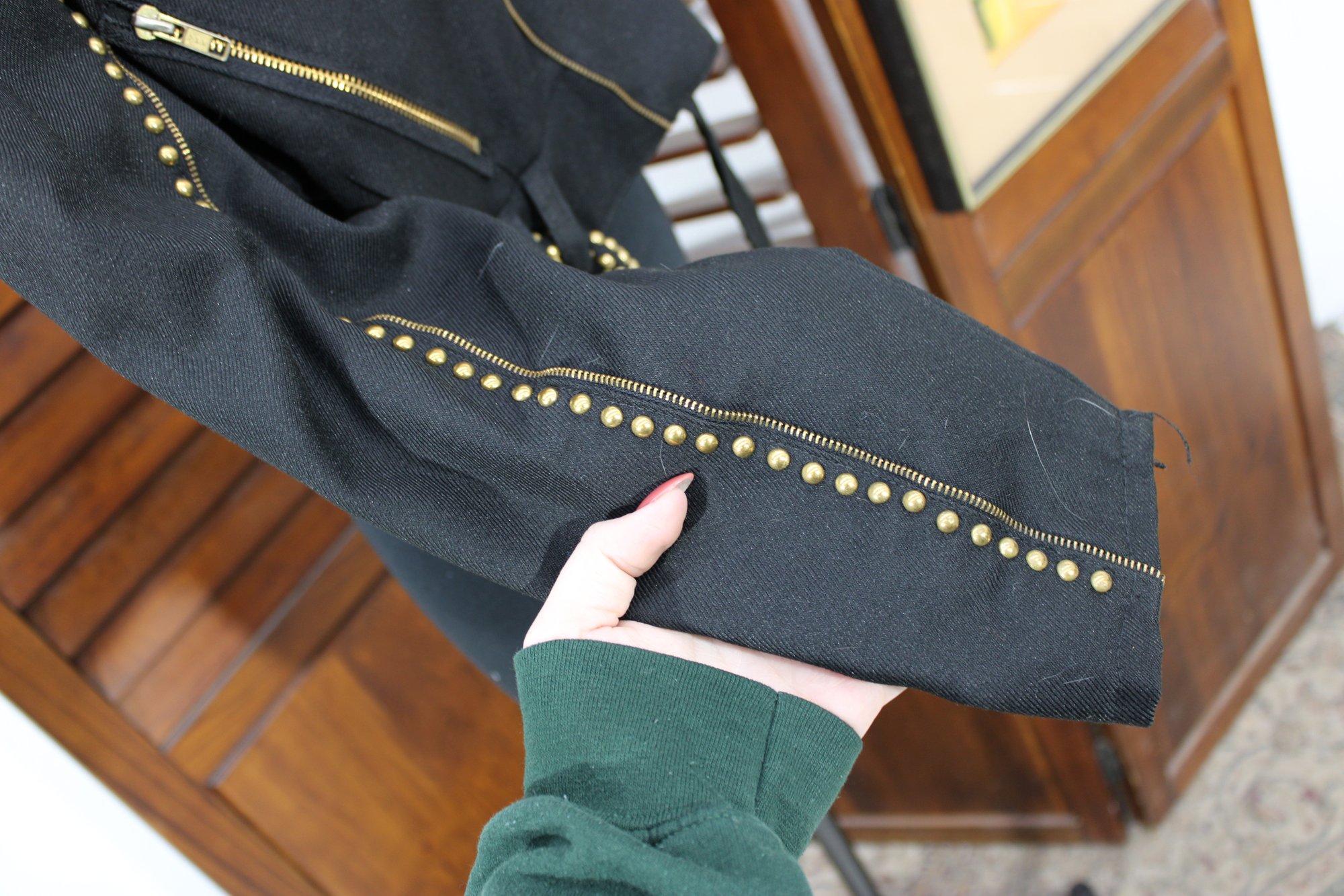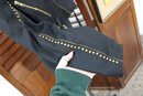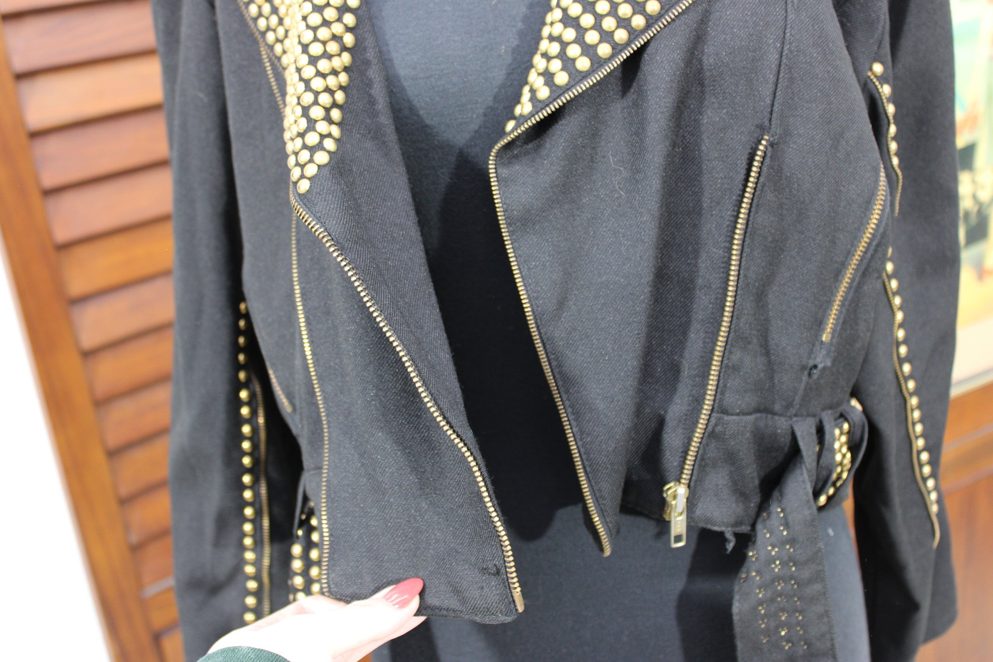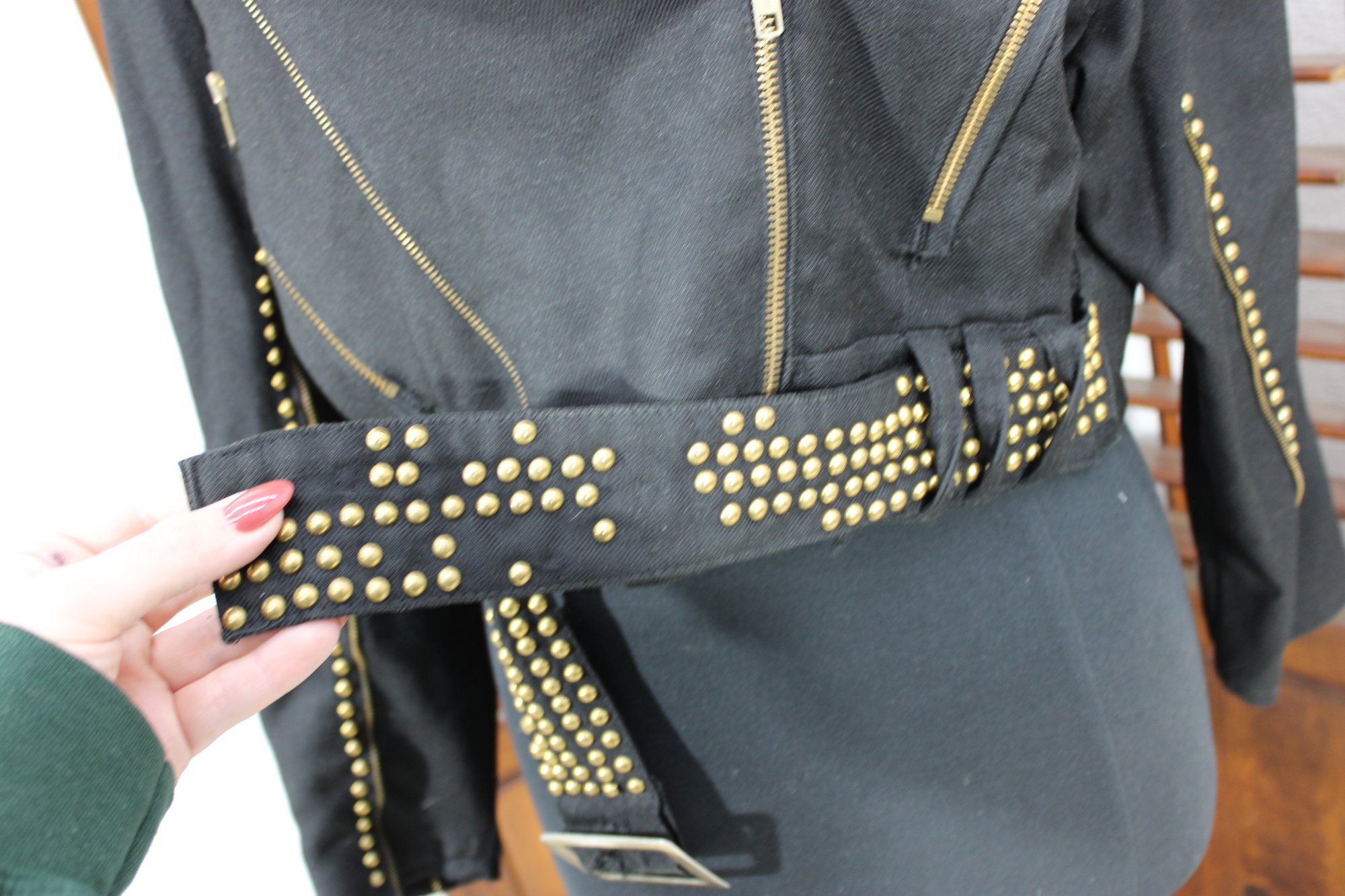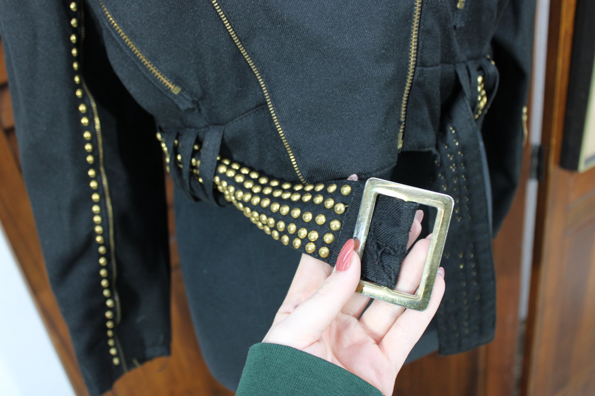 Bold and edgy, this vintage black moto-style jacket features dramatic gold-tone stud detailing throughout the collar, sleeves, and waist, paired with asymmetrical zipper accents and a belted waist for a striking silhouette. Designed with classic biker influence, this piece has strong visual impact and standout vintage attitude.