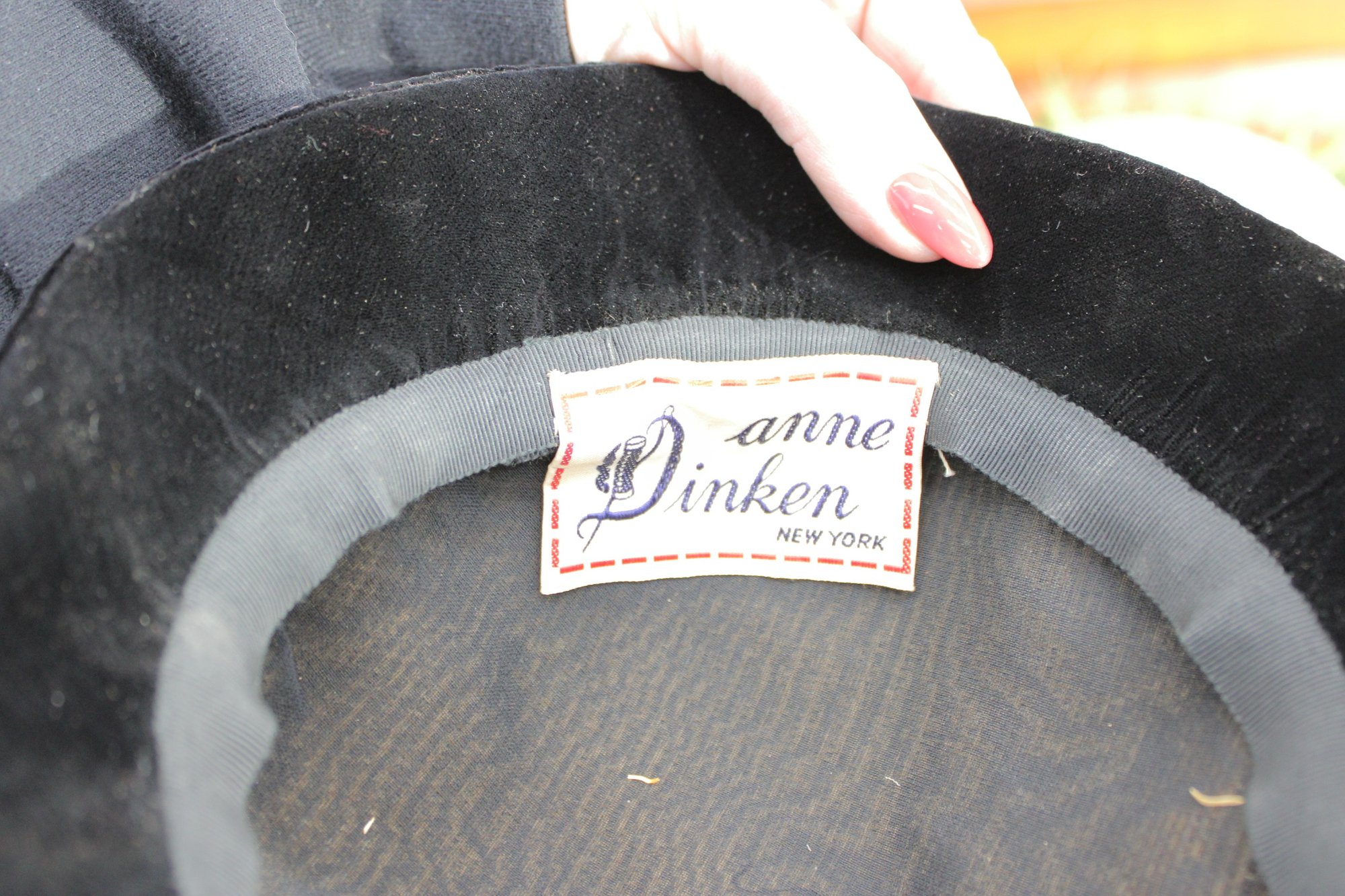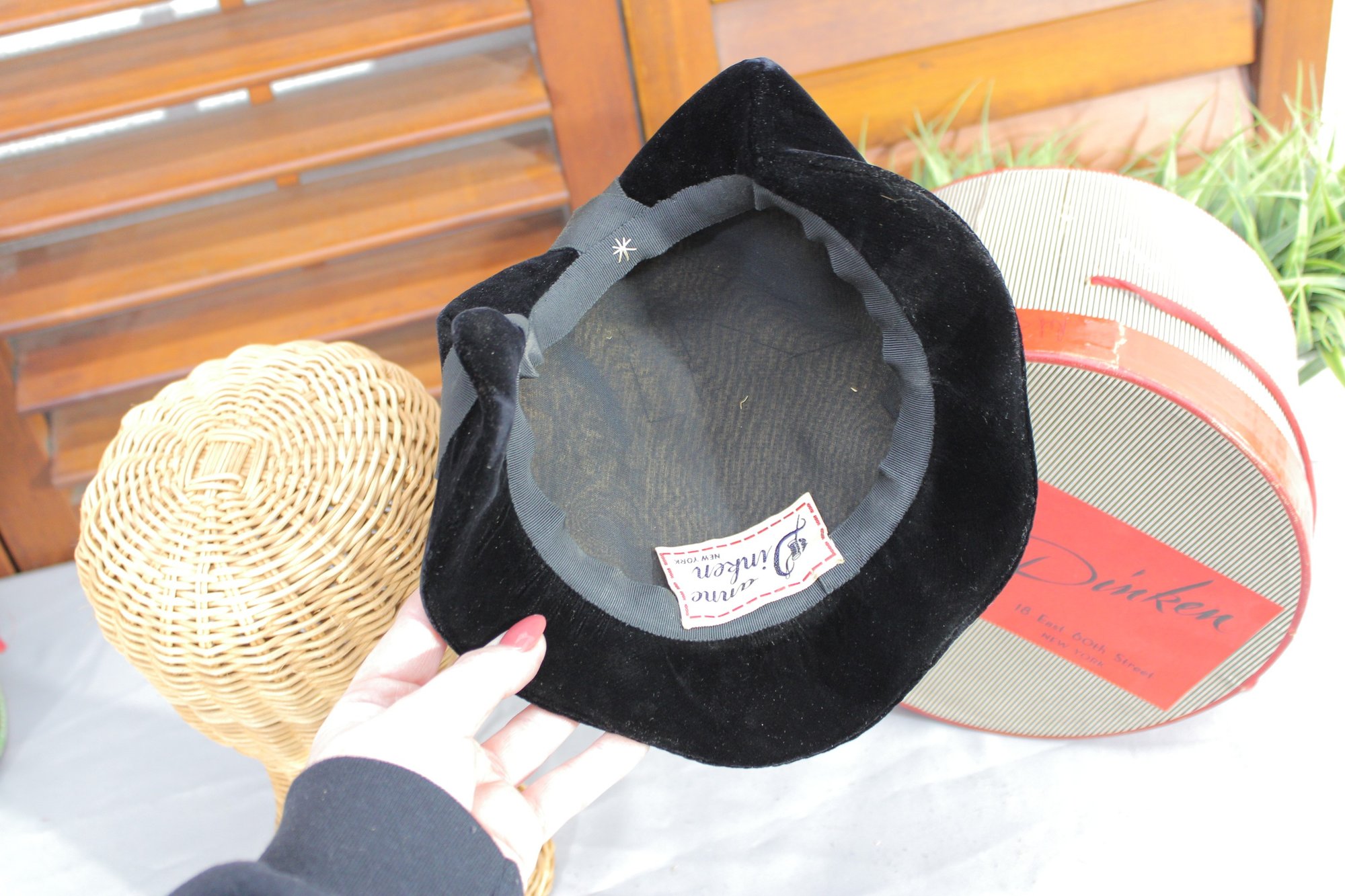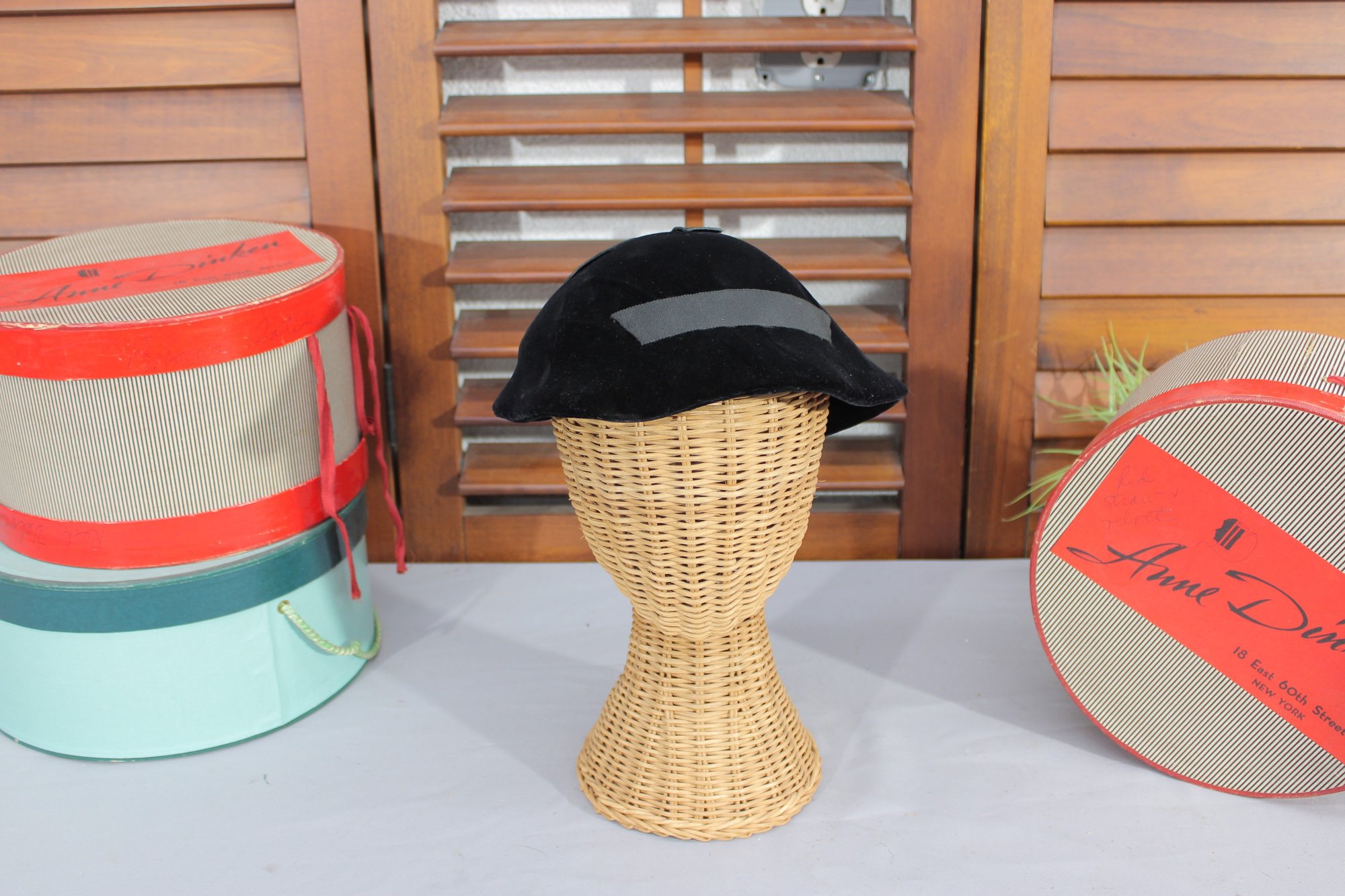 Classic vintage women’s velvet hat in timeless black, designed with a softly structured silhouette and subtle band detail. This elegant piece is labeled Anne Pinken – New York, reflecting quality craftsmanship and refined mid-century style.