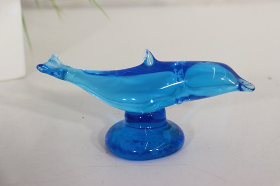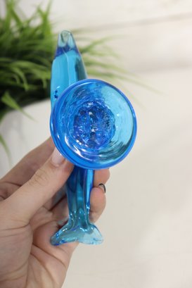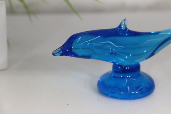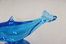 Beautiful vintage blue art glass dolphin sculpture. This piece features a vibrant blue tone with great clarity and a pedestal-style base. Nicely shaped with fluid lines and sculptural form – great Mid Century style look.
