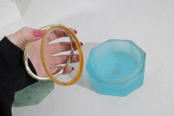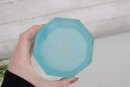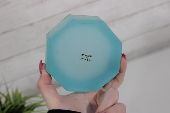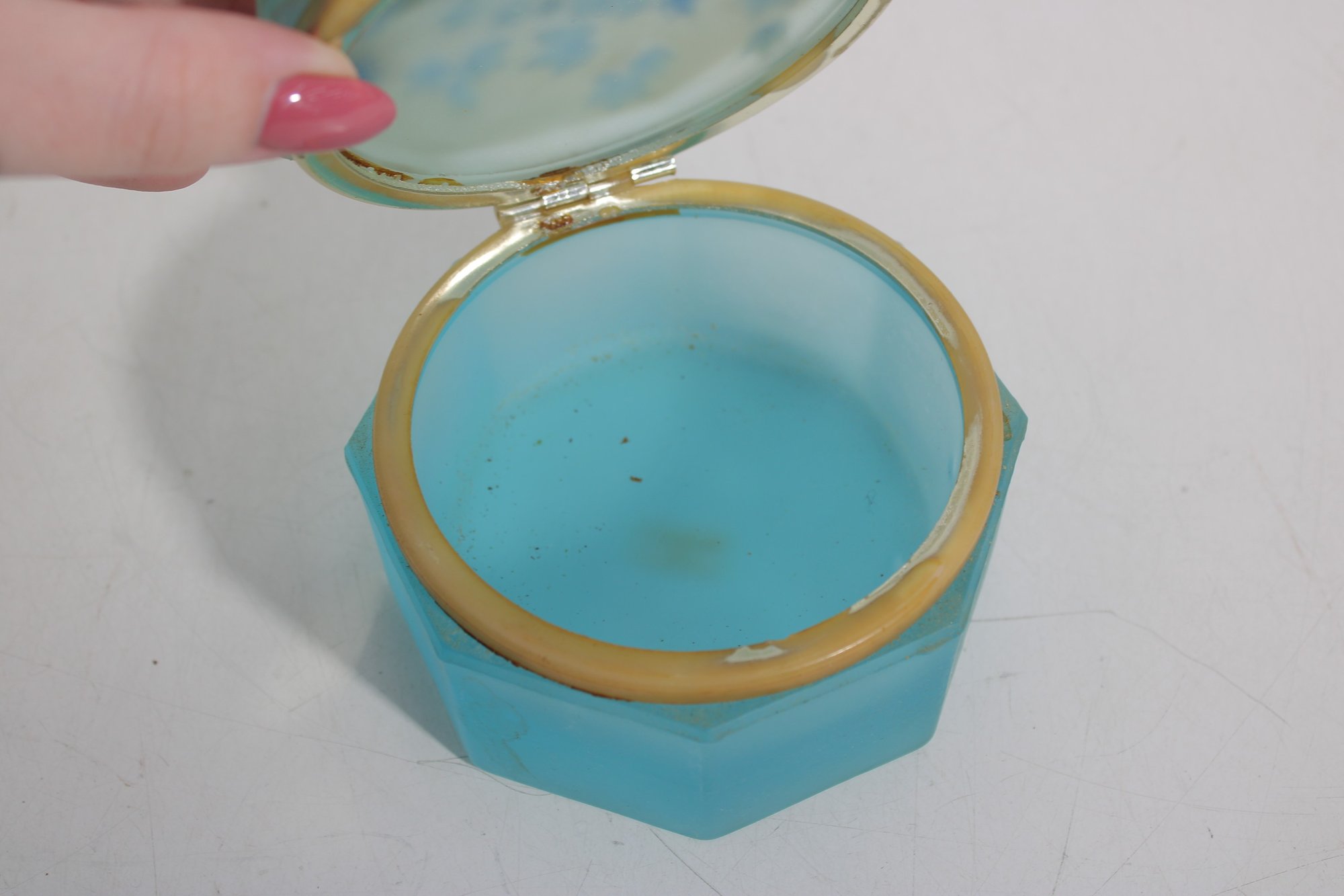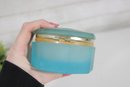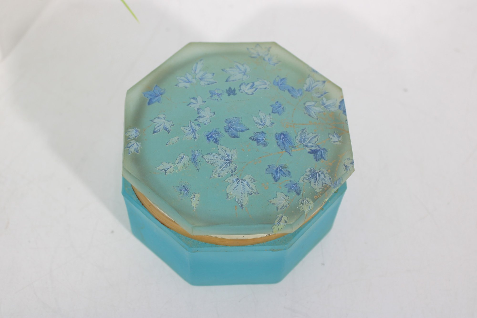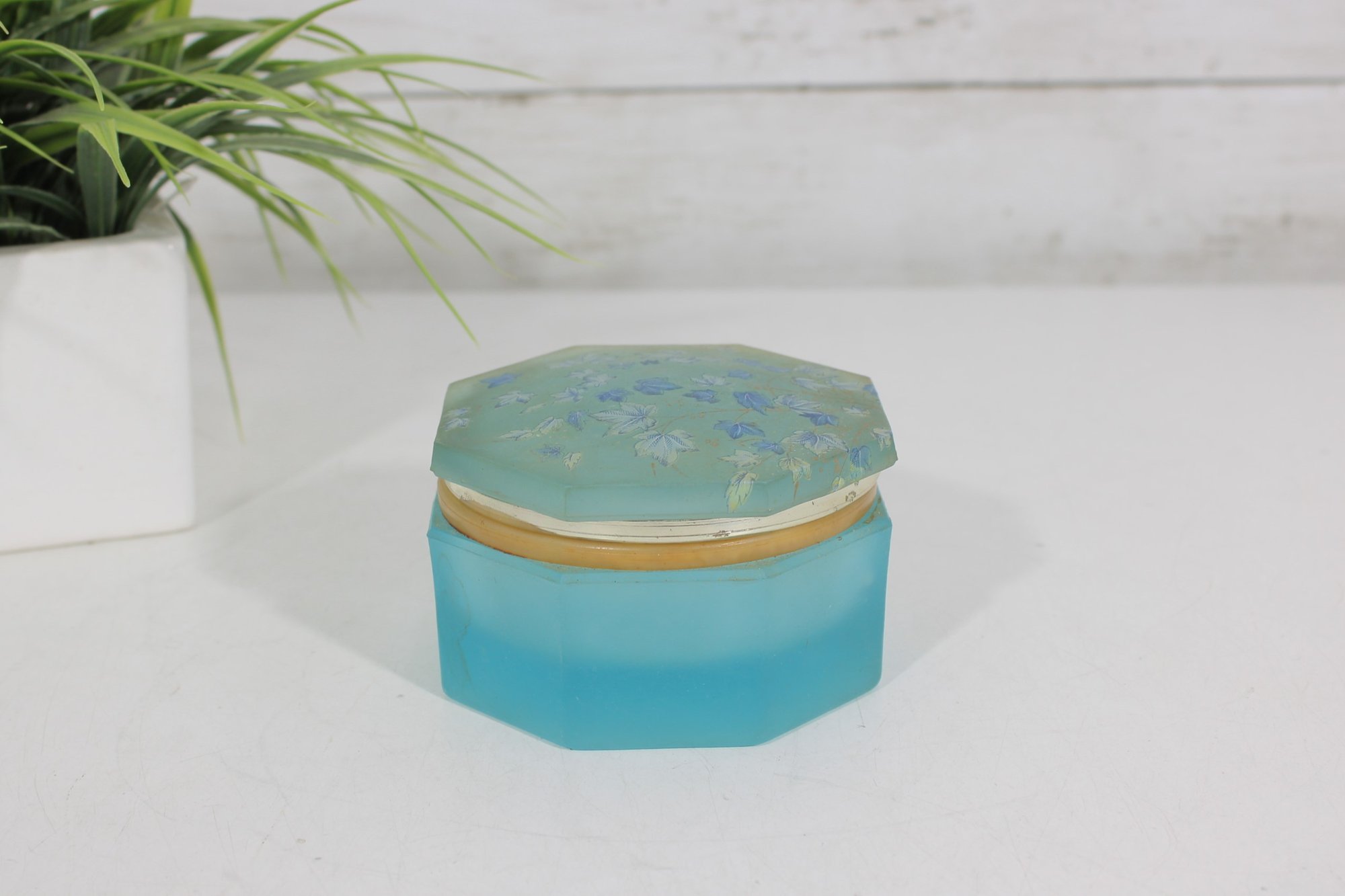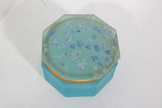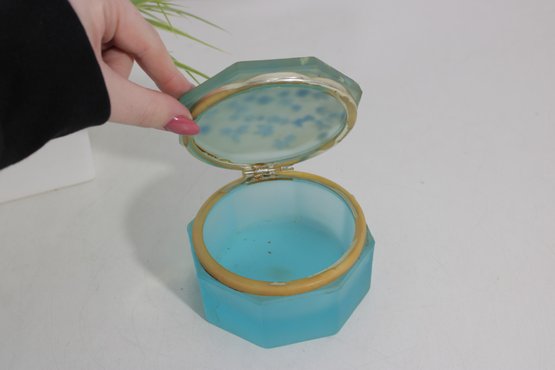 vintage frosted blue glass trinket box featuring an elegant octagonal form and a hinged lid. The box is crafted from satin-finished blue glass and accented with brass-tone mounts and hinge, giving it a refined decorative appearance.