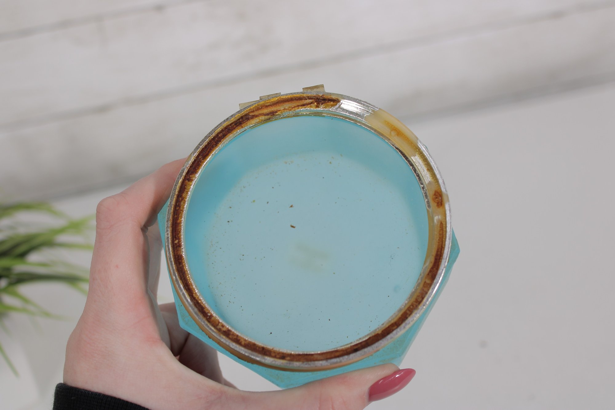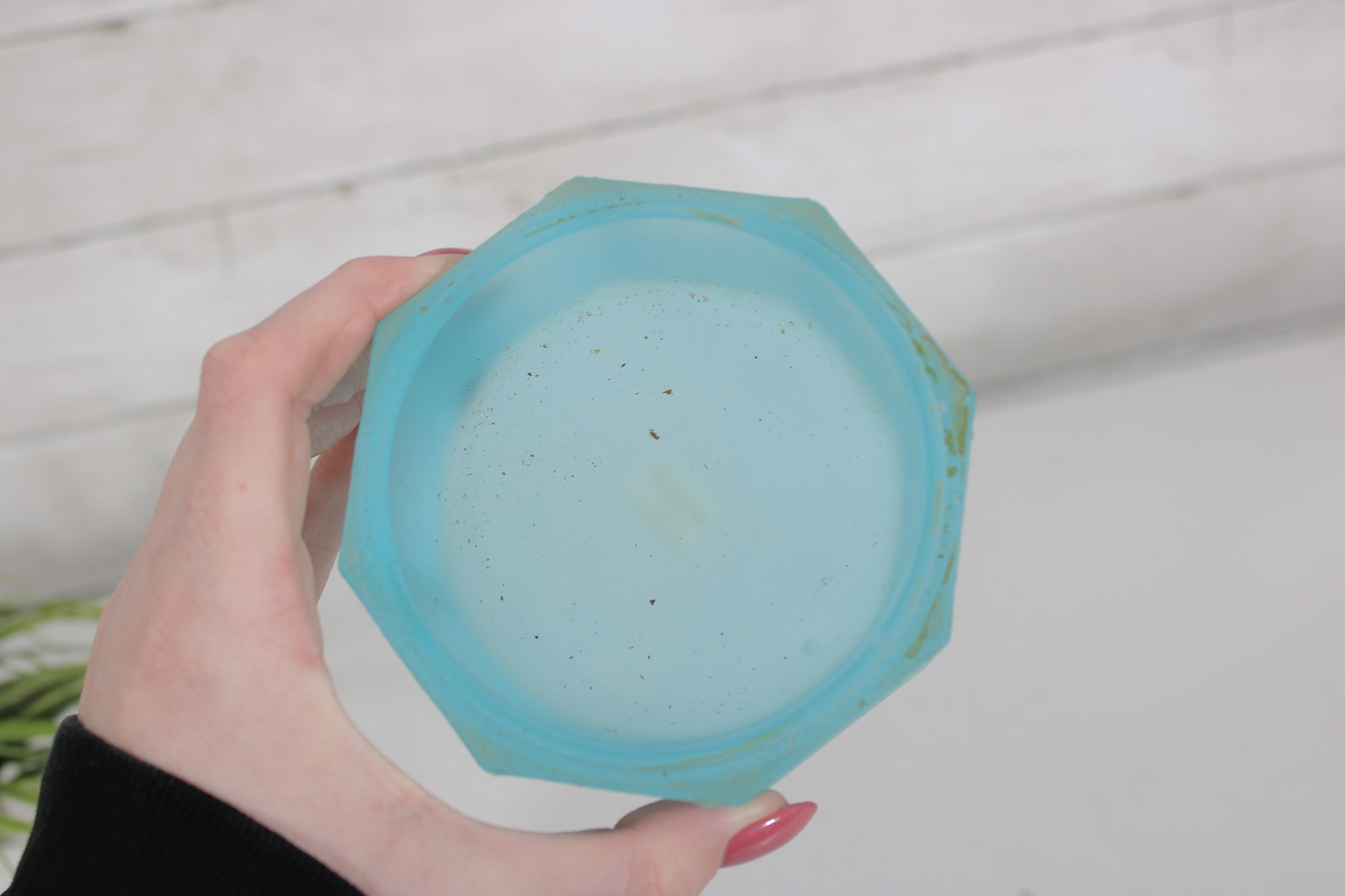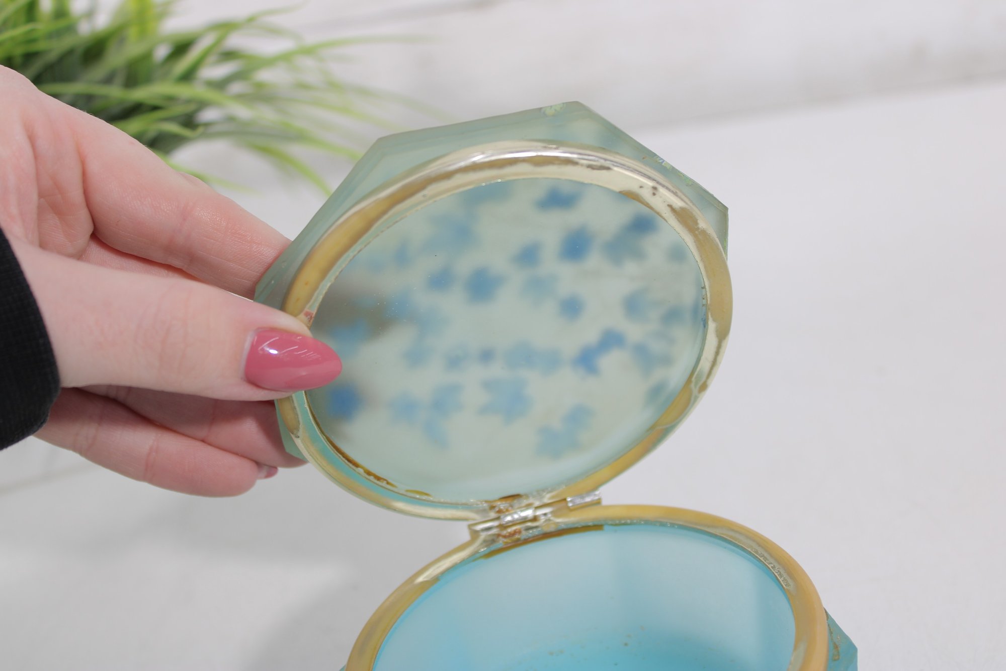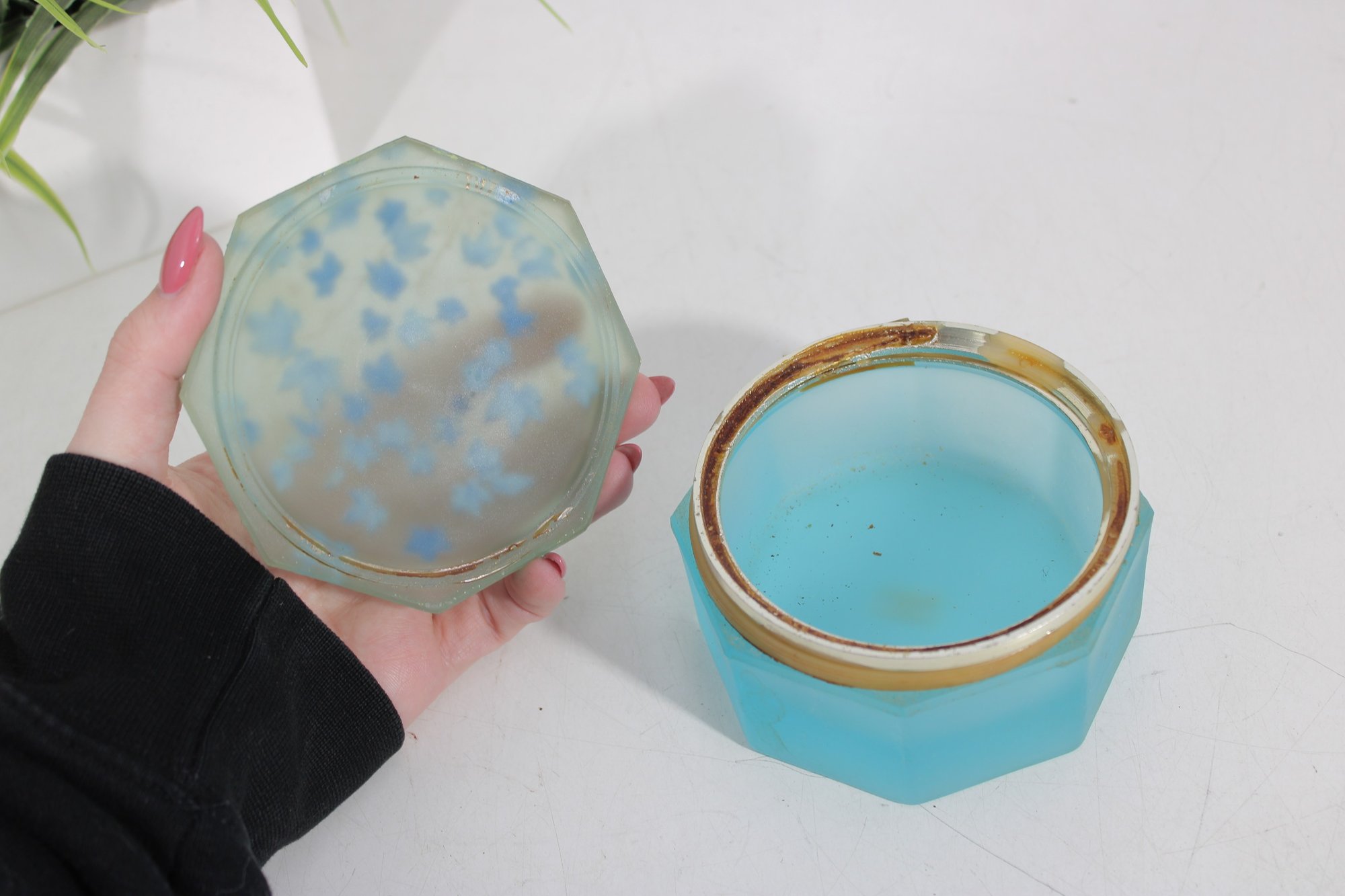 vintage frosted blue glass trinket box featuring an elegant octagonal form and a hinged lid. The box is crafted from satin-finished blue glass and accented with brass-tone mounts and hinge, giving it a refined decorative appearance.