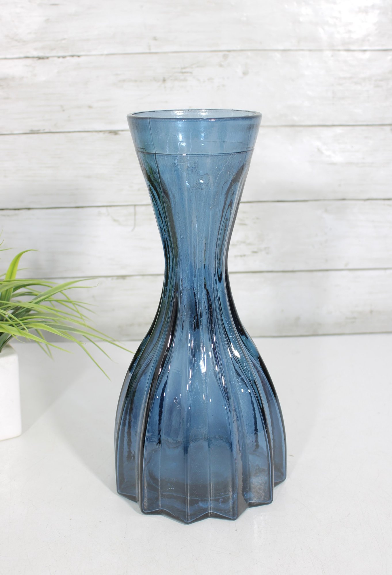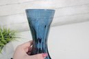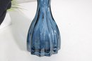 Beautiful vintage blue glass vase featuring an elegant elongated form with a narrow waist and flared rim. The lower portion showcases a fluted, scalloped design that adds texture and visual interest, while the smooth upper section creates a graceful silhouette.