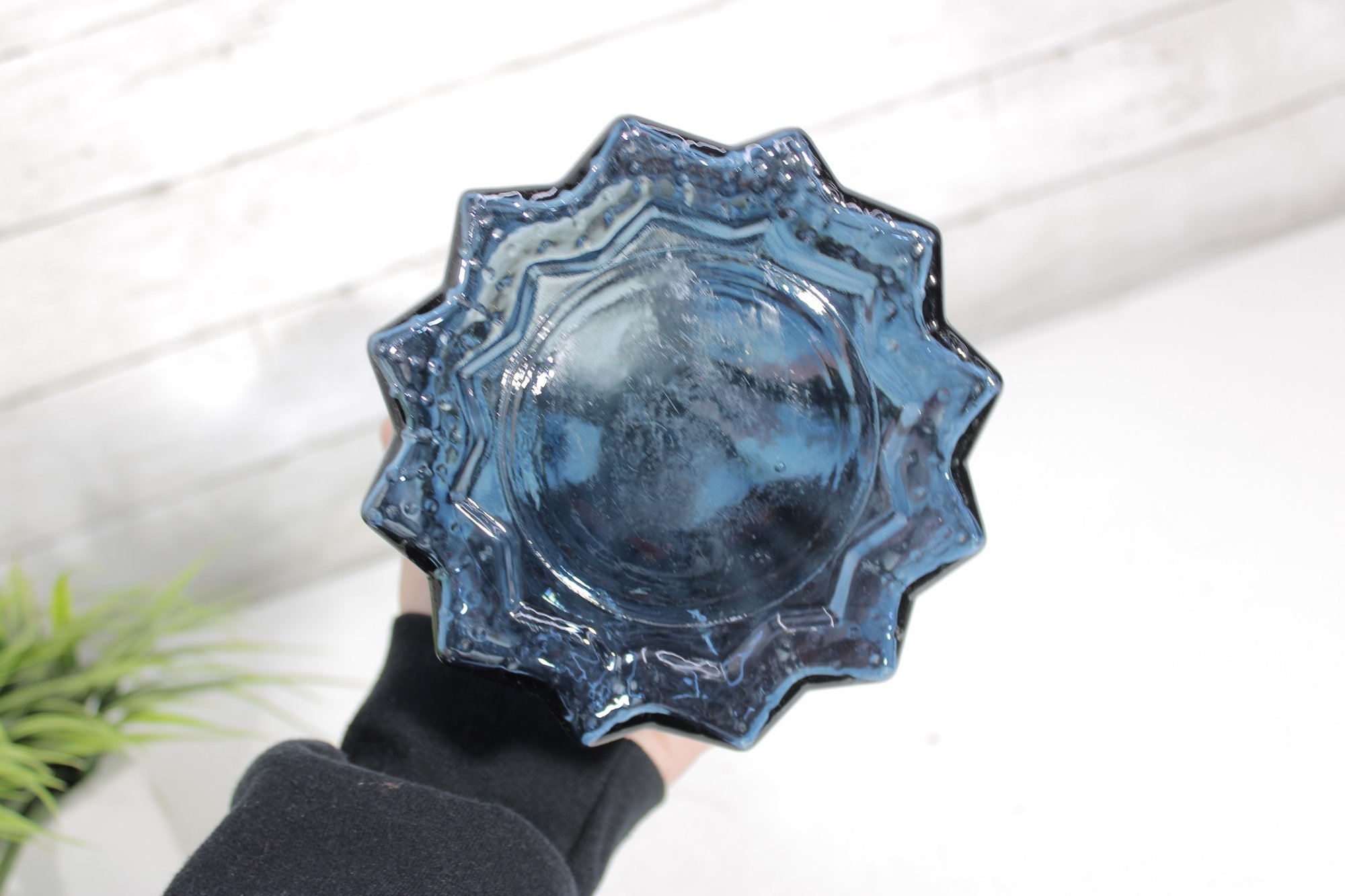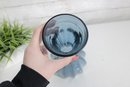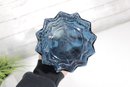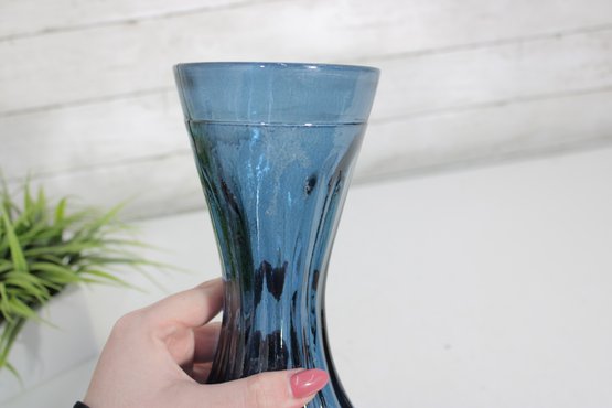 The rich blue tone catches the light nicely, making it a striking decorative piece whether displayed alone or with flowers. Its form is reminiscent of mid-century swung-style glass, adding to its vintage appeal.