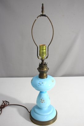 This charming vintage table lamp features a light blue glass body with delicate hand-painted floral motifs in soft pastel tones. The elegant brass accents and intricate crown detail on the socket add a touch of antique charm. Perfect for enhancing any space with a romantic and vintage aesthetic.