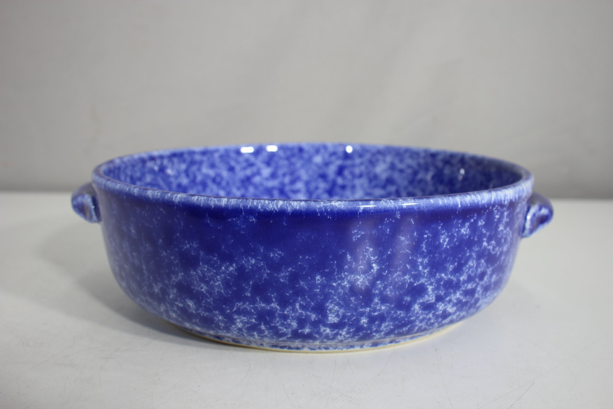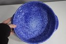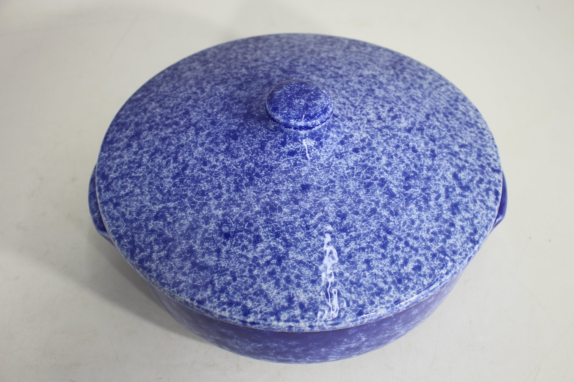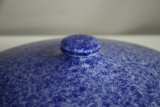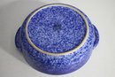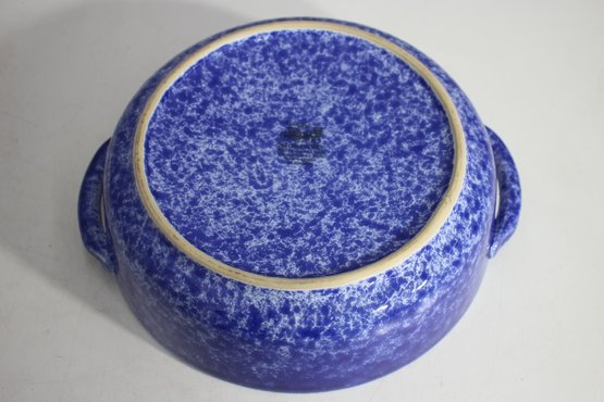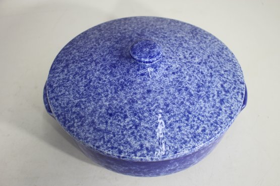 vintage touch to your kitchen with this beautiful blue spongeware covered casserole dish. Measuring approximately 9.5 inches in diameter, this ceramic dish features a striking speckled blue glaze and sturdy handles for easy carrying. The lid fits securely, making it perfect for baking, serving, or displaying.