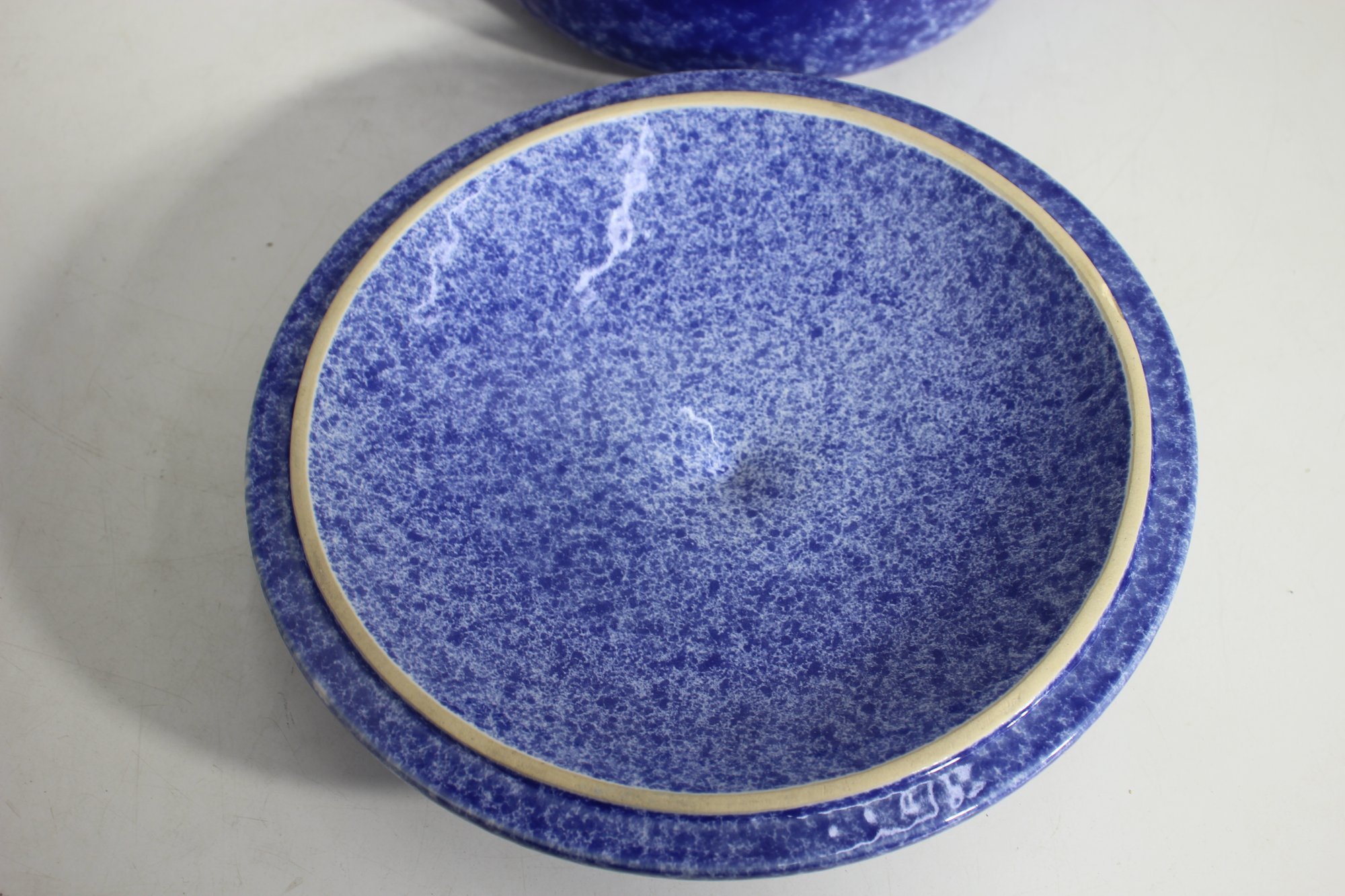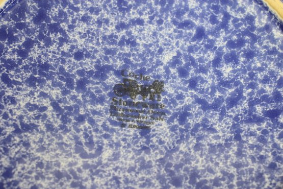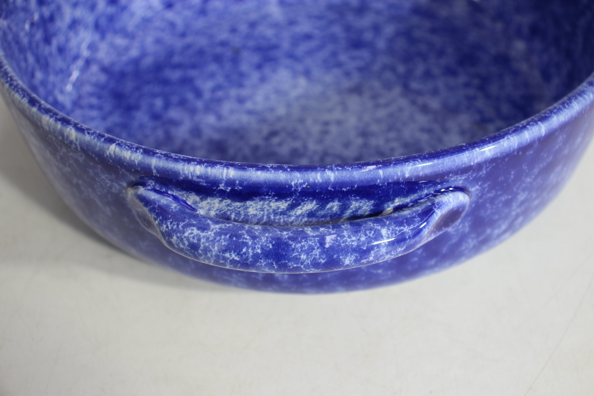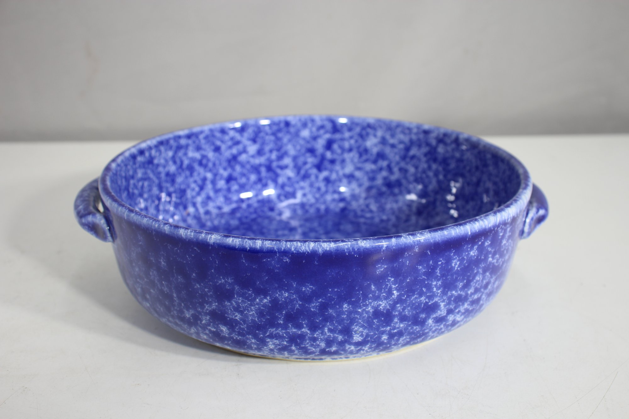 vintage touch to your kitchen with this beautiful blue spongeware covered casserole dish. Measuring approximately 9.5 inches in diameter, this ceramic dish features a striking speckled blue glaze and sturdy handles for easy carrying. The lid fits securely, making it perfect for baking, serving, or displaying.