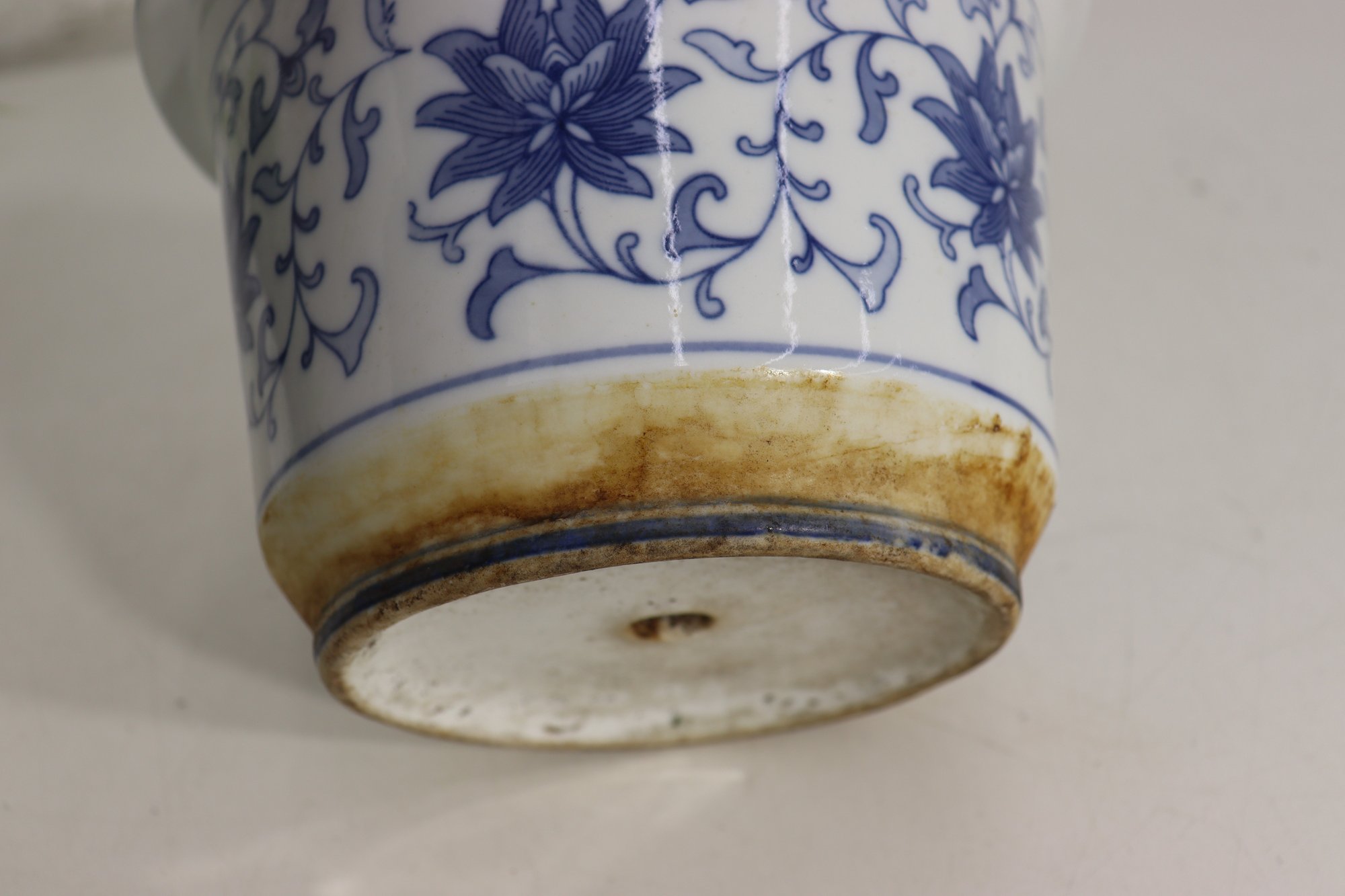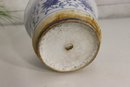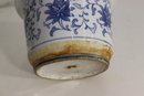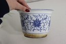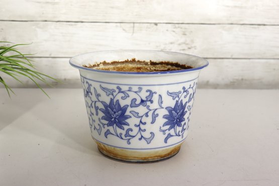 Charming vintage blue and white ceramic planter pot, measuring approximately 5.5 inches high and 8 inches in diameter. This piece features a beautiful hand-painted floral and vine design in deep cobalt blue on a soft white background, showcasing classic Asian decorative influence.