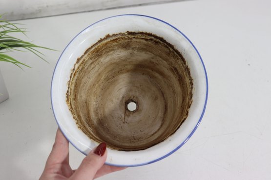 The pot includes a drainage hole at the bottom, making it ideal for real or artificial plants. Natural wear and discoloration along the rim and interior give it a lovely, authentic aged patina that adds to its rustic charm.
