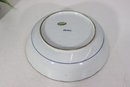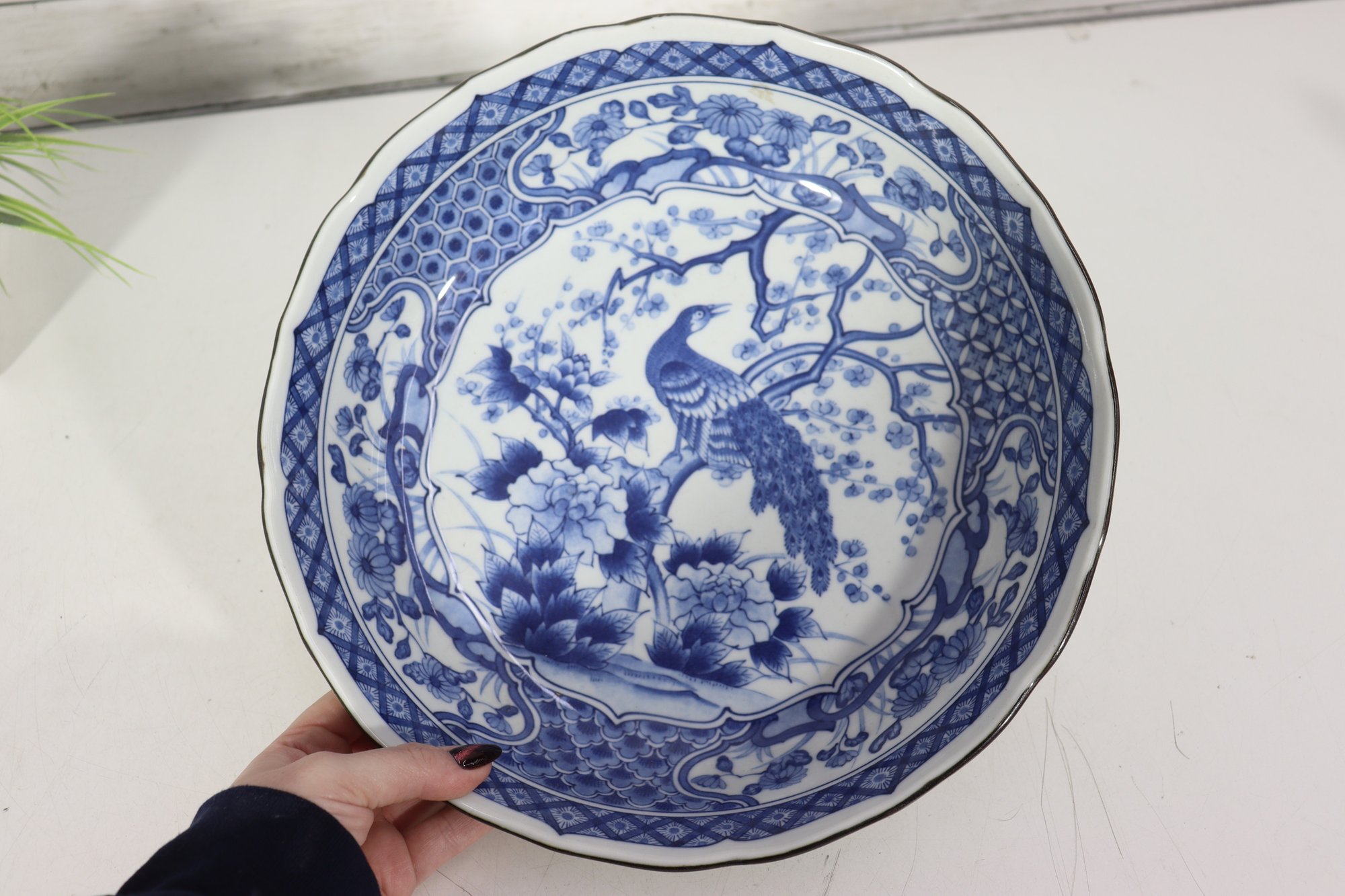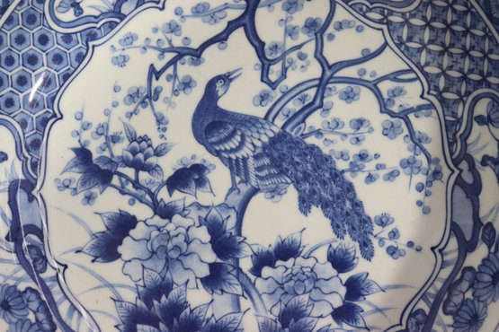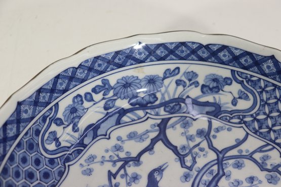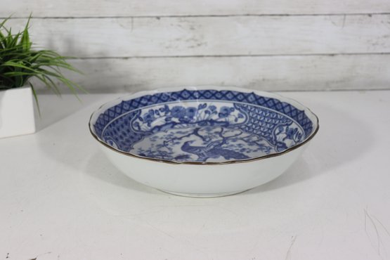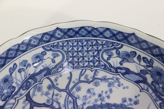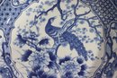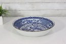 vintage blue and white porcelain bowl measuring approximately 12.5 inches in diameter. This elegant piece features a classic Asian-inspired design, with intricate floral motifs and a scenic landscape pattern in rich cobalt blue.