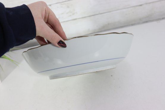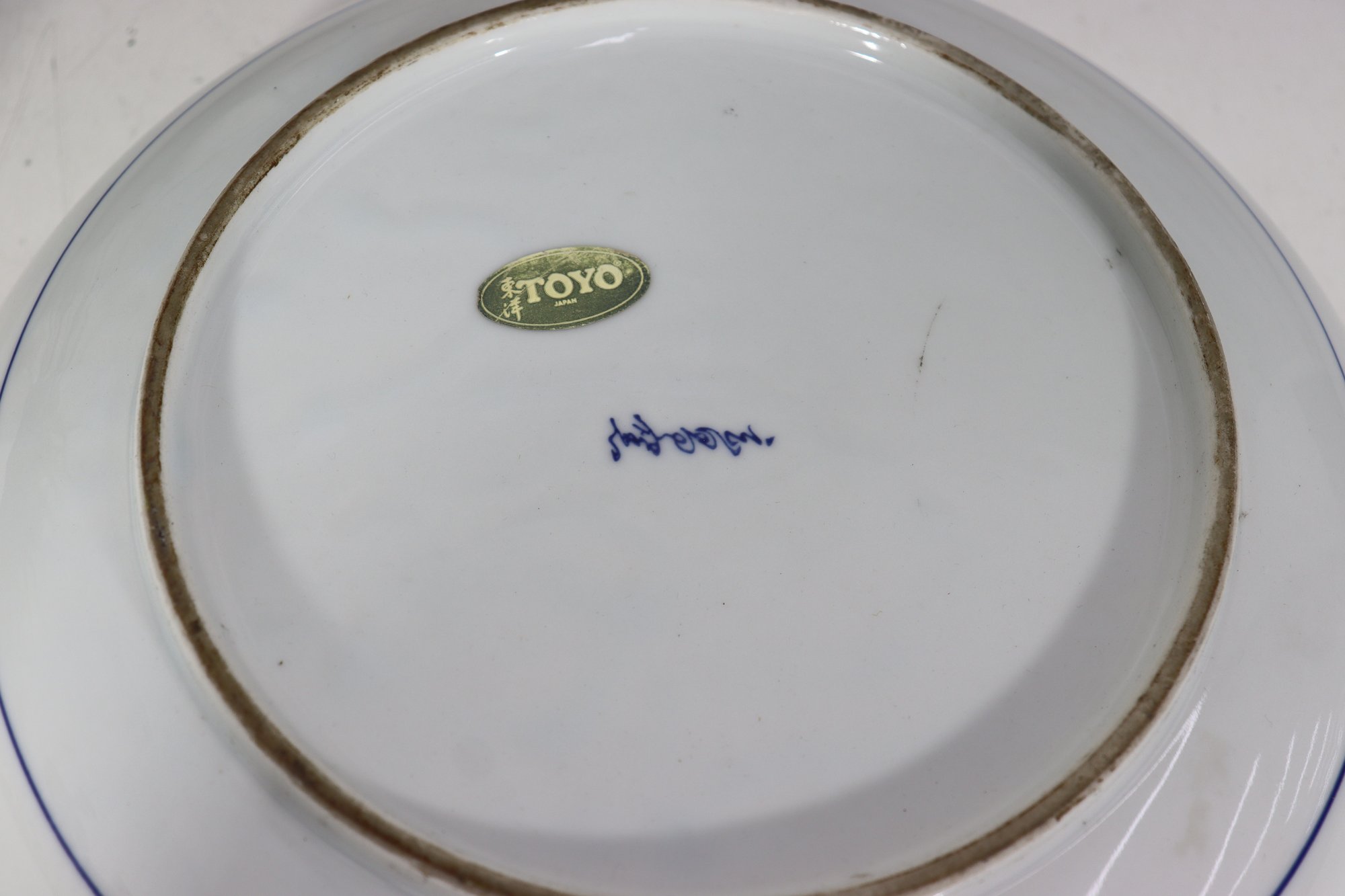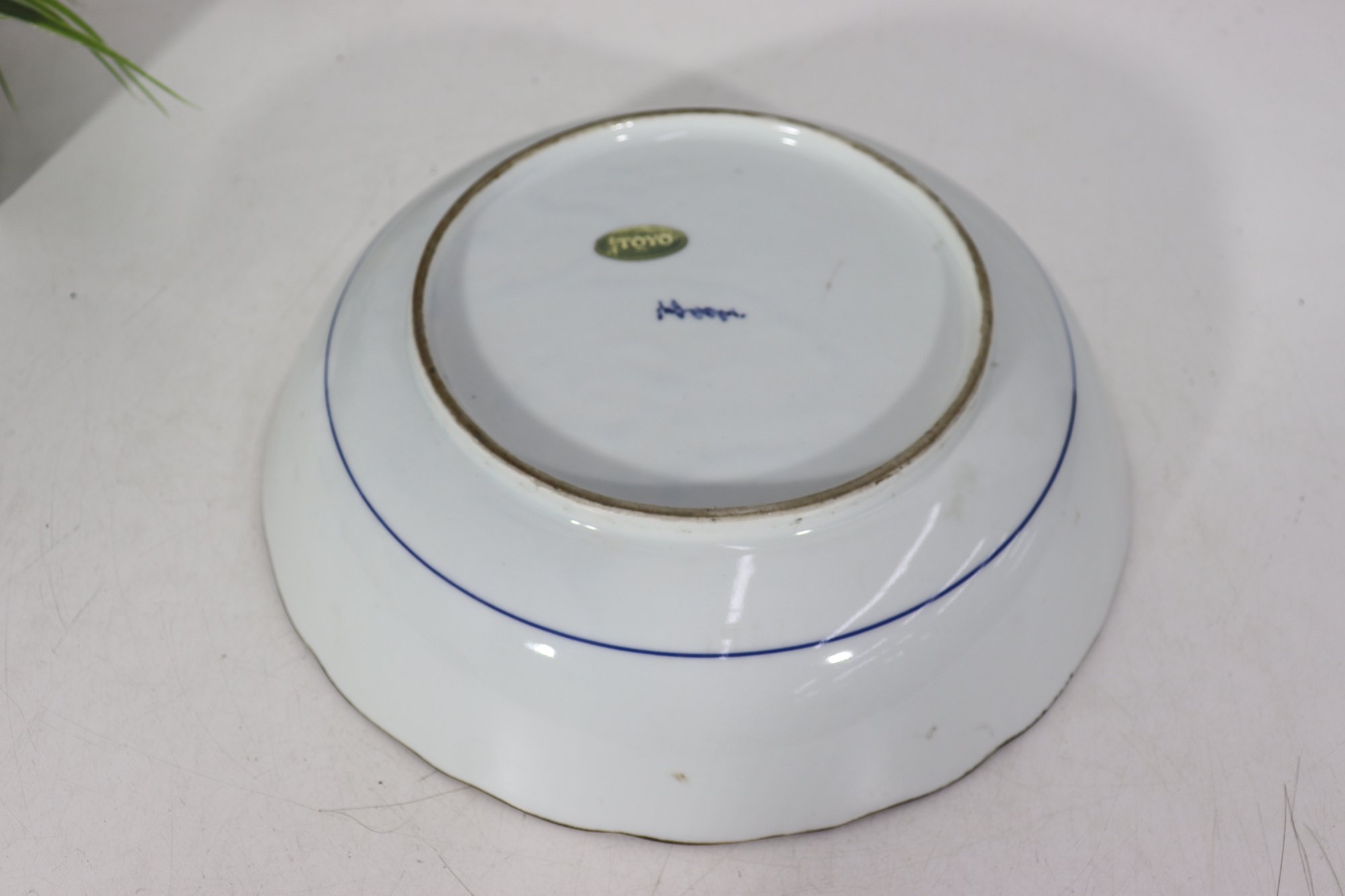 The bowl has a gently scalloped rim and detailed border work, making it an excellent decorative accent or serving piece. The underside bears a Toyo sticker and blue mark, adding to its collectible appeal.