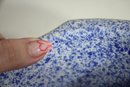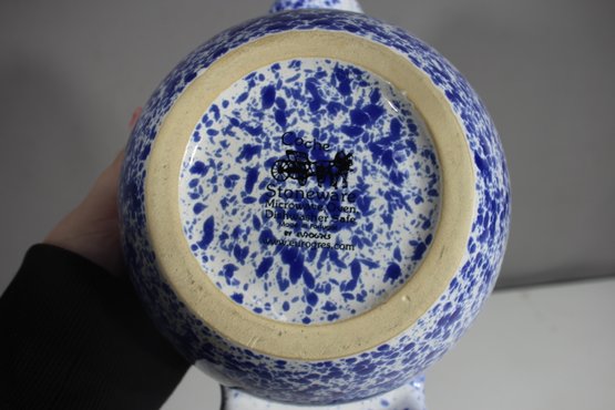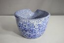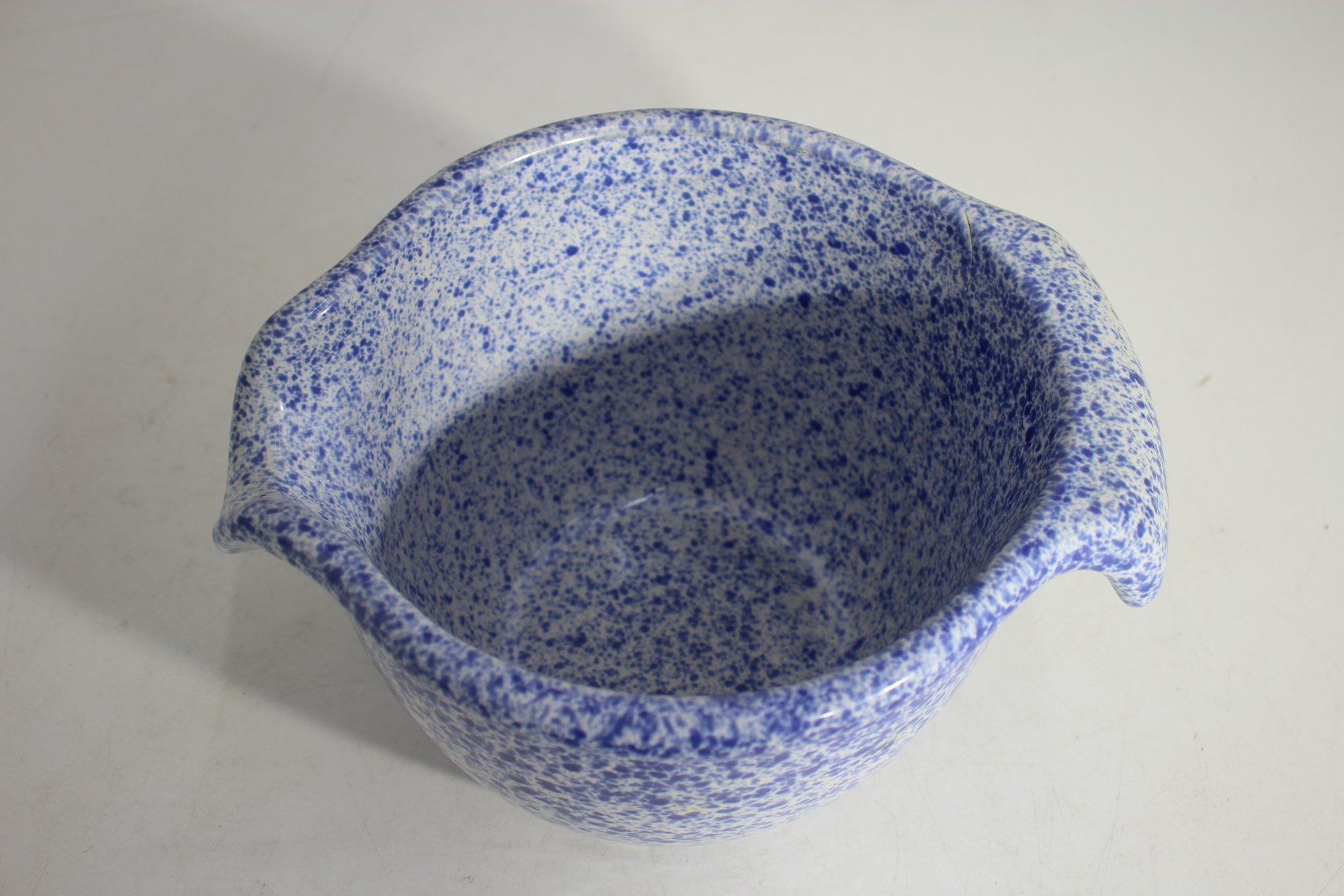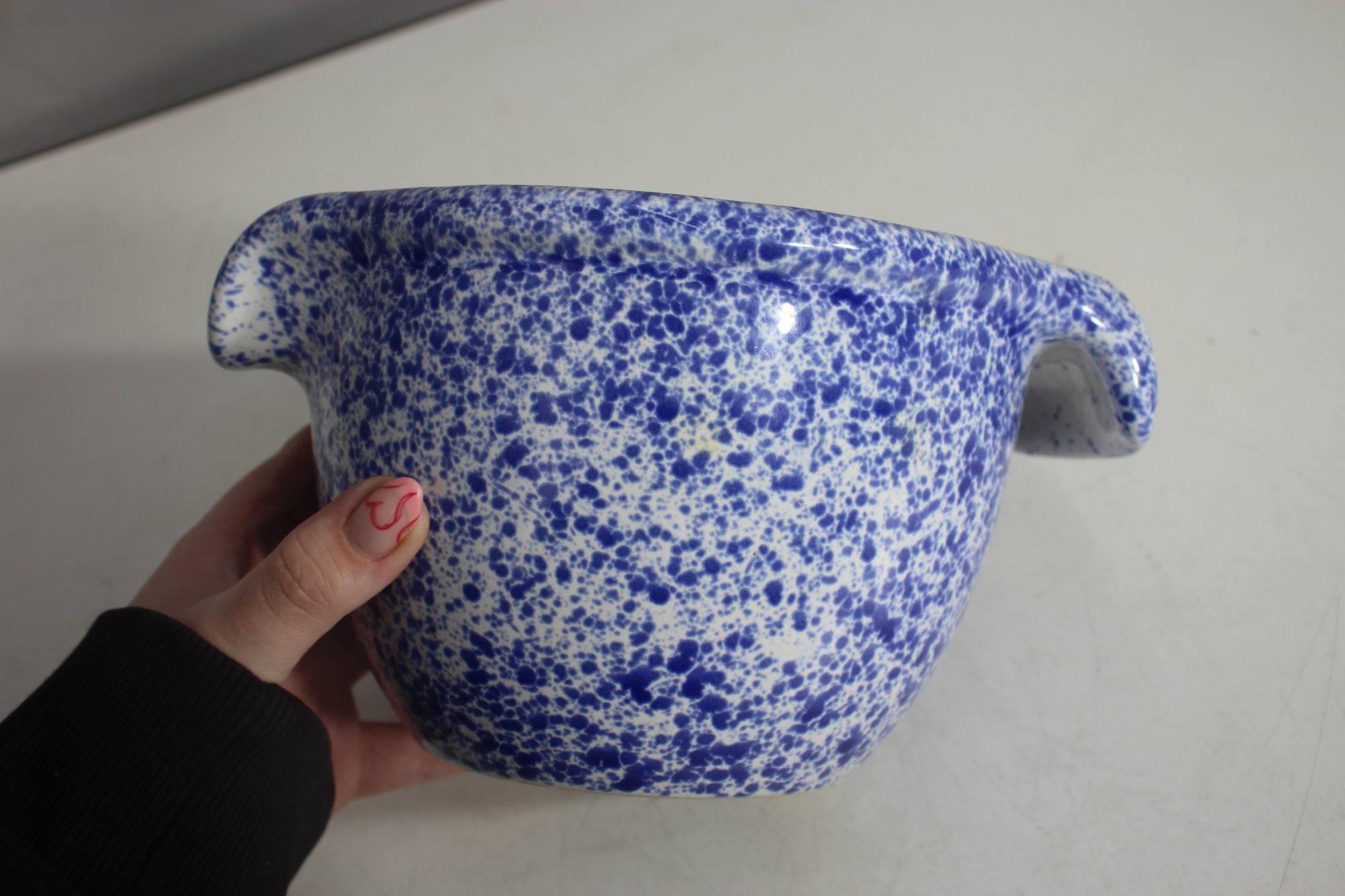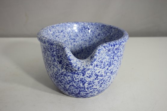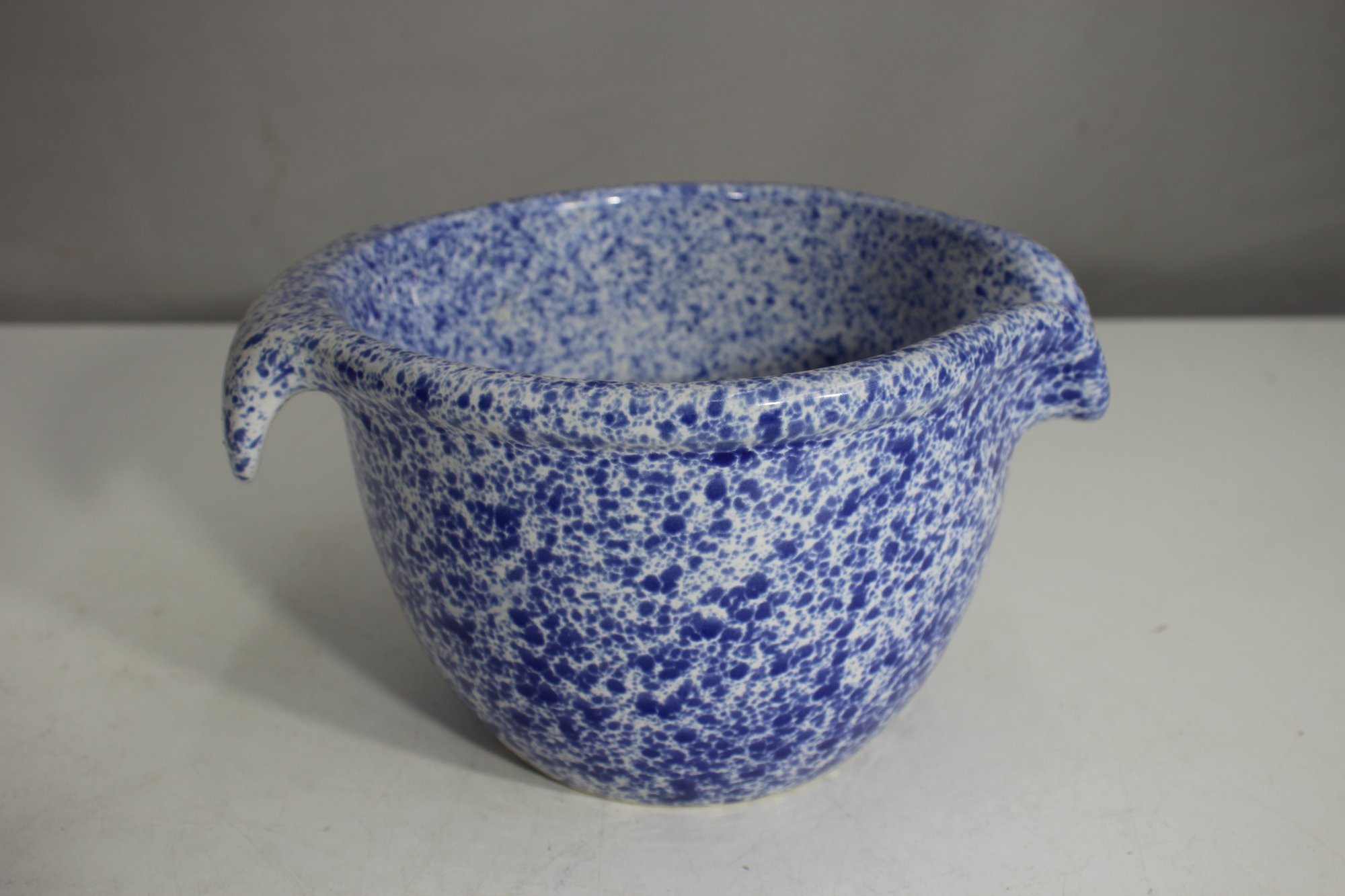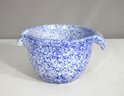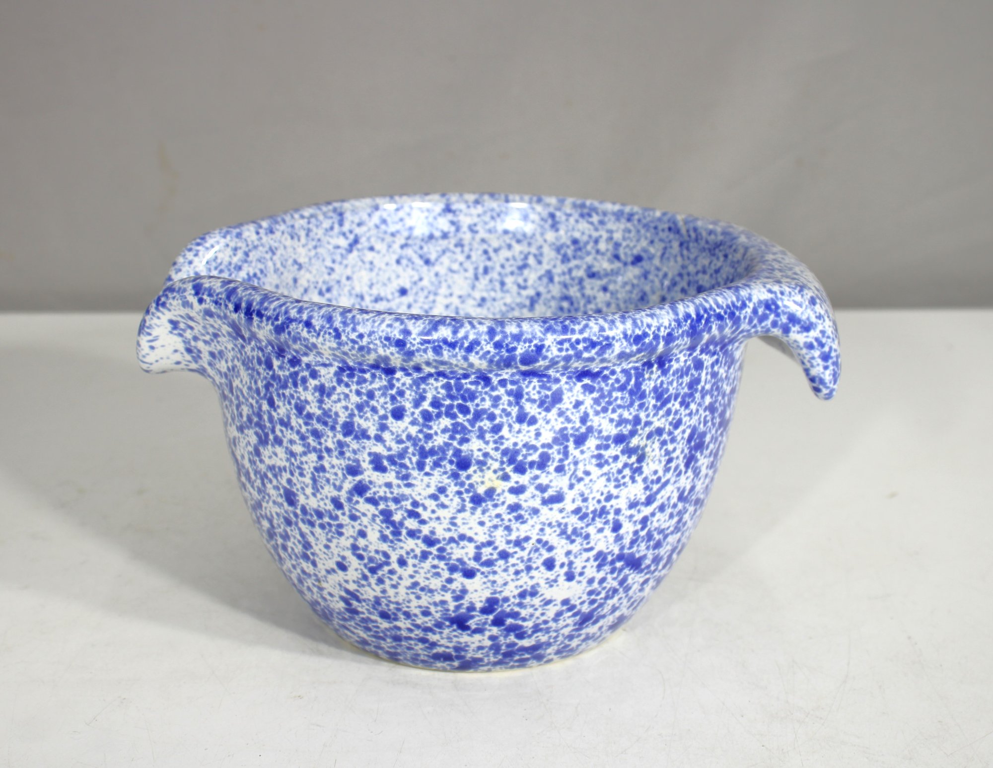 vintage touch to your kitchen with this classic blue and white stoneware mixing bowl. Measuring 5 inches in height and 7 inches in diameter, this ceramic piece features a double-pour spout design, making it both functional and stylish. The speckled glaze finish adds rustic appeal, while the marked bottom ensures authenticity. A perfect addition for collectors of farmhouse-style pottery or functional vintage kitchenware.