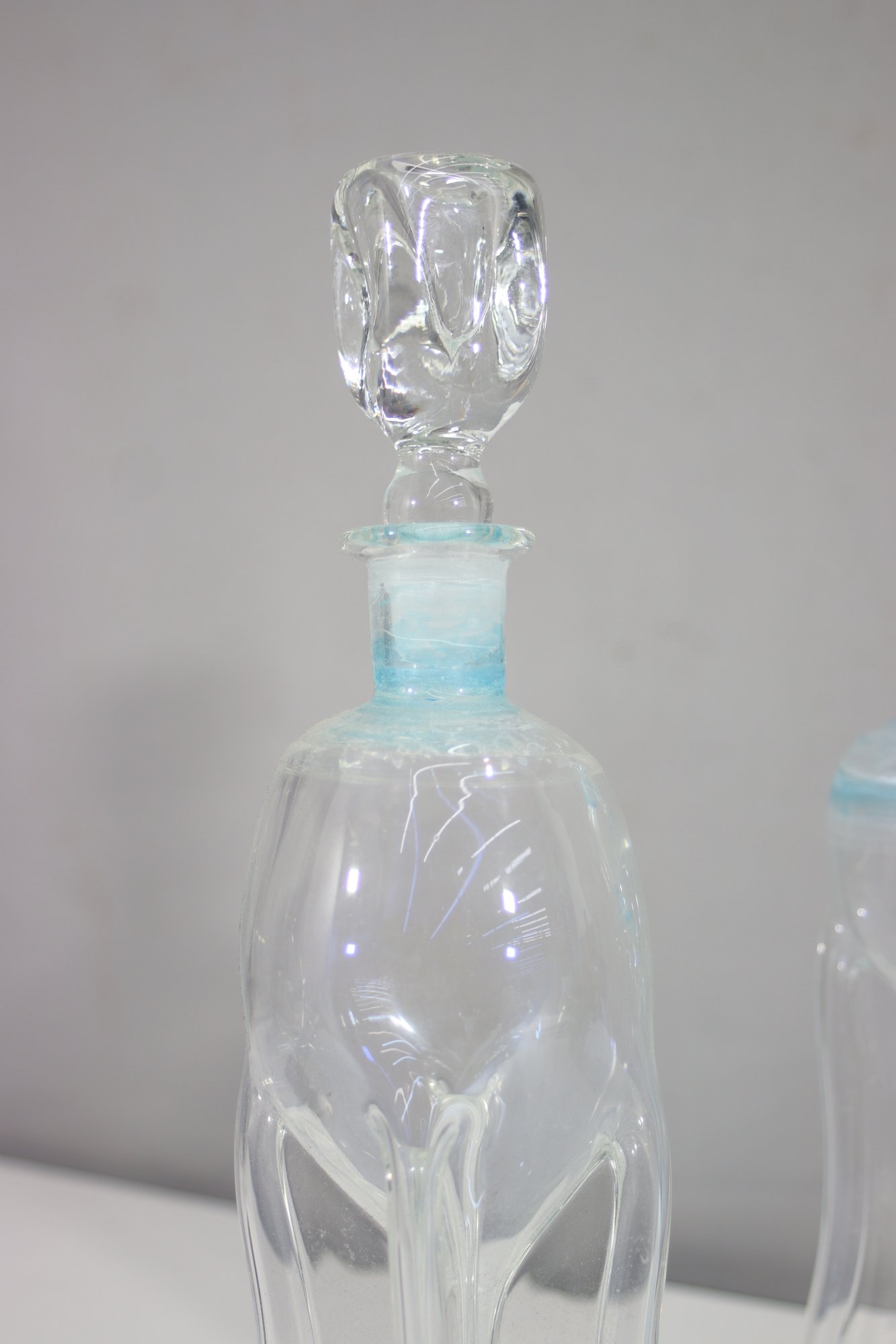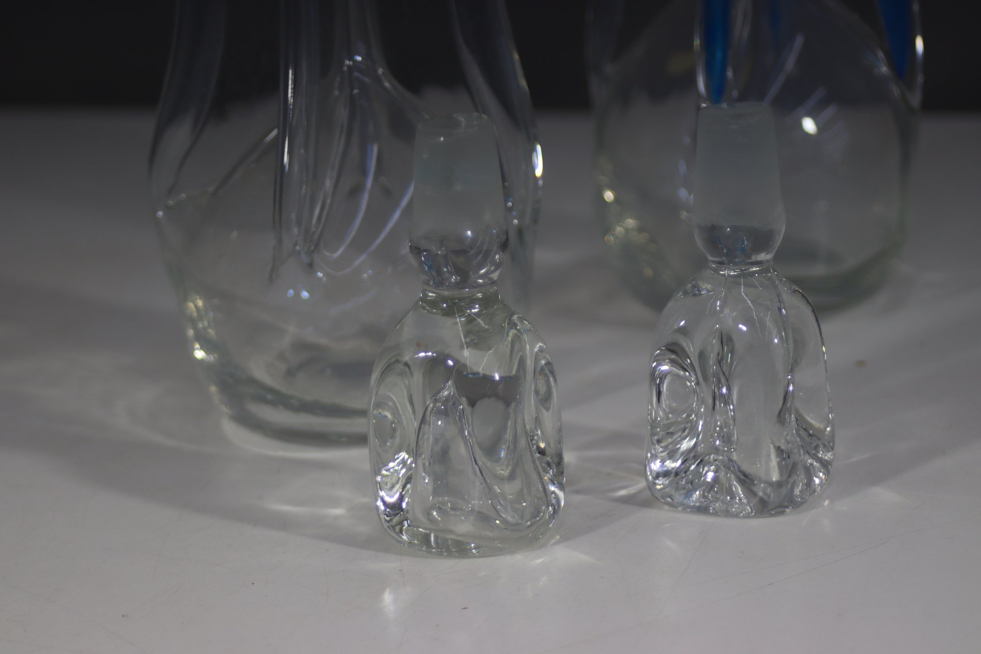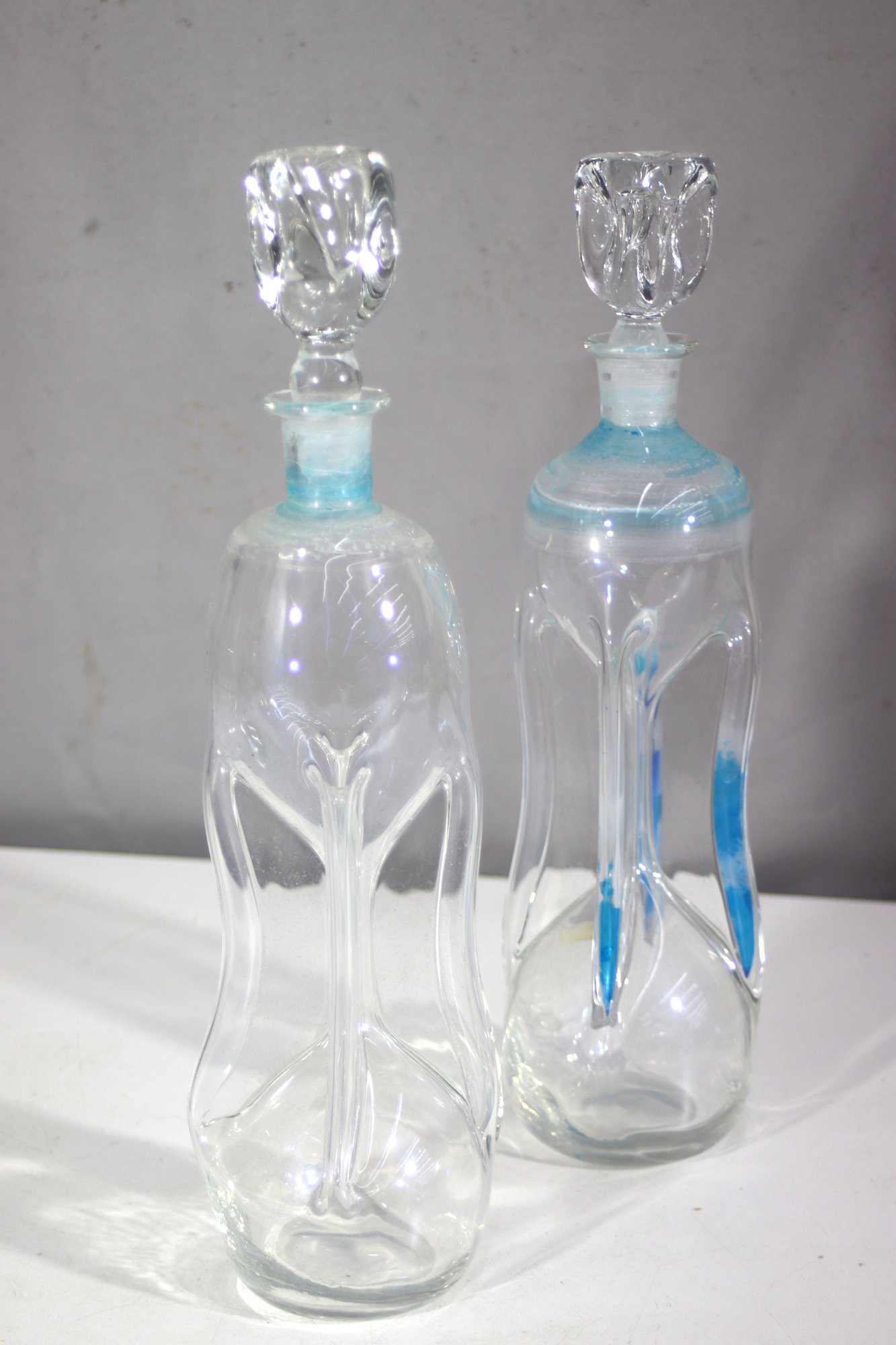 pair of vintage glass decanters, crafted by Boda Sweden, showcases exquisite Scandinavian artistry. Each decanter features a unique sculptural design with flowing curves, a striking clear glass body, and delicate blue accents. The intricate crystal stoppers add a refined touch, making these pieces ideal for collectors or as sophisticated barware. These decanters blend form and function, embodying timeless mid-century modern design. Perfect for display or use, they add a touch of Swedish craftsmanship to any setting.
