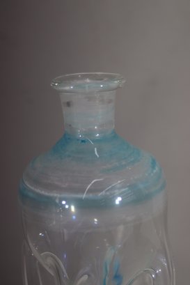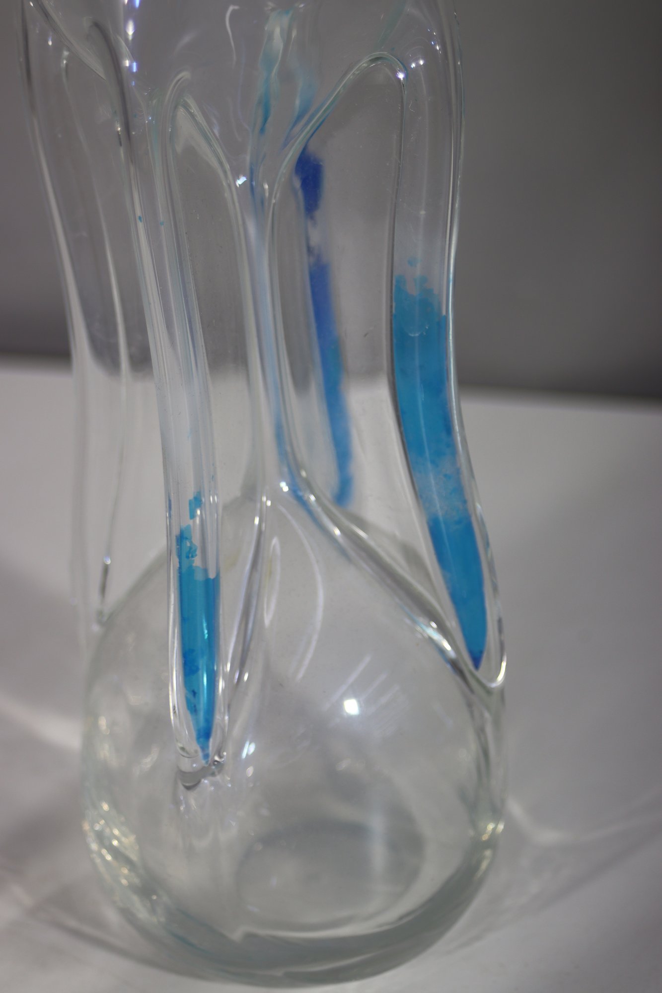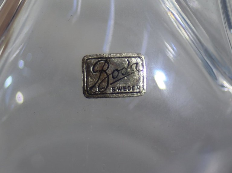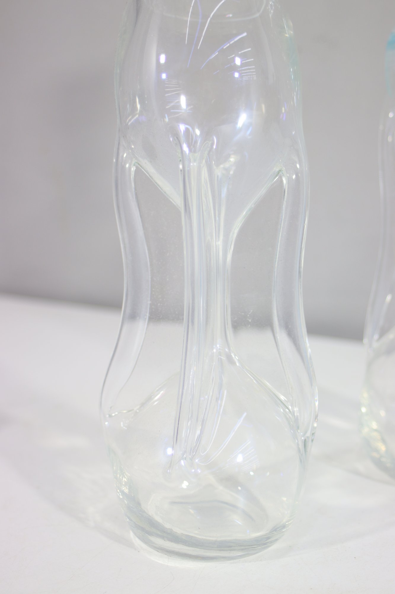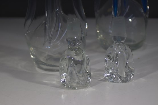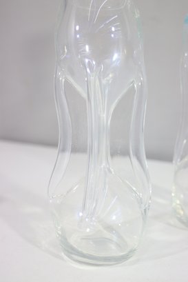 pair of vintage glass decanters, crafted by Boda Sweden, showcases exquisite Scandinavian artistry. Each decanter features a unique sculptural design with flowing curves, a striking clear glass body, and delicate blue accents. The intricate crystal stoppers add a refined touch, making these pieces ideal for collectors or as sophisticated barware. These decanters blend form and function, embodying timeless mid-century modern design. Perfect for display or use, they add a touch of Swedish craftsmanship to any setting.