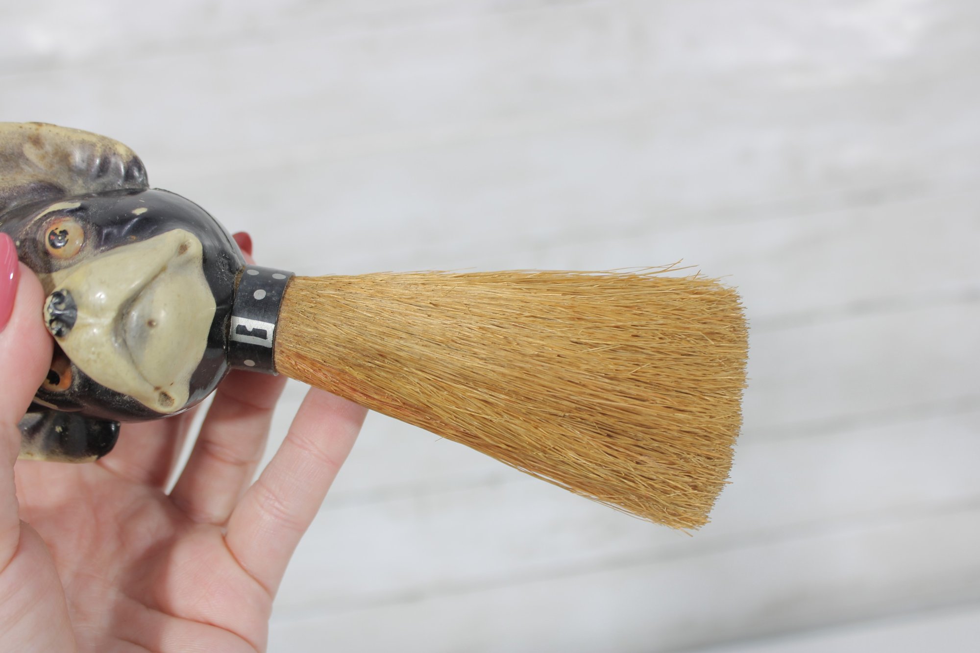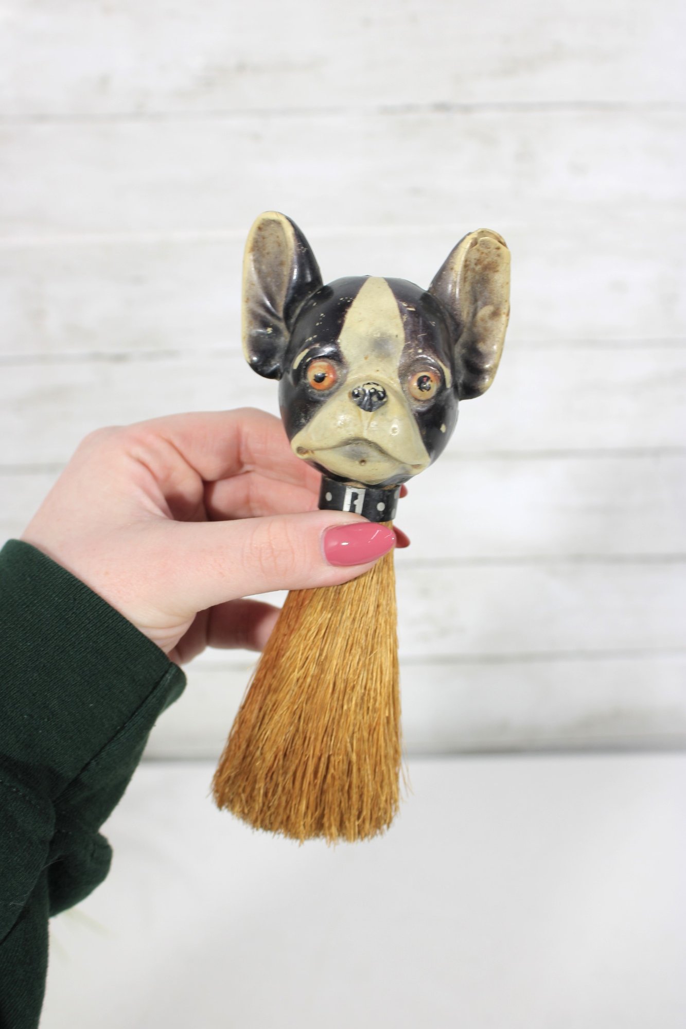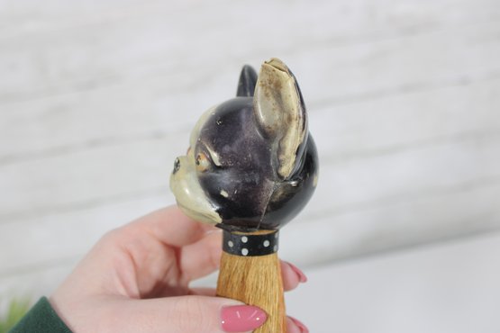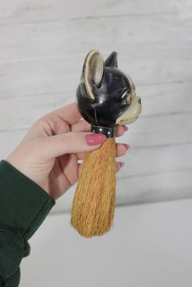 vintage figural brush featuring a Boston Terrier dog head handle, measuring approximately 7 inches long. The handle is crafted as a detailed dog head with expressive eyes, upright ears, and a painted collar, giving the piece plenty of character.