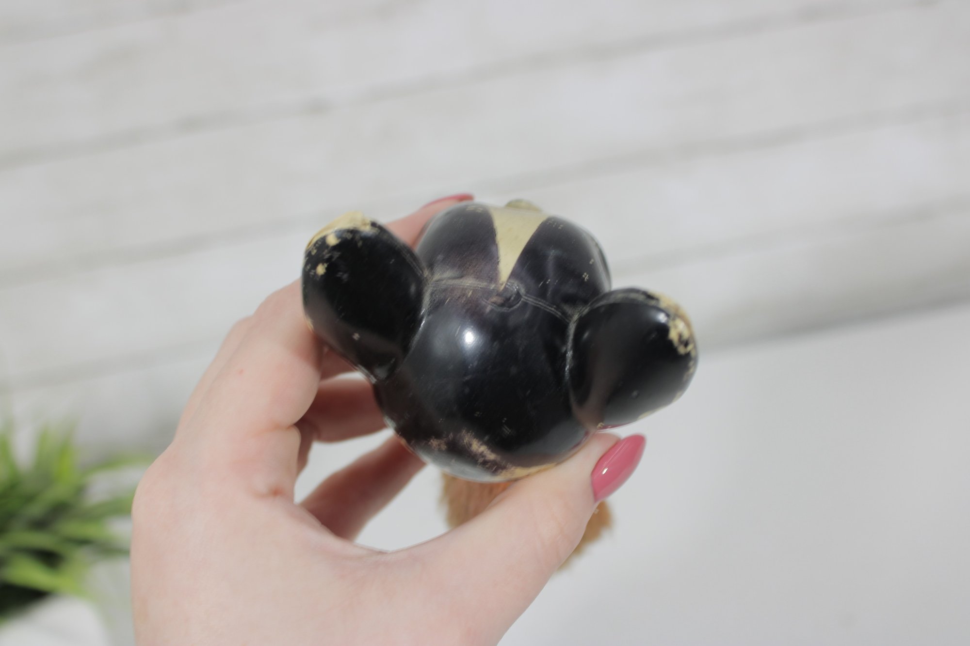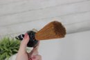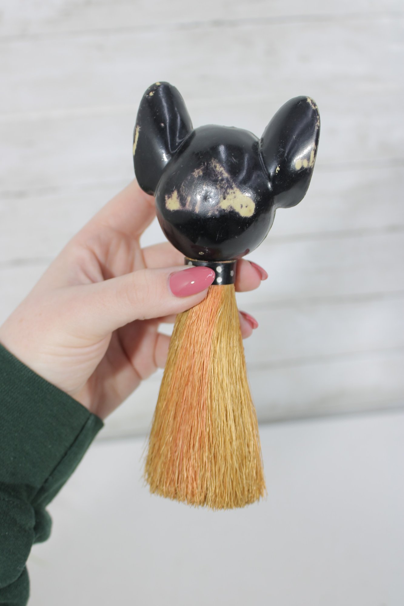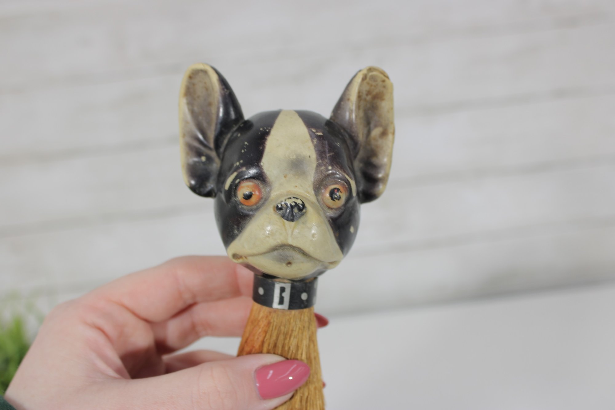 vintage figural brush featuring a Boston Terrier dog head handle, measuring approximately 7 inches long. The handle is crafted as a detailed dog head with expressive eyes, upright ears, and a painted collar, giving the piece plenty of character.