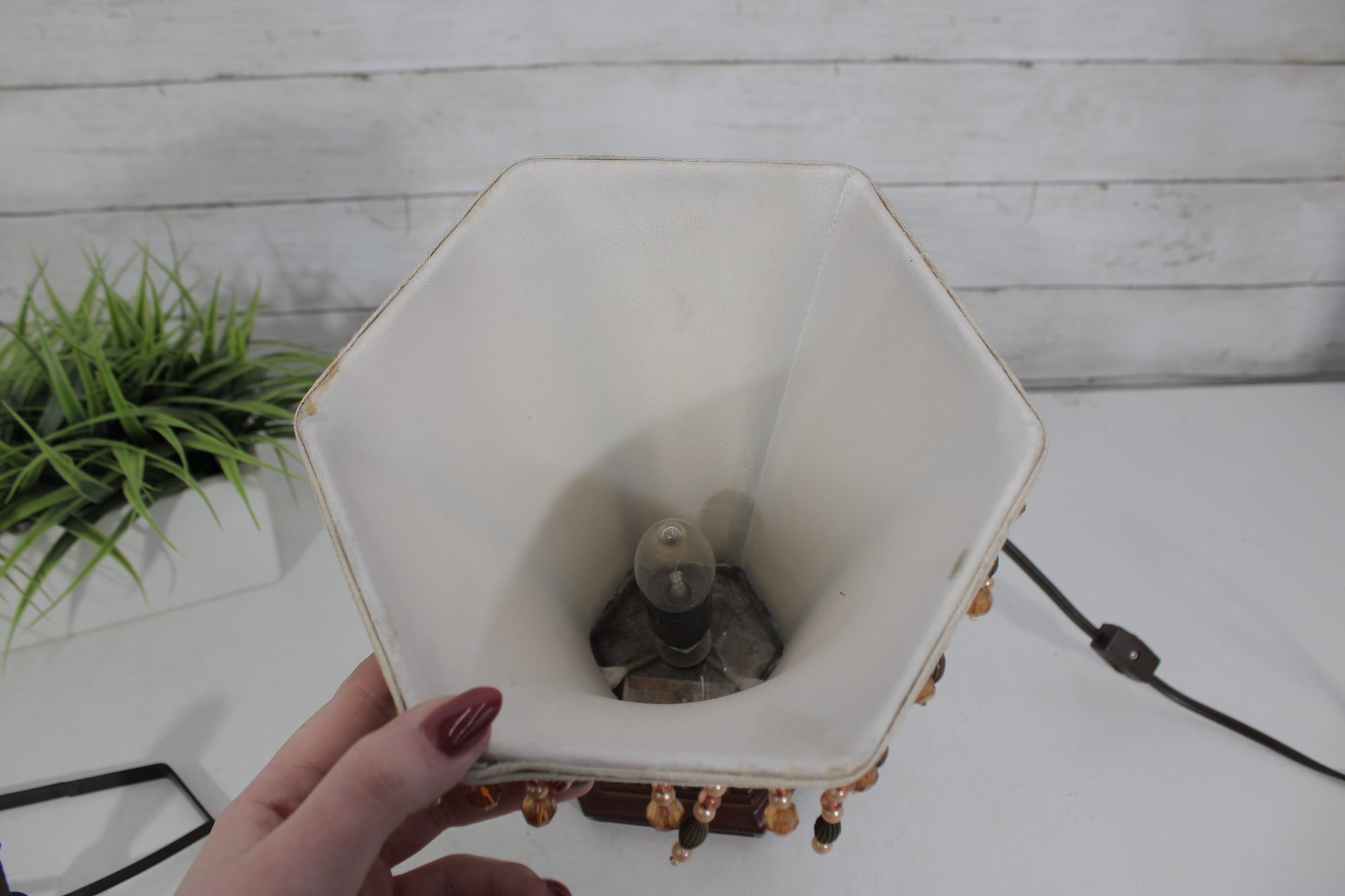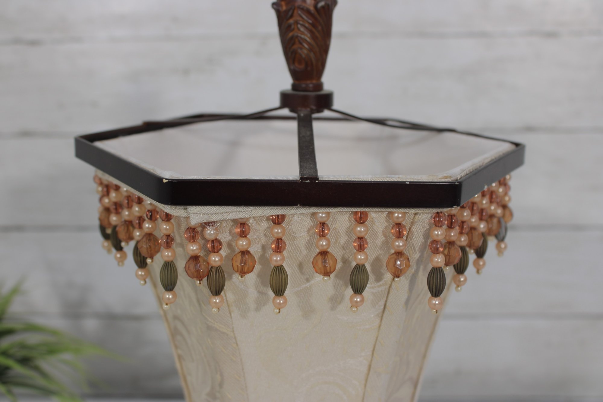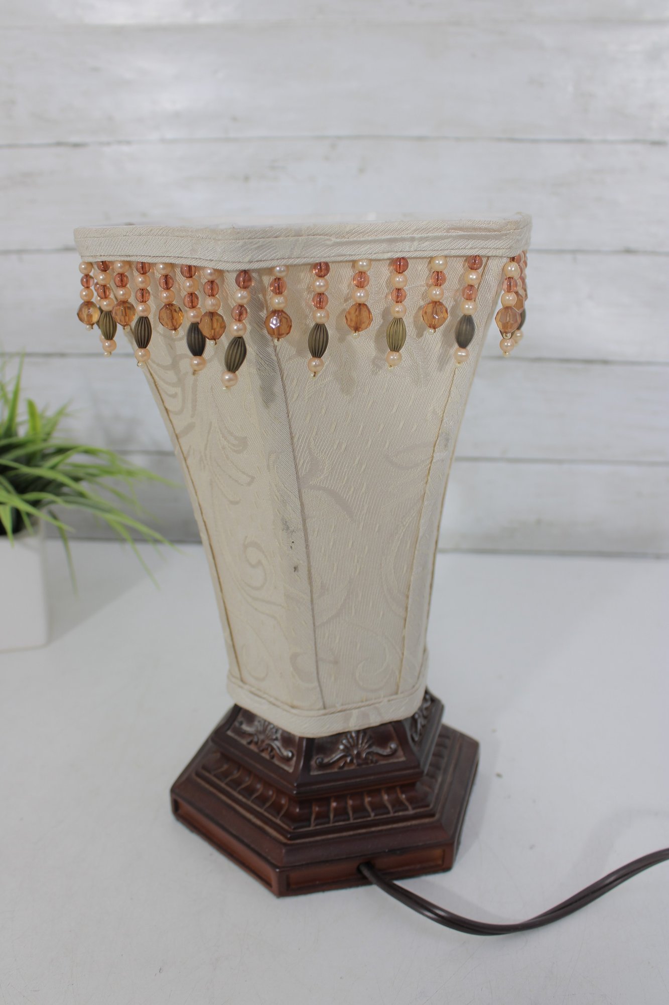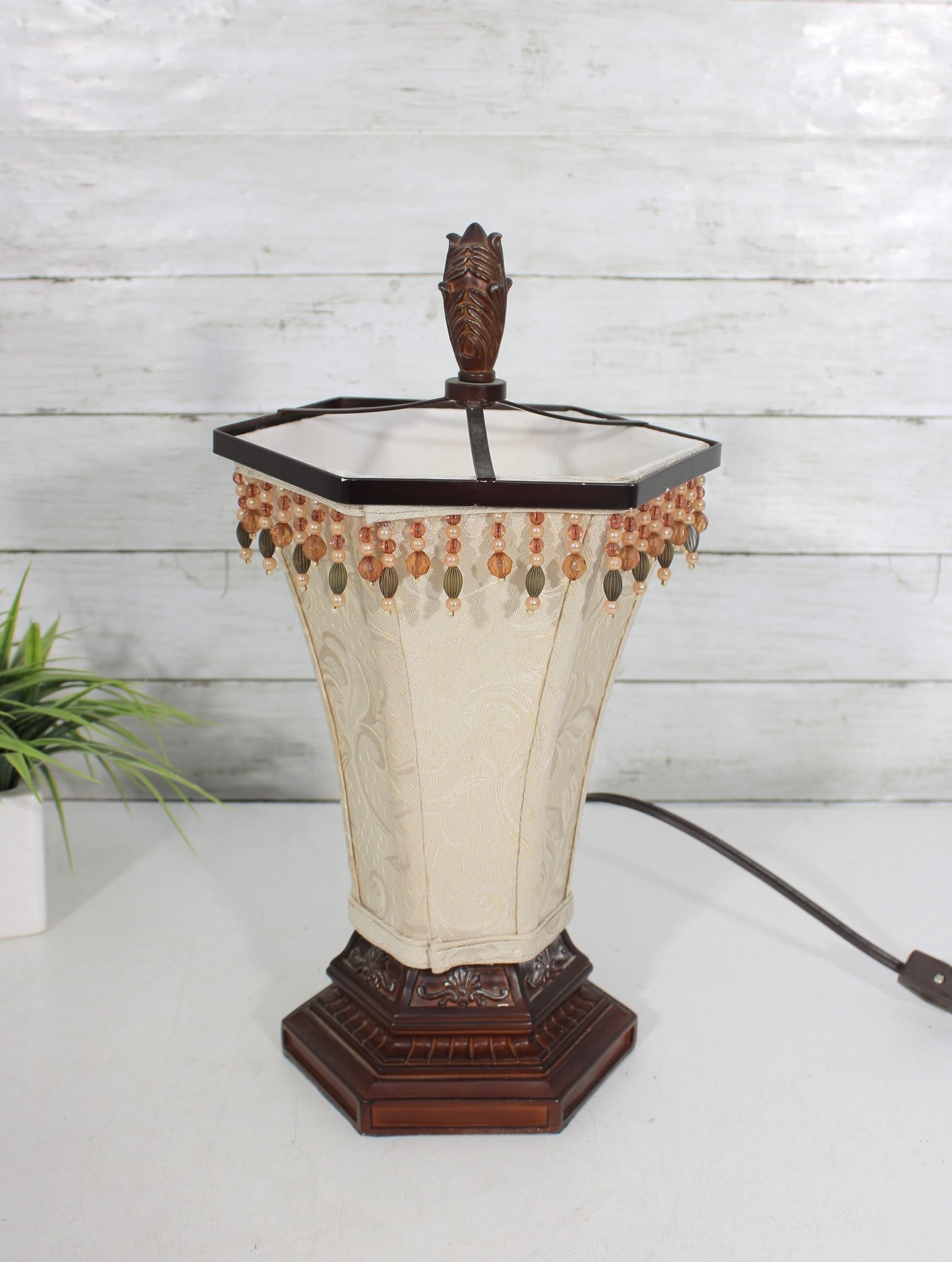 Charming vintage boudoir-style table lamp featuring a decorative tapered fabric shade accented with beaded fringe trim and an ornate wood-tone base. The classic design and warm neutral colors give this lamp a timeless vintage look, perfect for bedrooms, sitting areas, or accent lighting.