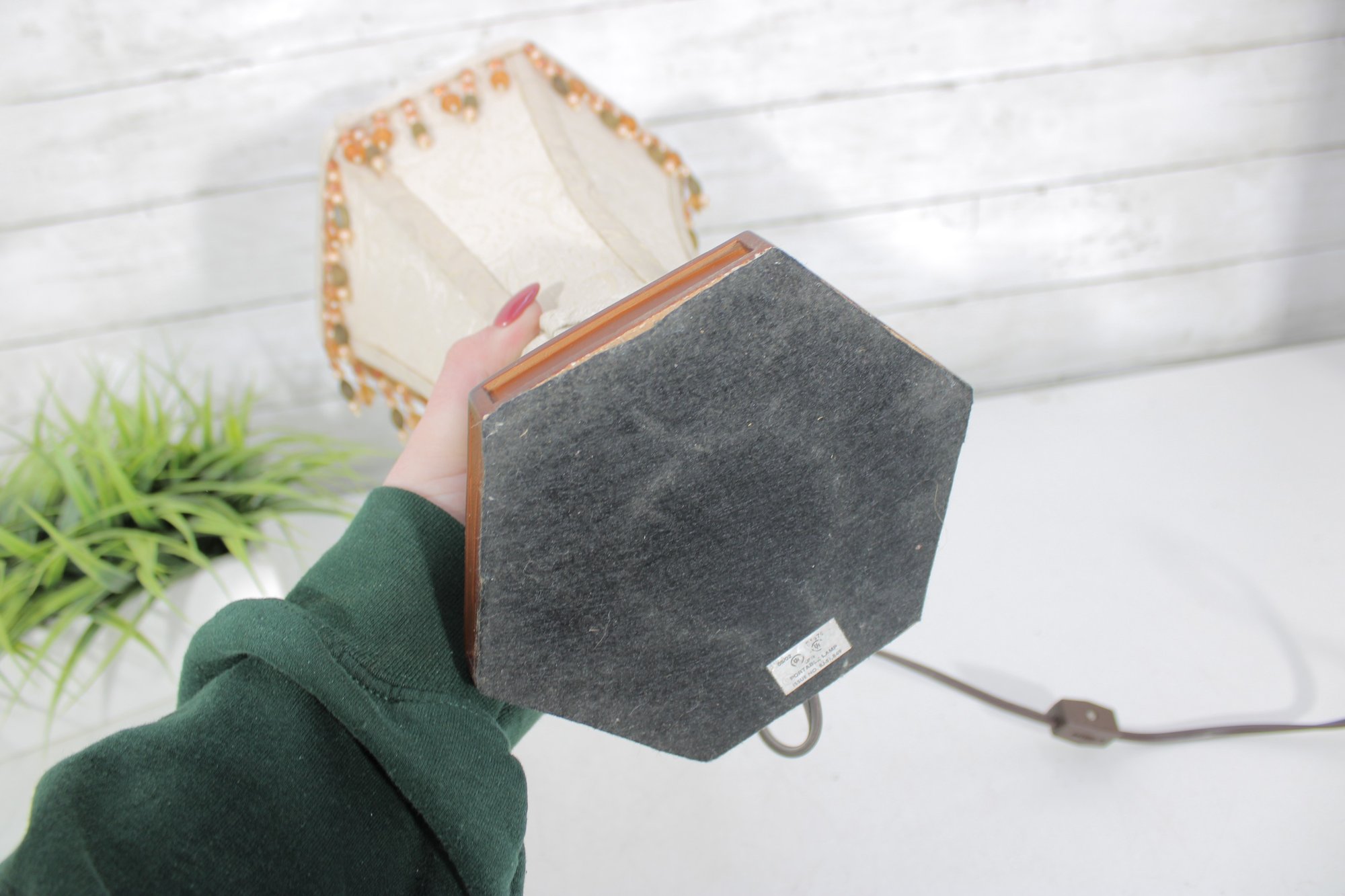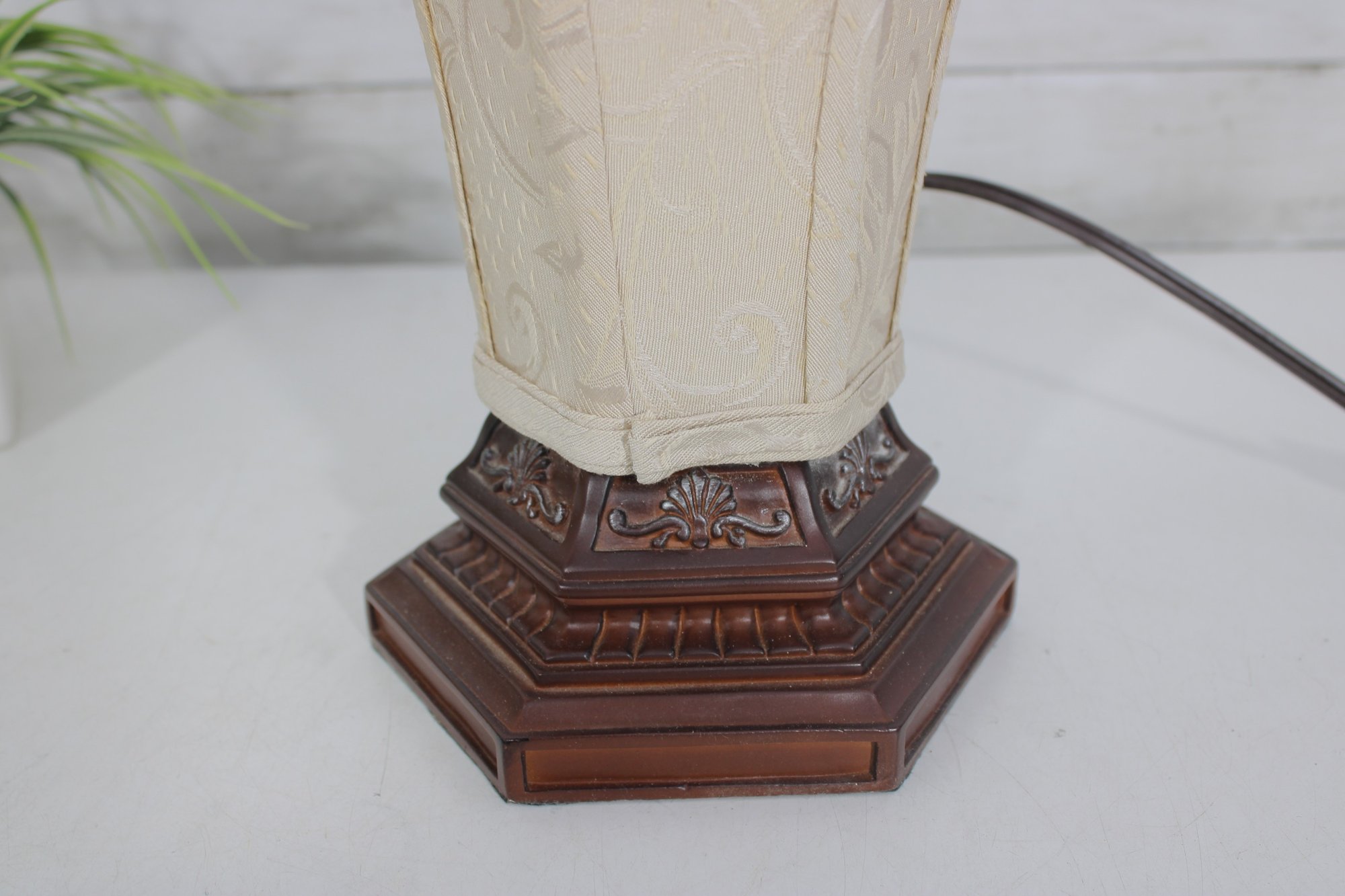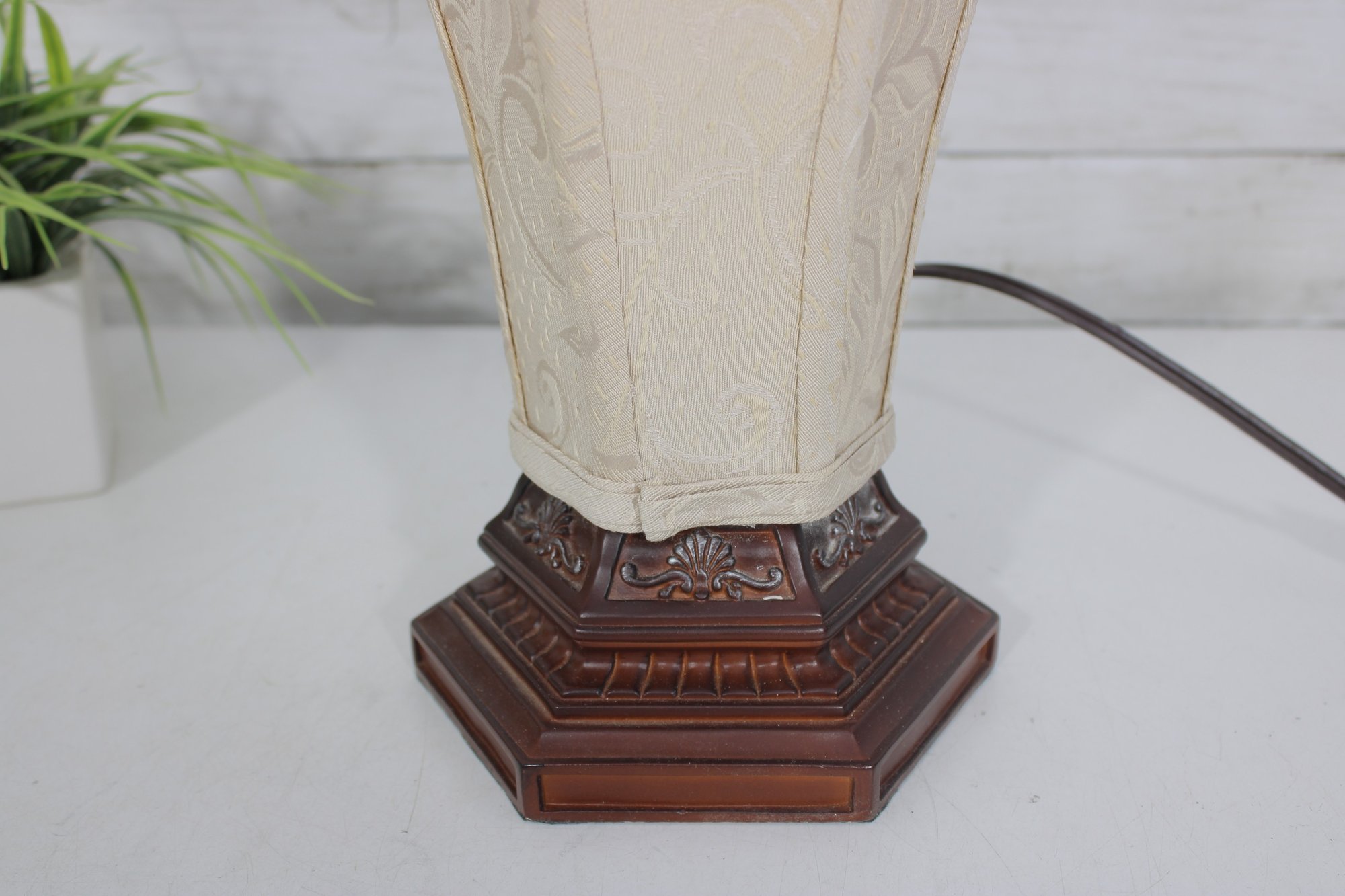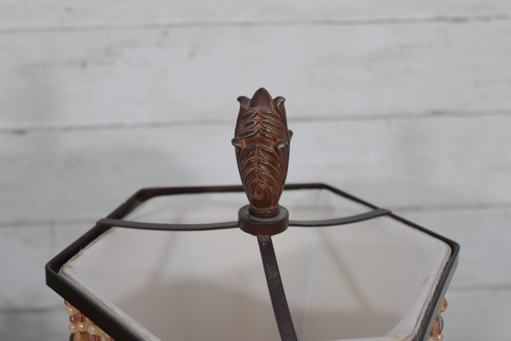 Charming vintage boudoir-style table lamp featuring a decorative tapered fabric shade accented with beaded fringe trim and an ornate wood-tone base. The classic design and warm neutral colors give this lamp a timeless vintage look, perfect for bedrooms, sitting areas, or accent lighting.