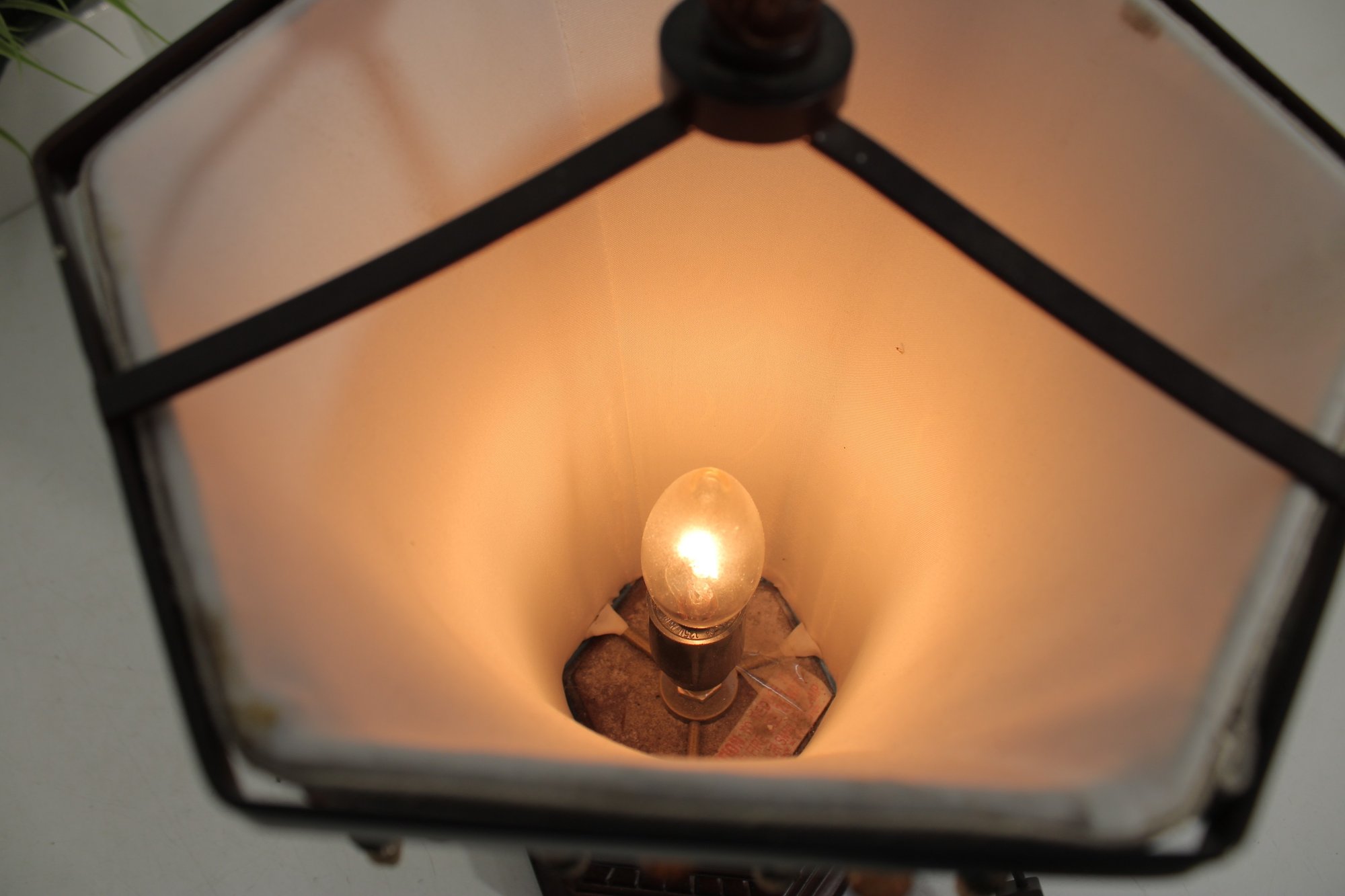 Condition shows age-related wear consistent with vintage use, including light marks to the base and fabric. The lamp powers on as shown; however, due to age, electrical components are sold as vintage and may benefit from inspection prior to regular use.