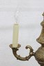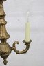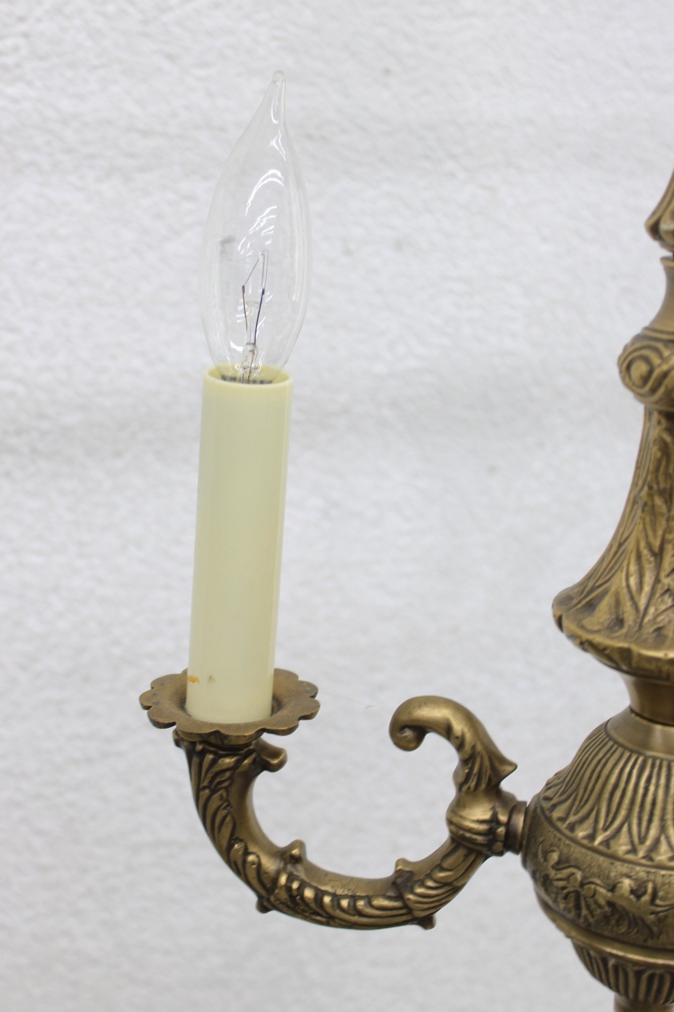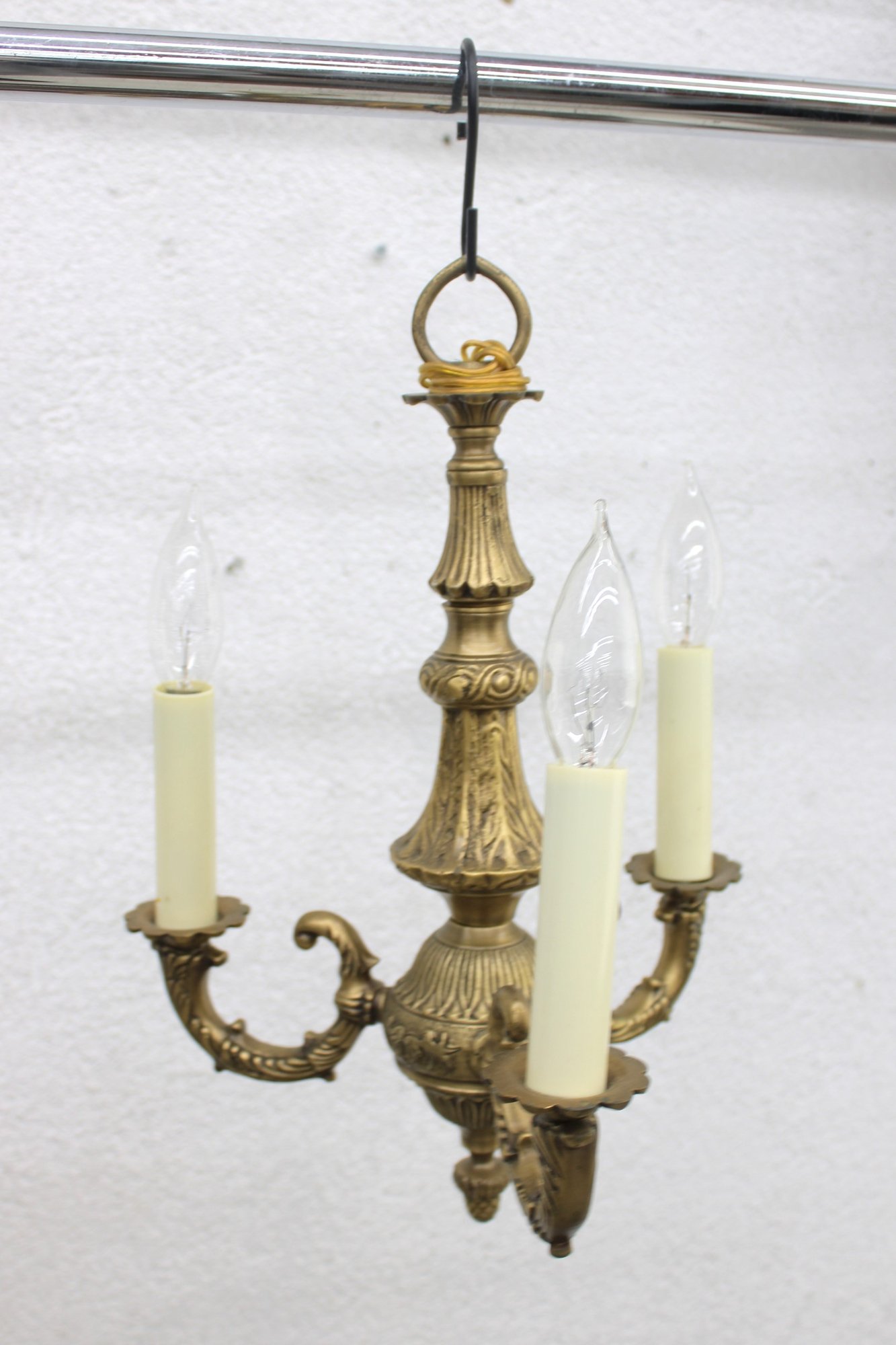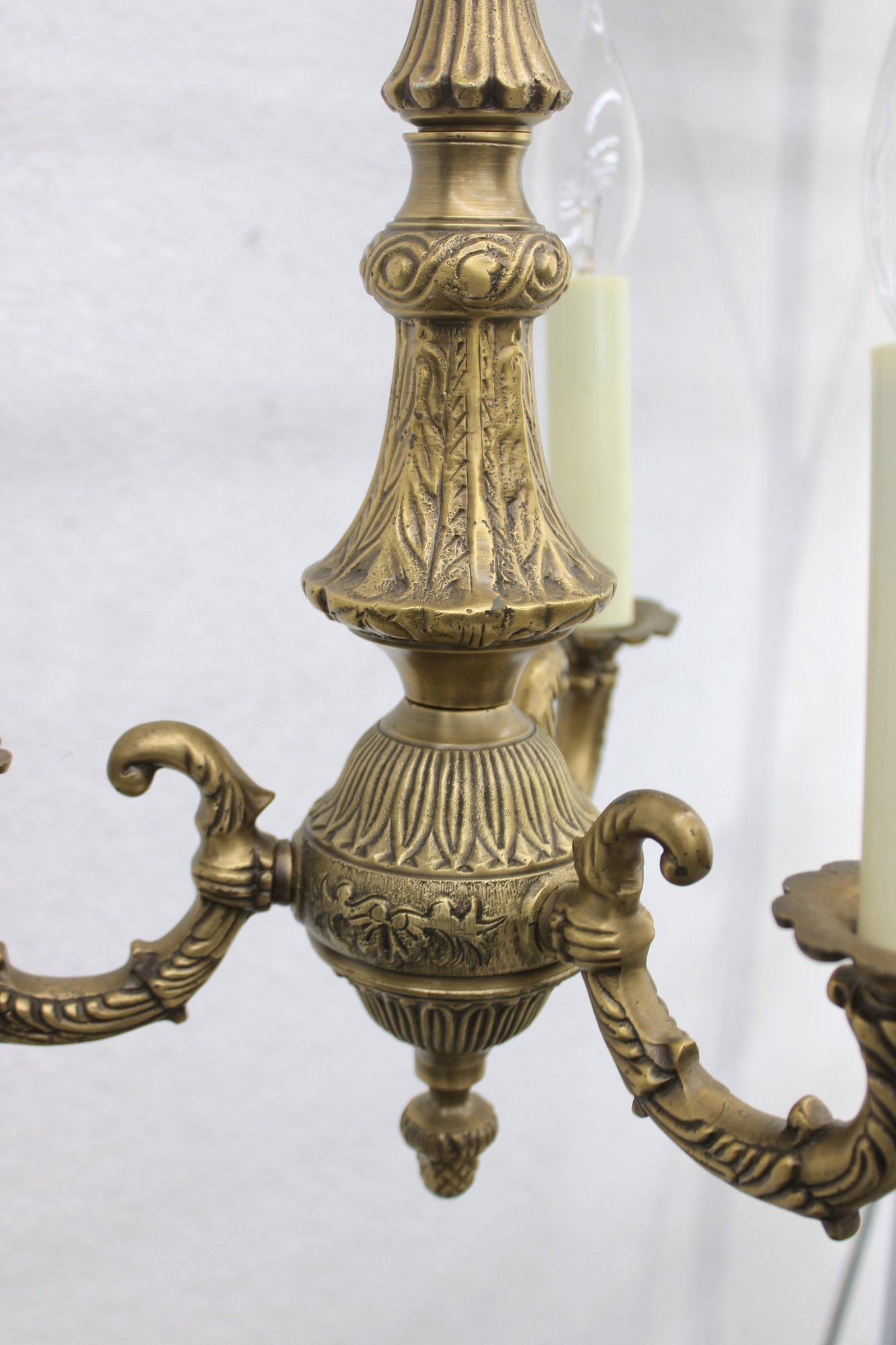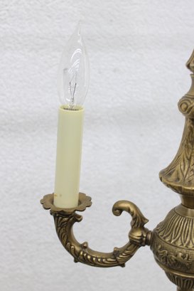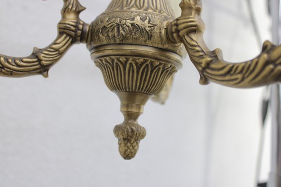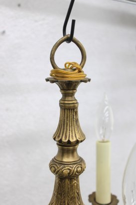 This beautifully detailed fixture showcases ornate cast metalwork throughout, including decorative scroll arms, a fluted central column, and an intricate finial. The warm brass finish adds timeless charm, making it a perfect addition to traditional, vintage, or eclectic interiors.
