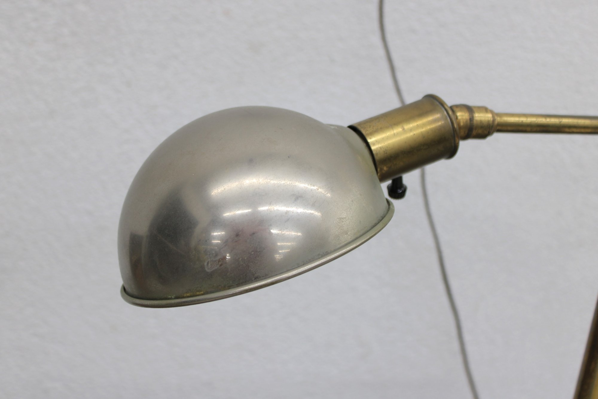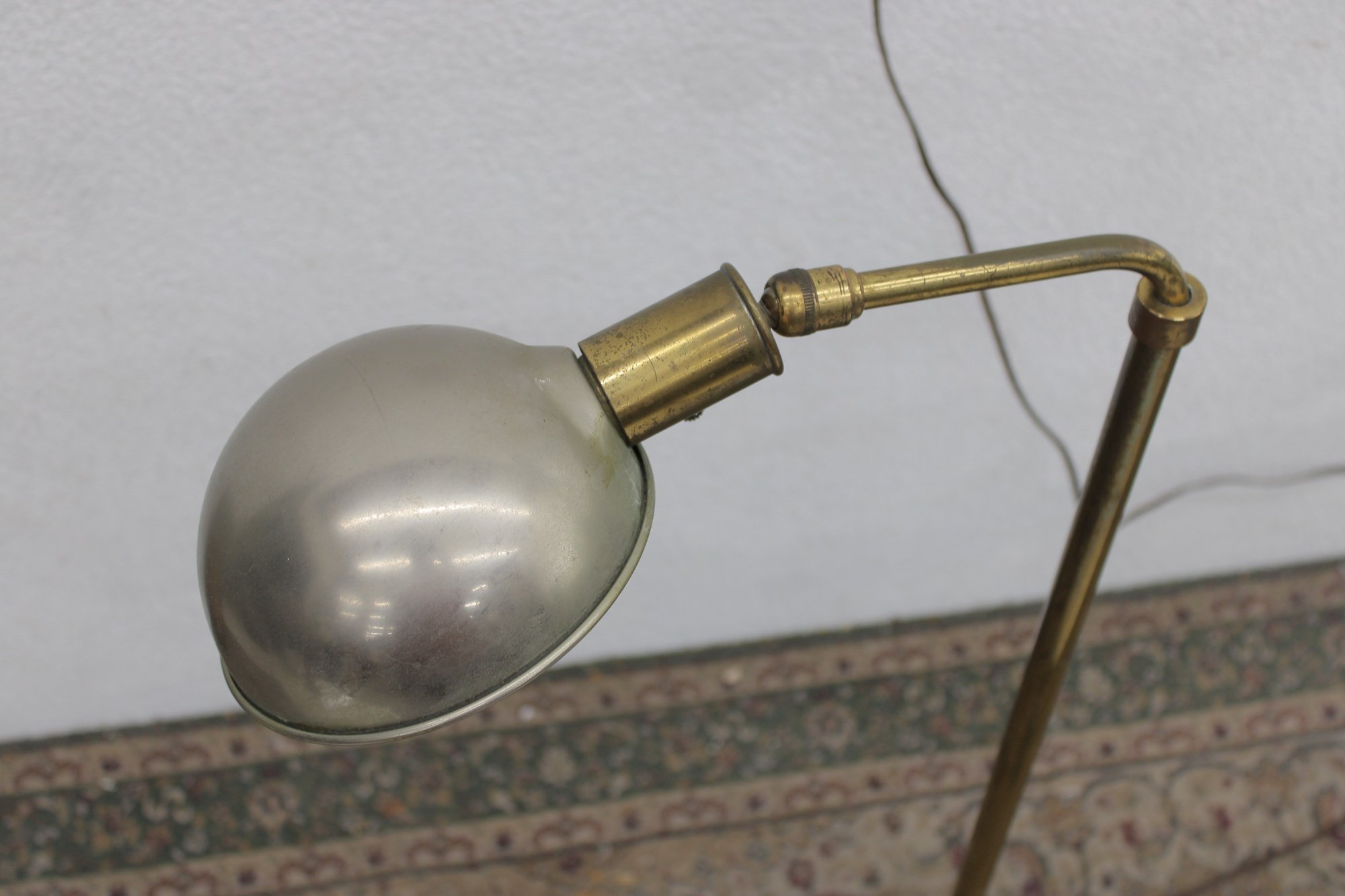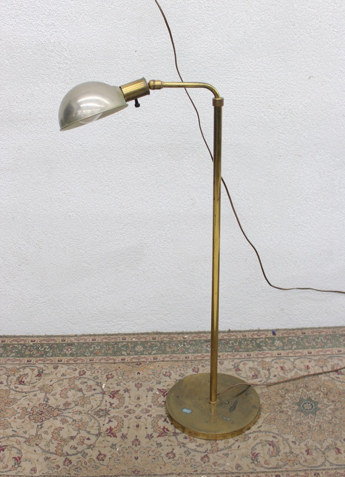 Vintage floor lamp featuring a classic mid-century modern design with a brass stem and adjustable arm paired with a sleek dome shade. The combination of warm brass and the soft metallic shade creates a timeless, understated look that fits effortlessly into a variety of interiors.