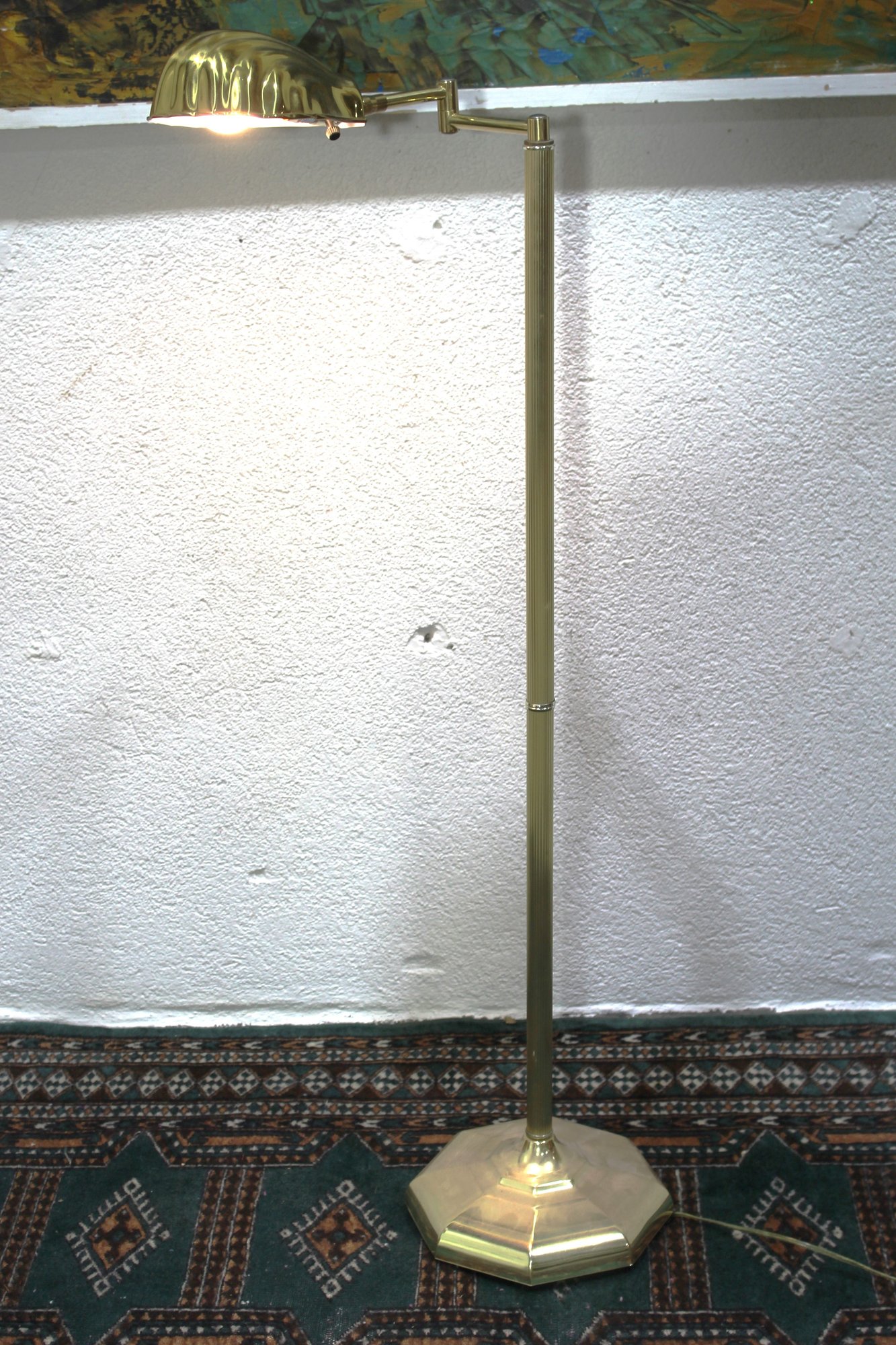 This vintage brass floor lamp exudes timeless elegance and functionality, featuring an adjustable arm and a beautifully detailed scalloped shade. Its solid brass construction and octagonal base provide both stability and style, making it a perfect addition to any traditional or modern décor.