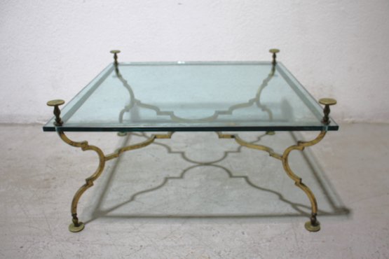 This elegant vintage coffee table combines a striking brass base with a thick glass top, adding a touch of sophistication to any space. The brass frame features intricate, curved details that add character and charm. Four small brass supports enhance the table's stability and provide a stylish accent to the corners. Perfect for adding a classic touch to your living room or office.