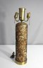This striking vintage lamp features a textured cylindrical base with intricate artistic detailing and a sturdy brass finish. The unique design includes a three-light fixture, complete with brass sockets and pull chains for an elegant touch. Perfect as a statement piece for any room, this lamp combines functionality with timeless style. The lamp is in working condition, as shown with illuminated bulbs (not included). A brass base adds durability and a classic foundation to this versatile piece. Ideal for collectors or anyone looking to add a vintage aesthetic to their décor.