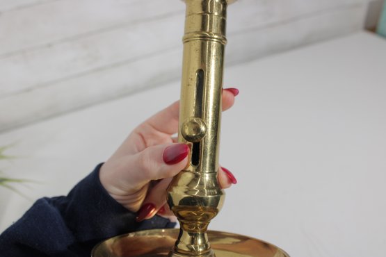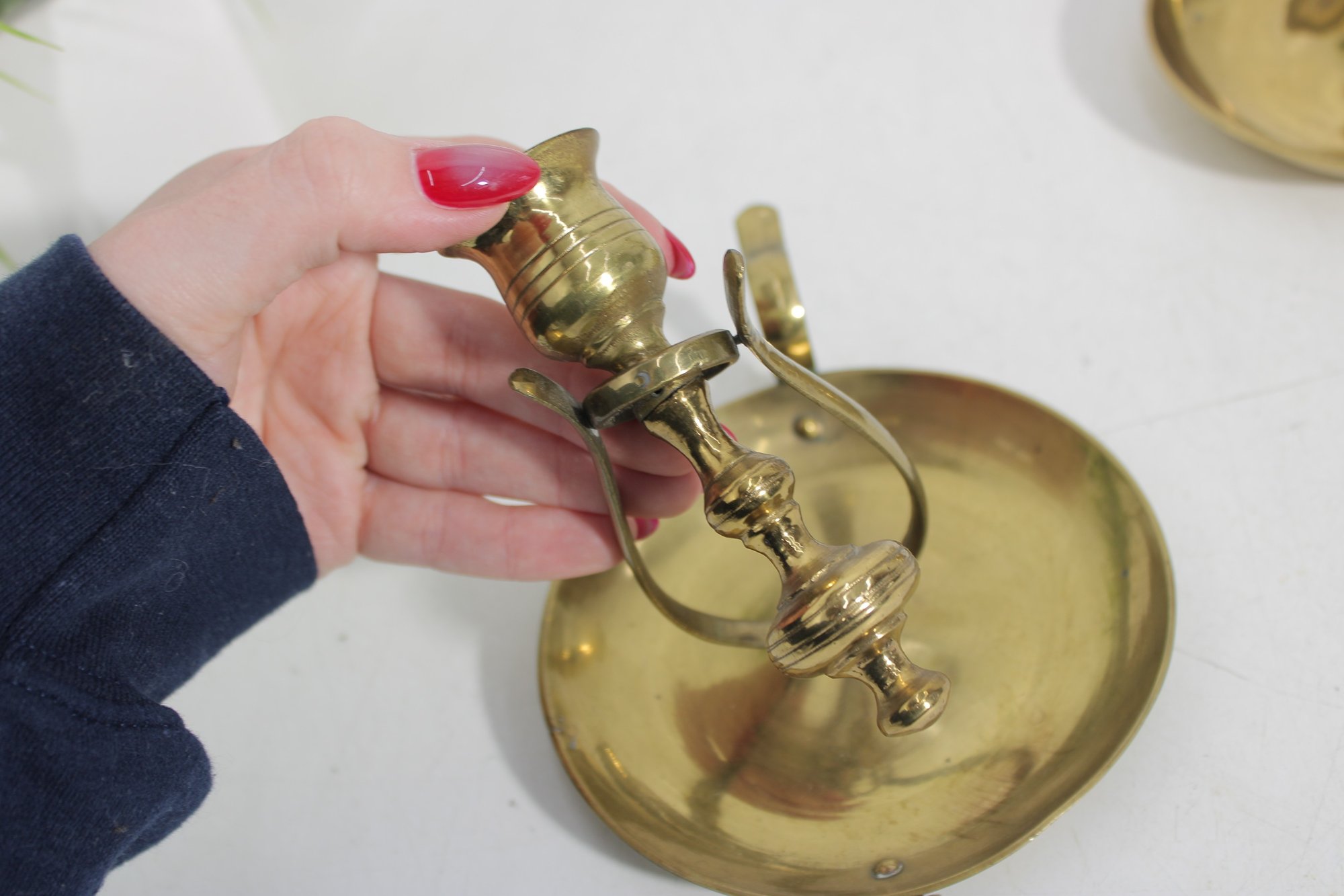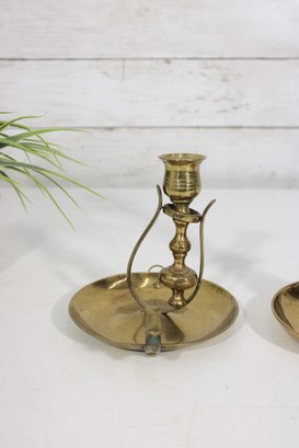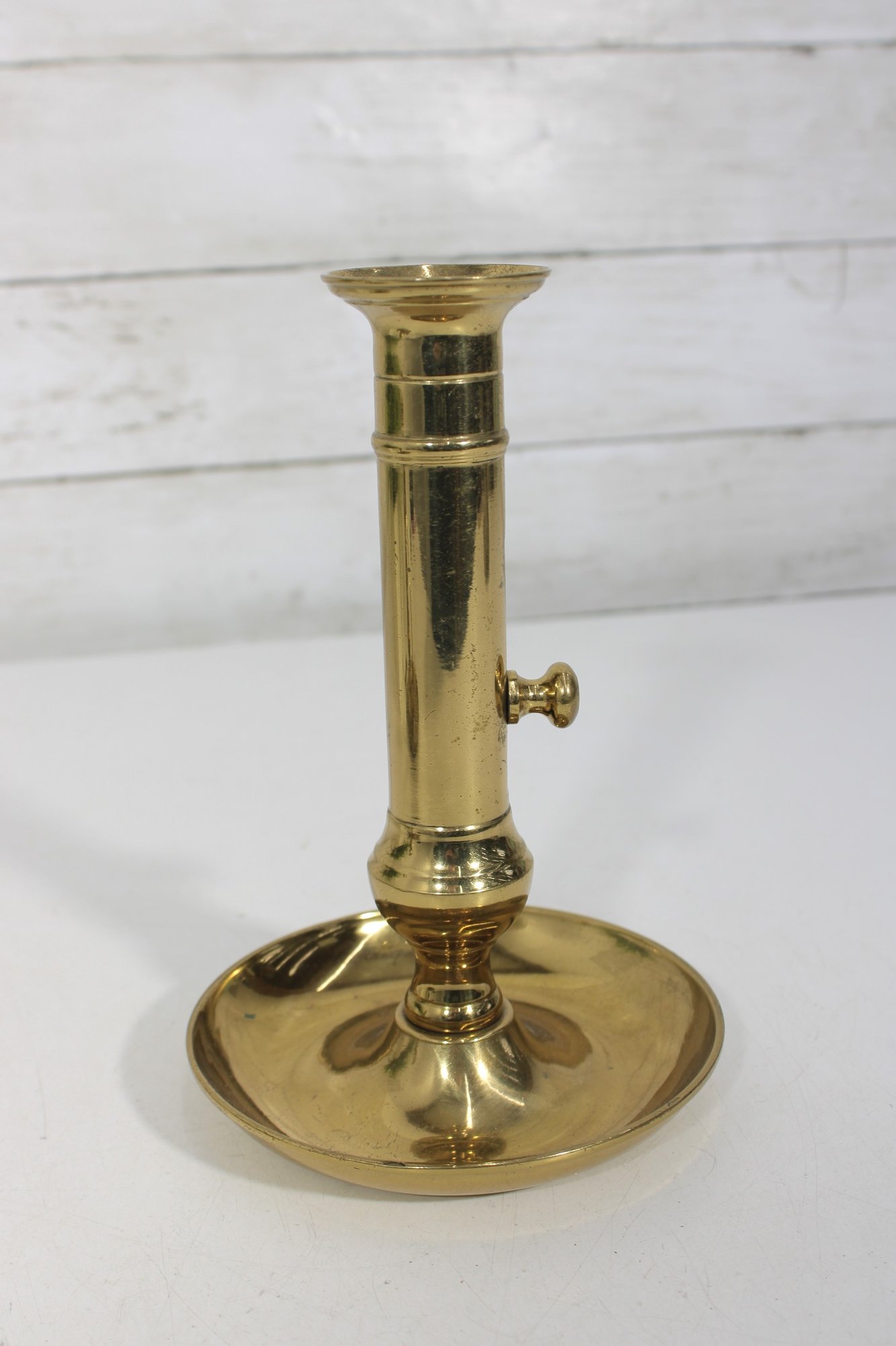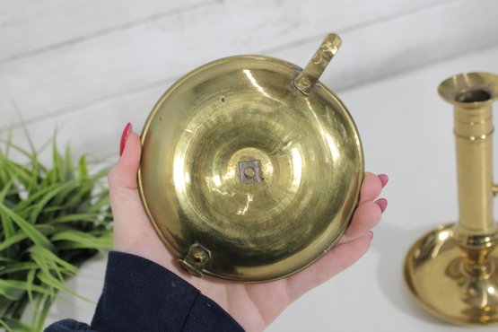 Nice vintage pair of solid brass candlestick holders featuring two distinct styles. One is a classic chamberstick with finger loop handle and push-up mechanism, designed for easy candle adjustment. The second is a taller, traditional candlestick with a clean, elegant form and side adjustment knob.