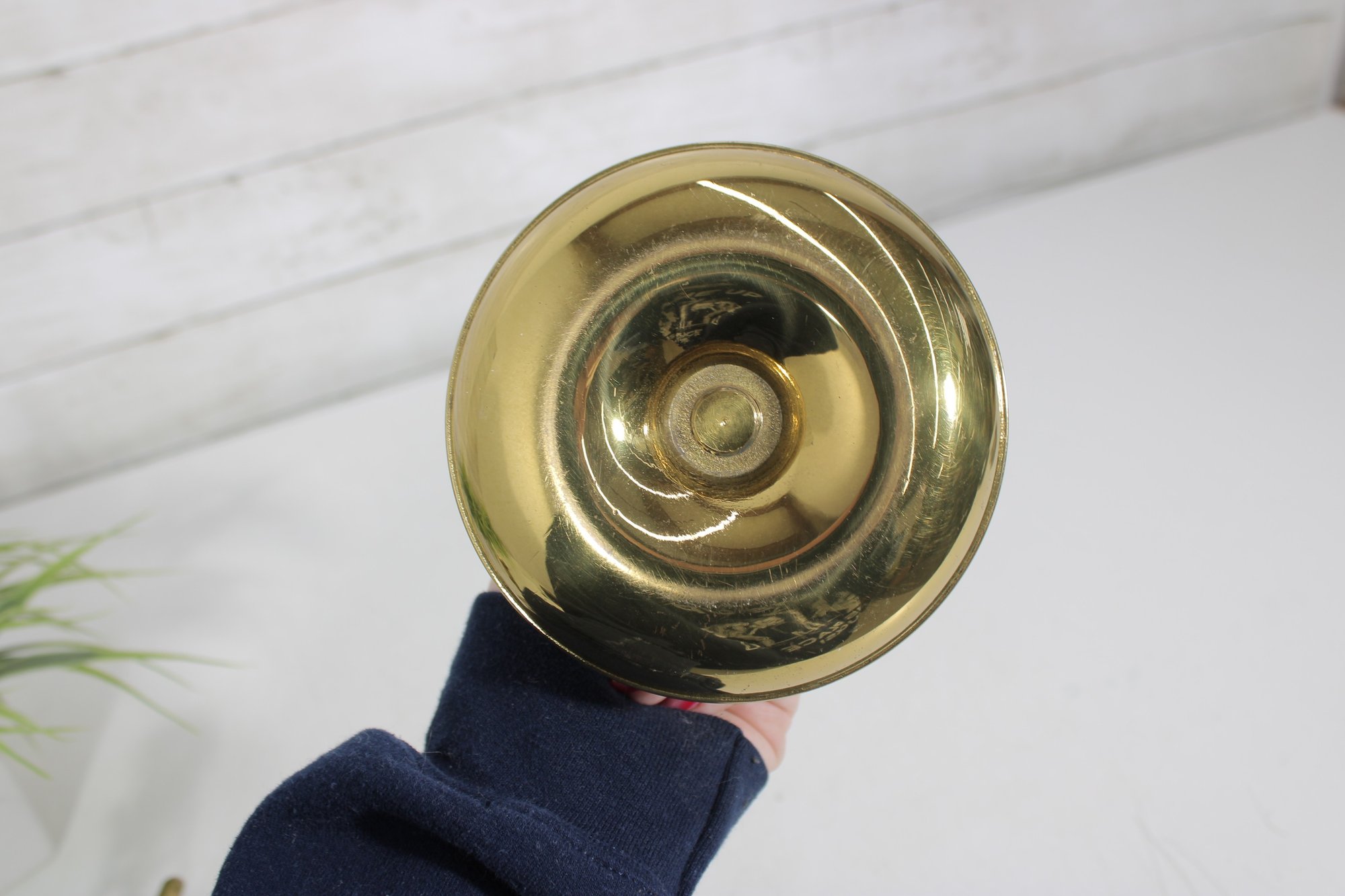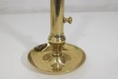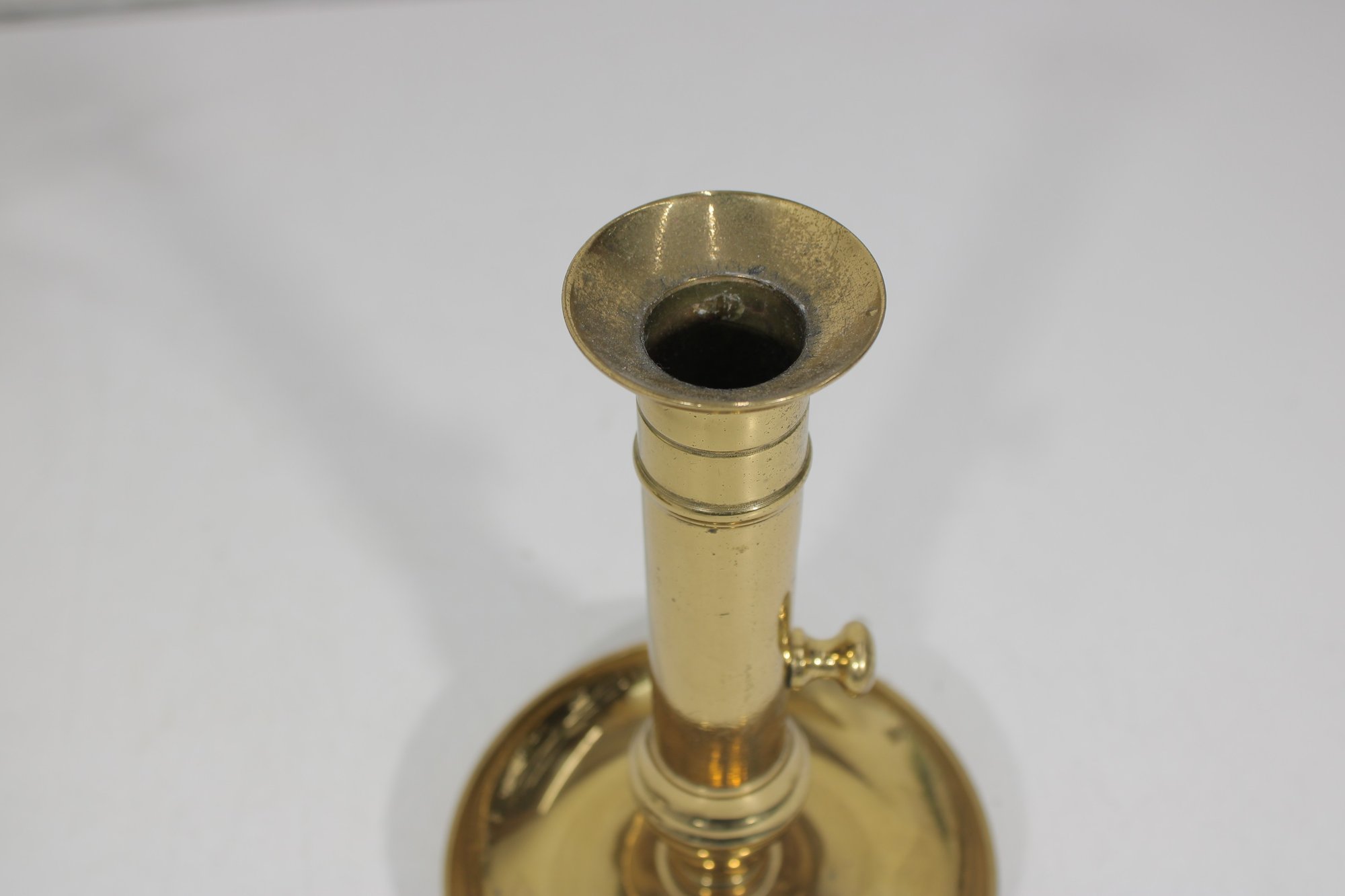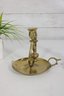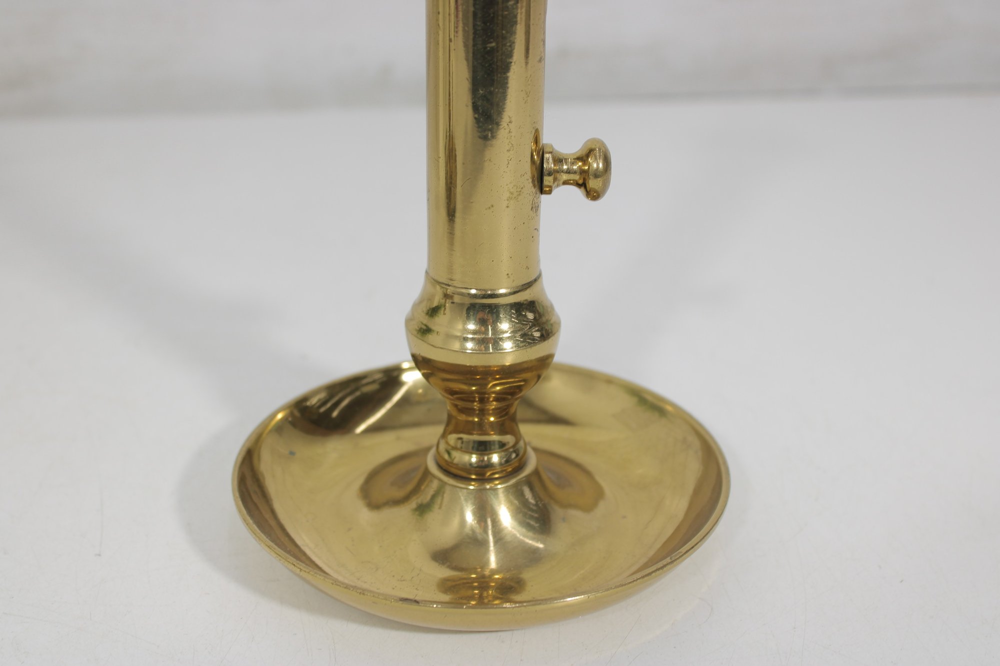Nice vintage pair of solid brass candlestick holders featuring two distinct styles. One is a classic chamberstick with finger loop handle and push-up mechanism, designed for easy candle adjustment. The second is a taller, traditional candlestick with a clean, elegant form and side adjustment knob.