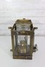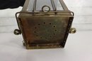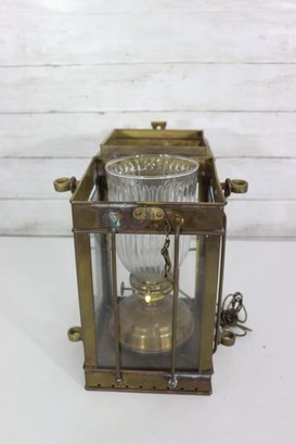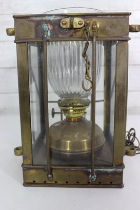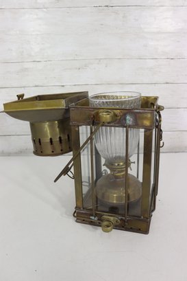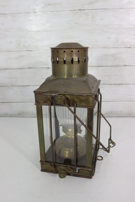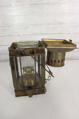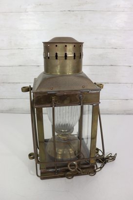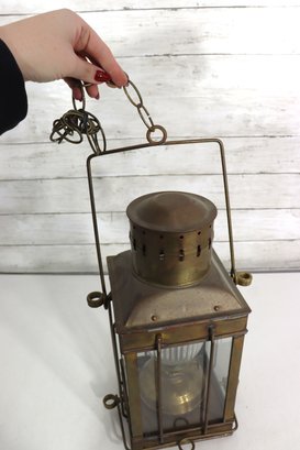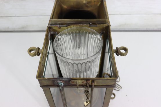 The lantern features four glass panels with a ribbed glass inner globe, a vented top chimney, and original locking latch hardware. The hinged lid opens smoothly, and it retains its sturdy hanging handle and side rings—perfect for display or use as a statement lighting piece.