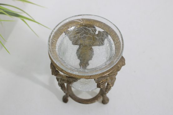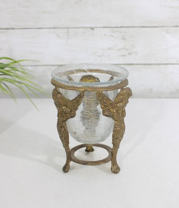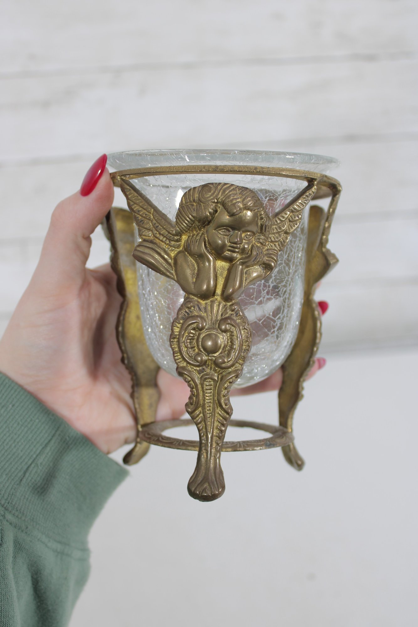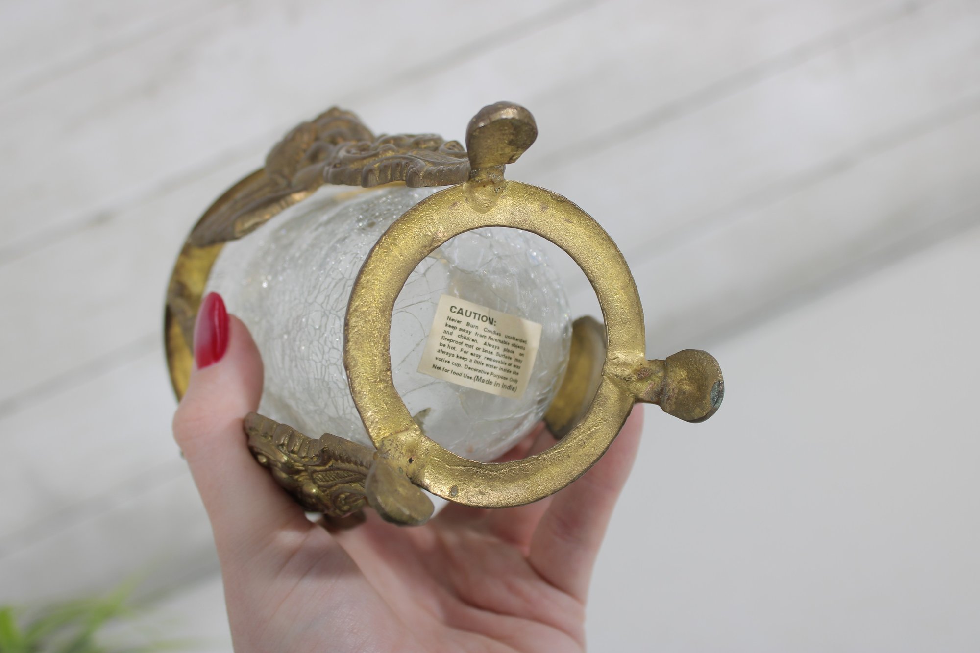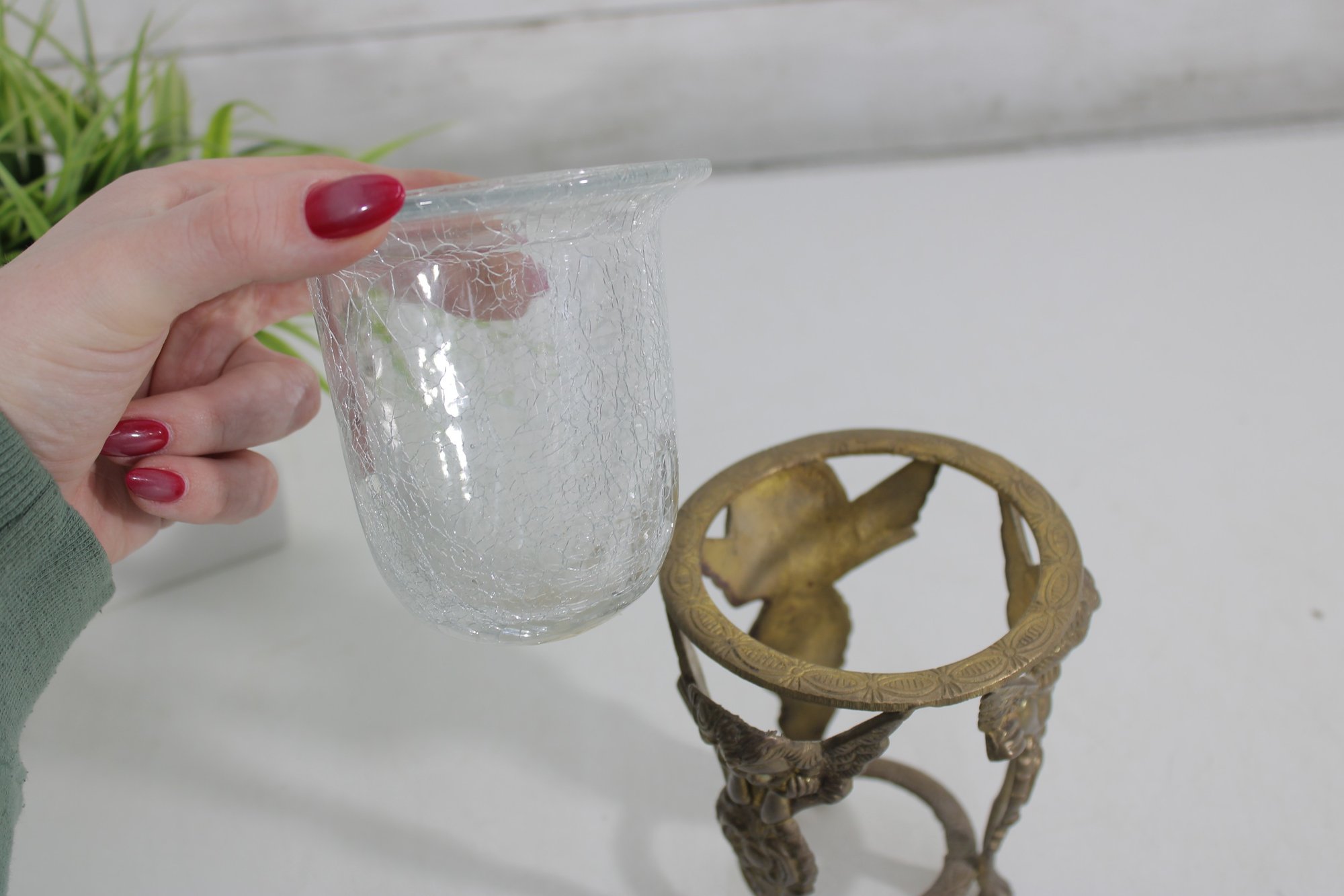 The included glass insert has a crackled texture, adding warmth and ambiance when lit. The rich patina of the brass enhances its vintage character, while the intricate detailing gives it a classic, romantic aesthetic.