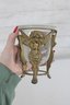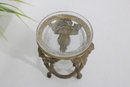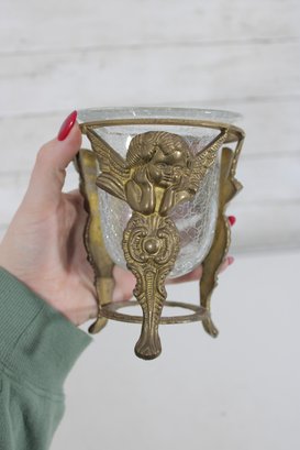 brass pedestal votive candle holder featuring detailed cherub/angel figures and a removable textured glass insert. This piece stands approximately 5.5 inches tall and showcases three ornate cherub figures forming the base, connected by a decorative ring frame.