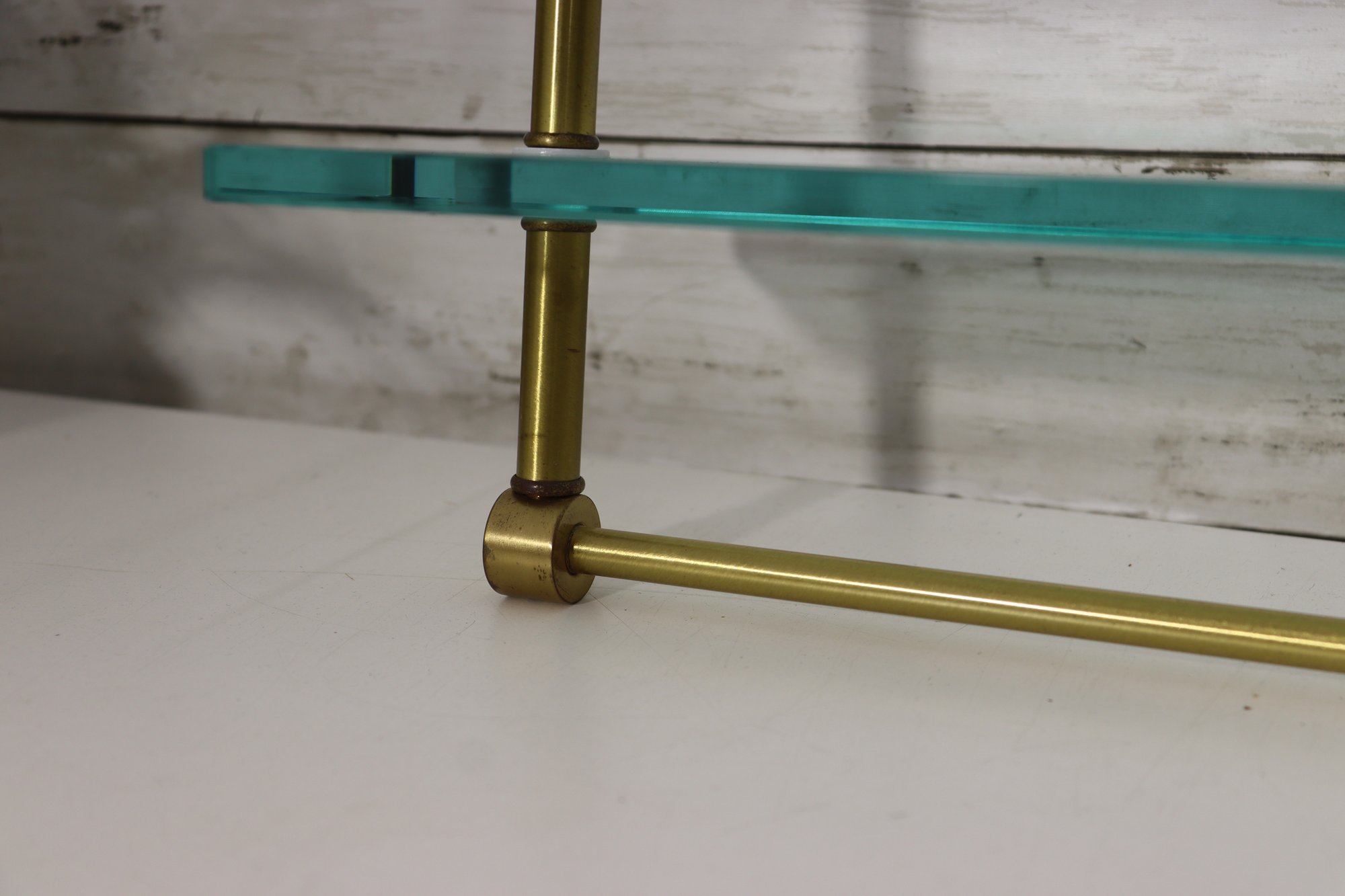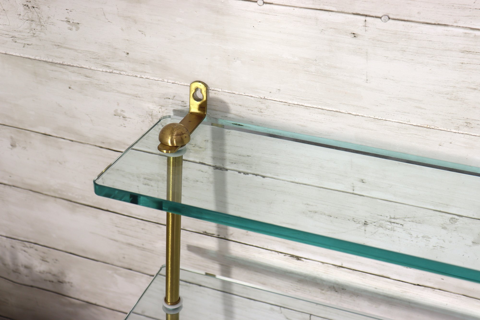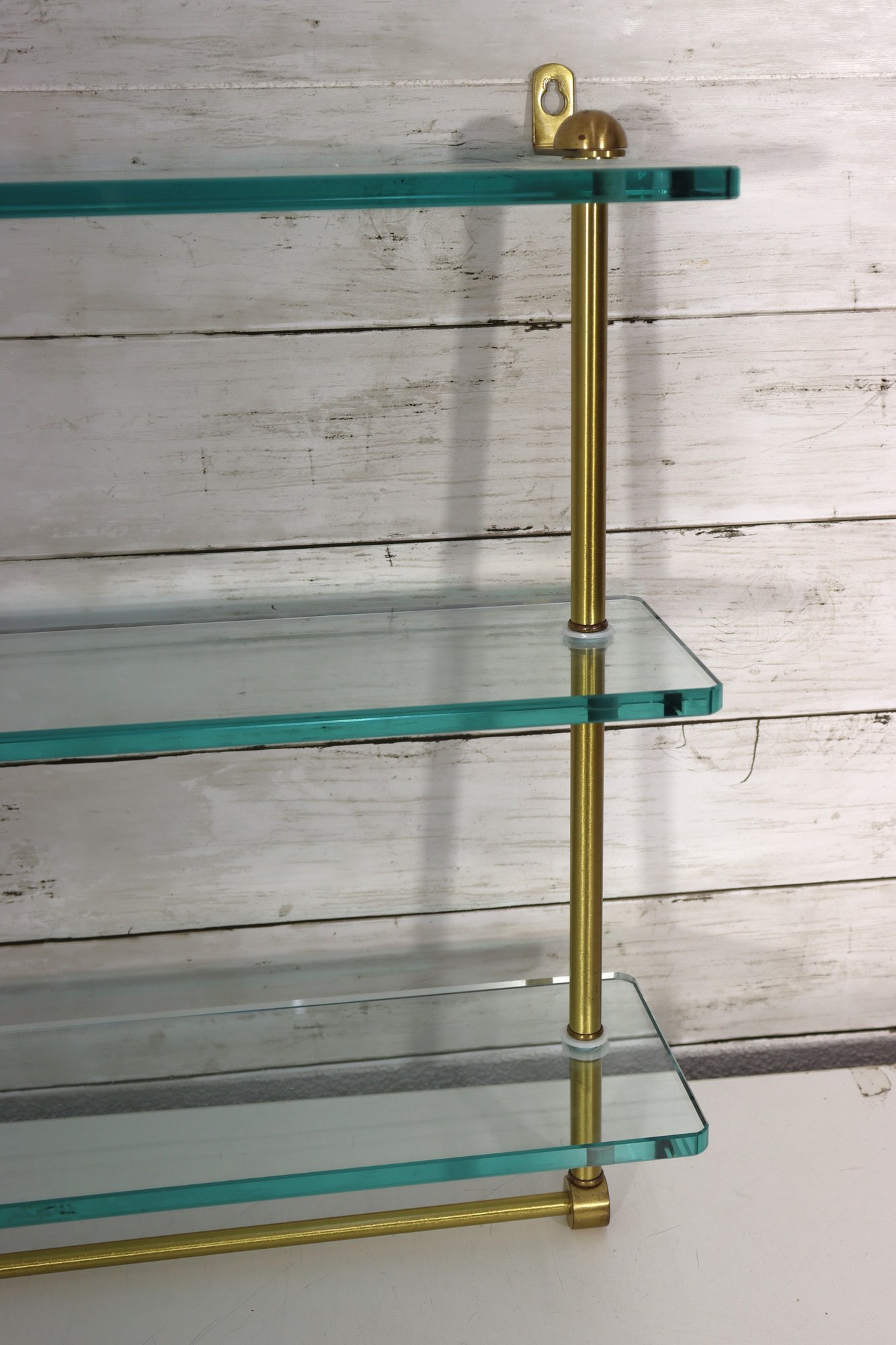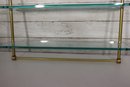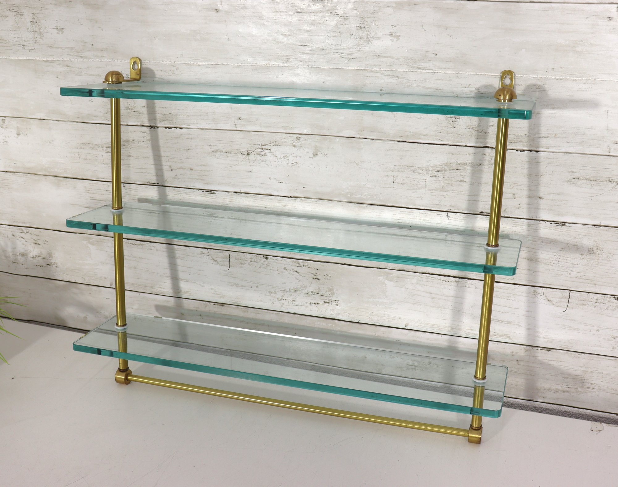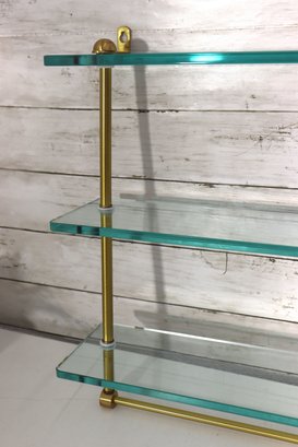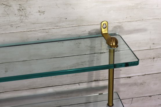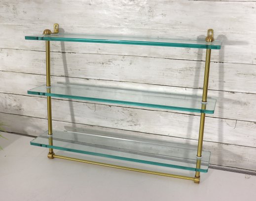 Beautiful vintage 3 tier glass wall shelf with brass tone metal frame. Features three thick glass shelves supported by sleek brass rods and mounting brackets at top. Classic mid century modern / Hollywood Regency style – perfect for displaying small décor, perfumes, collectibles, barware minis, plants, etc.