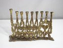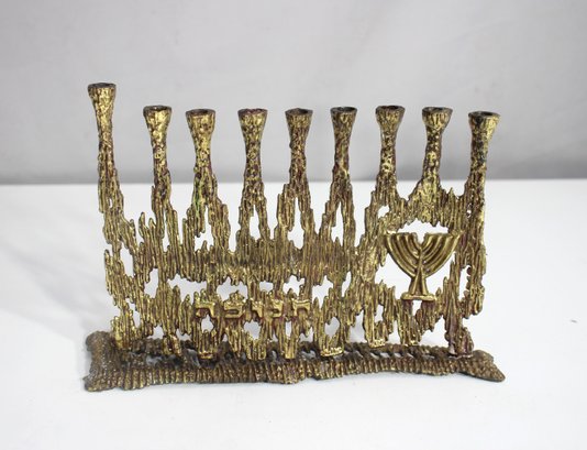 This striking vintage brass Hanukkah menorah, attributed to Israeli artist Wainberg, features a bold, abstract form cast in heavy, textured brass. A beautiful blend of modernist aesthetics and traditional Judaic symbolism, the piece includes Hebrew script and a menorah motif integrated into the design.