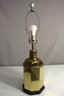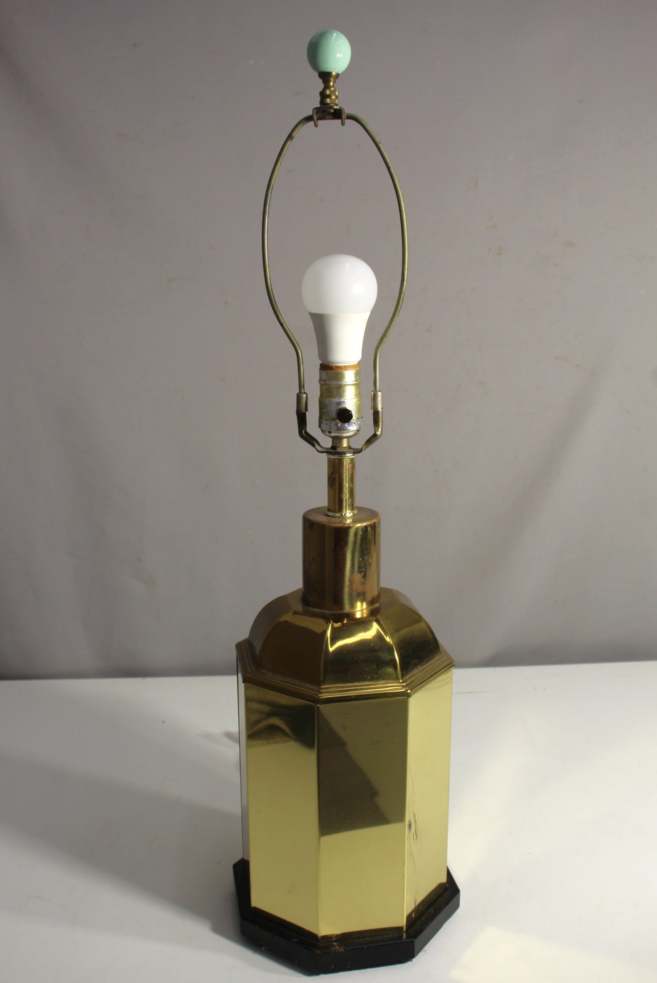 A striking vintage brass table lamp featuring a hexagonal design, perfect for adding a touch of mid-century modern elegance to any room. The lamp sits on a sturdy black base with protective feet and includes a lightbulb and finial.