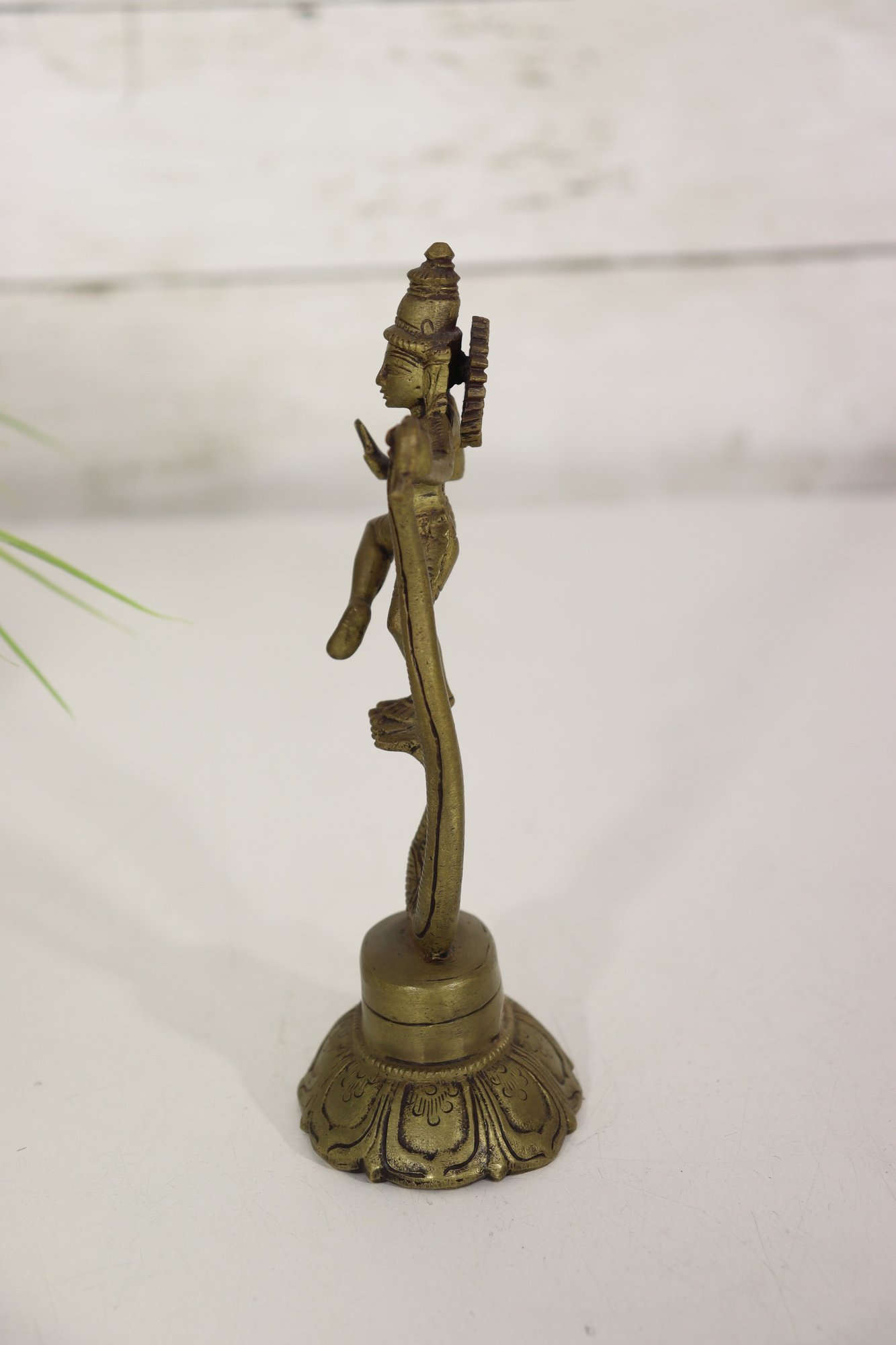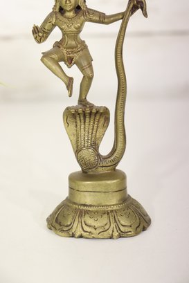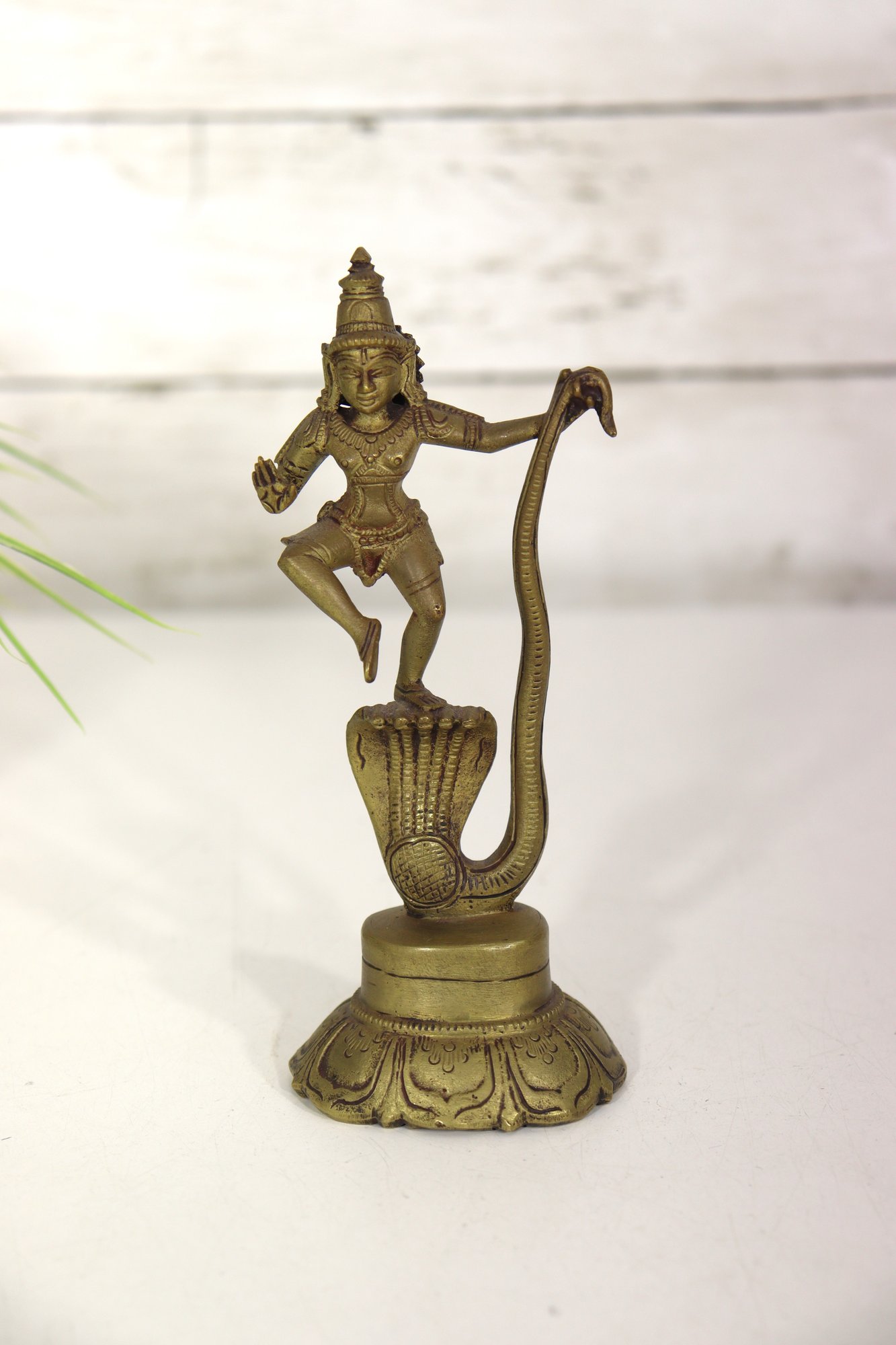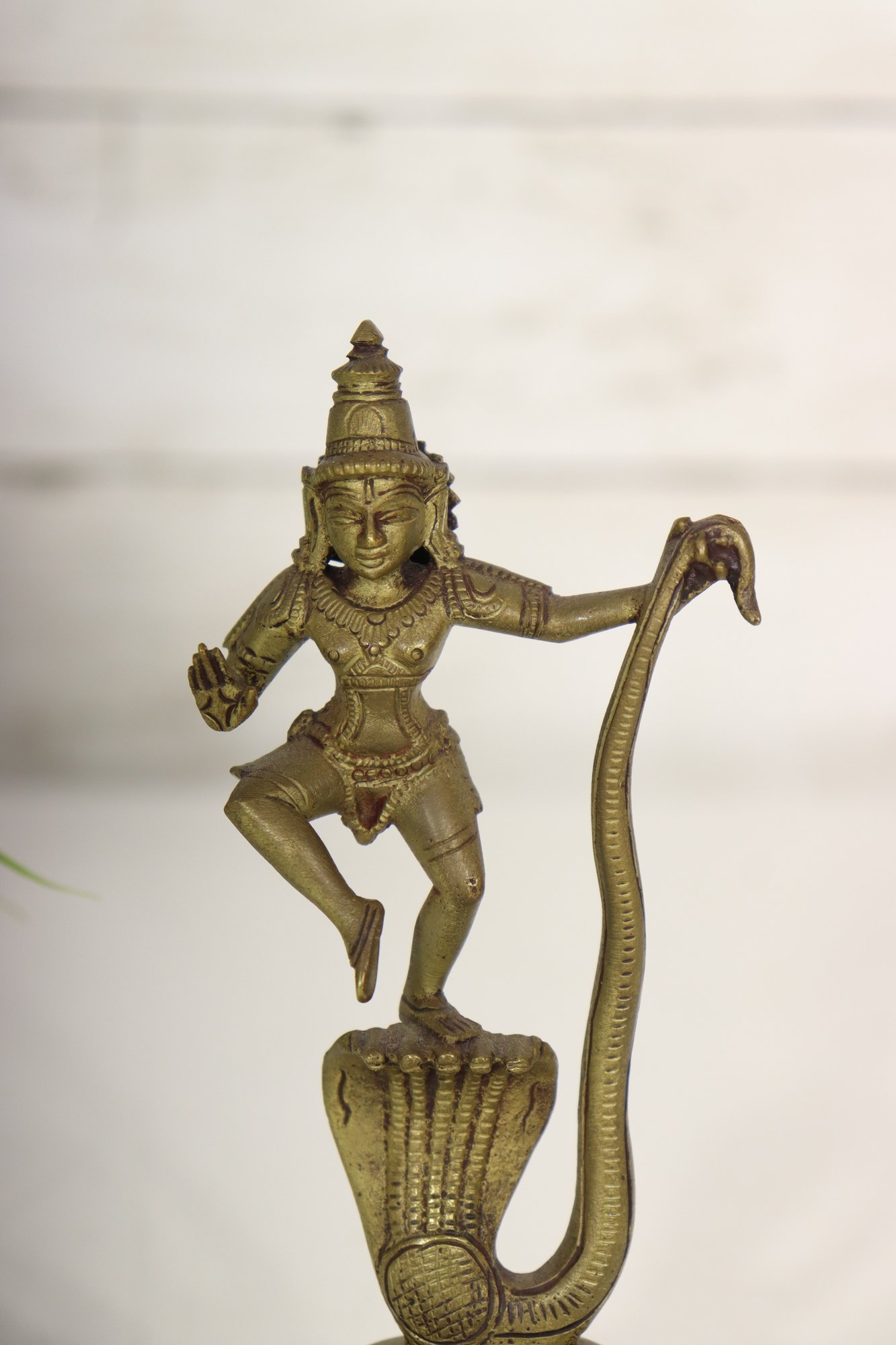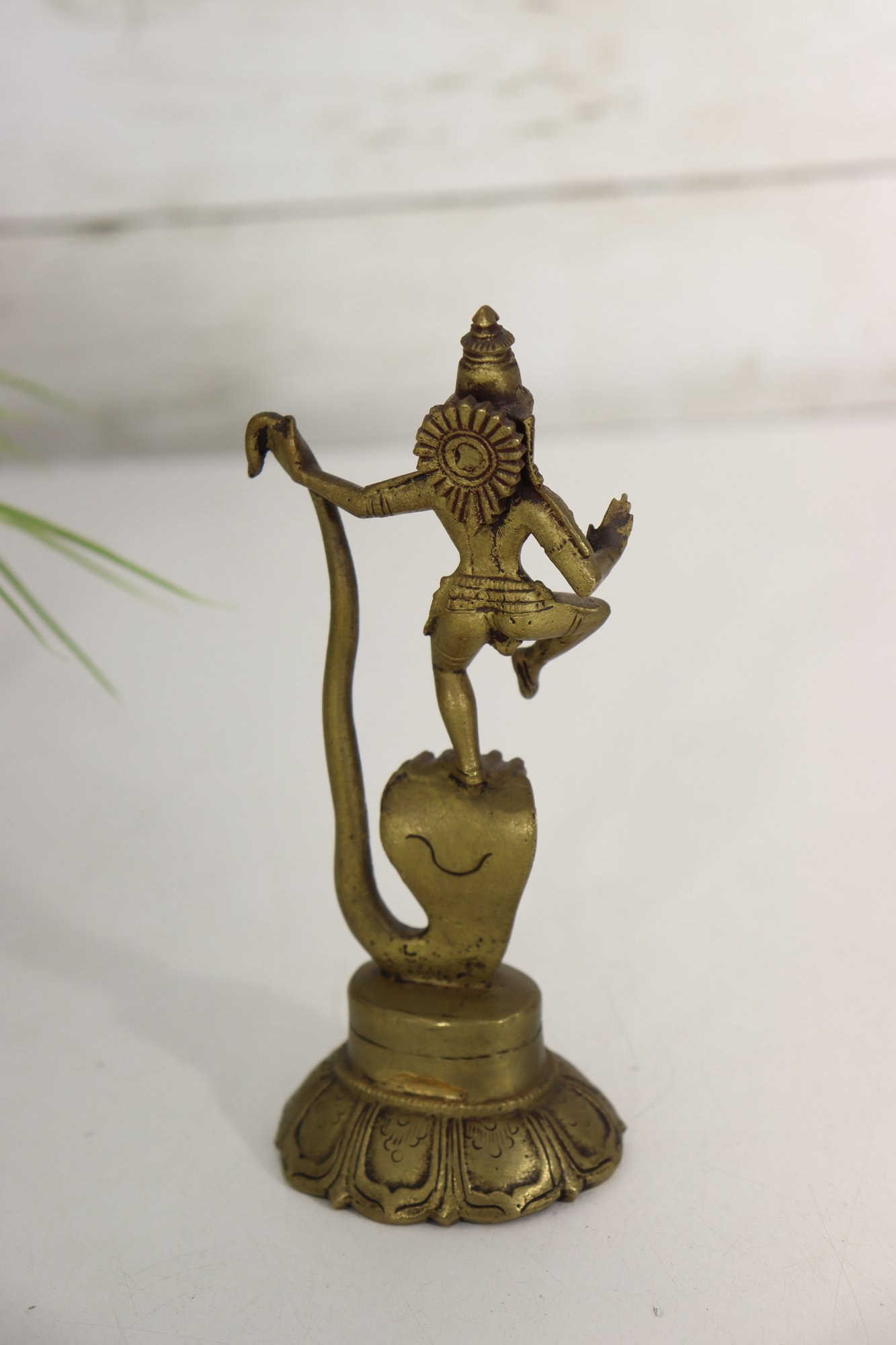 Beautiful vintage solid brass Hindu deity statue, standing approximately 6 inches tall, depicting Lord Krishna dancing on the serpent Kaliya — a symbolic representation of divine victory and protection.
