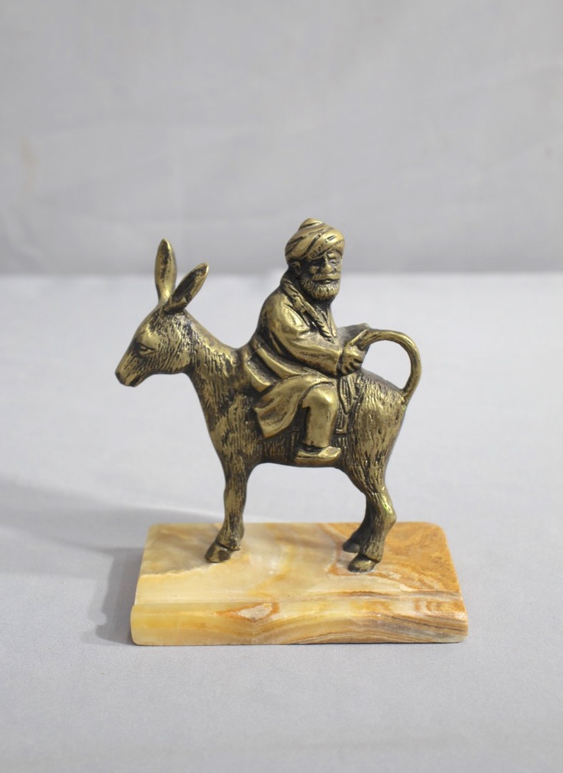 Vintage Brass Hodja Riding Donkey Backwards Statue On Marble Base
