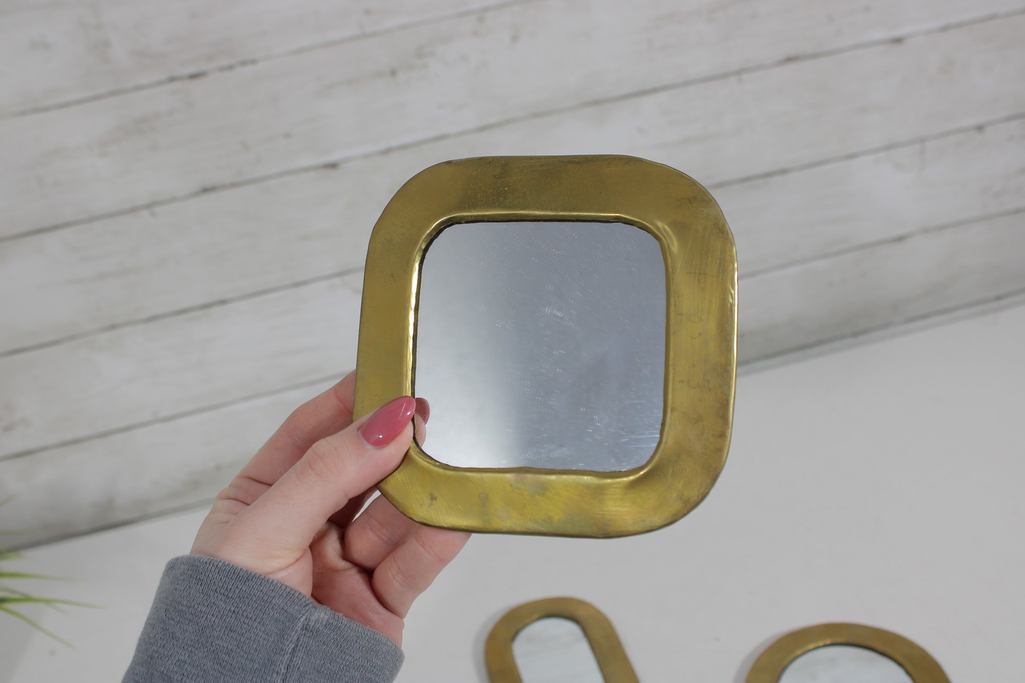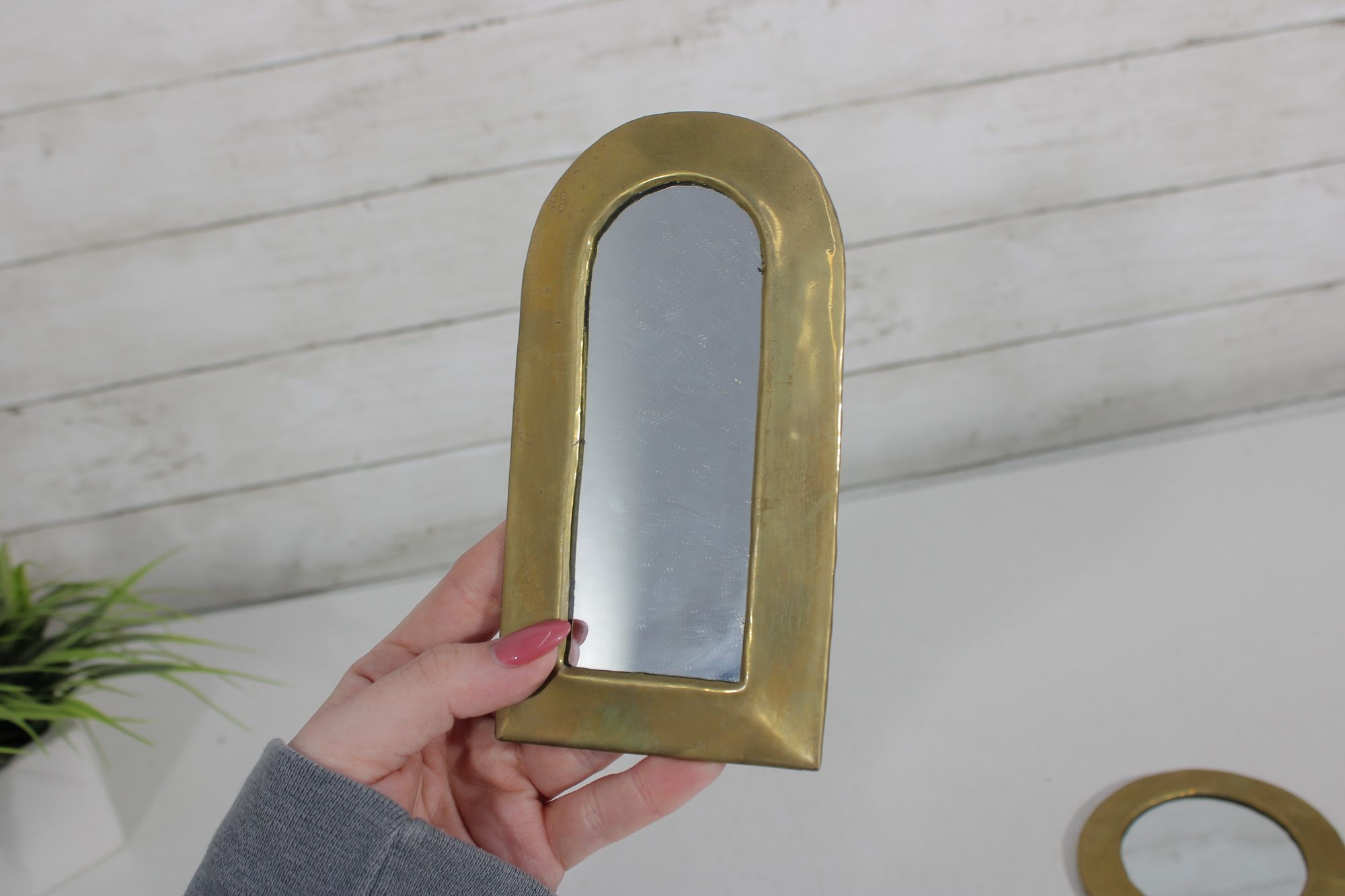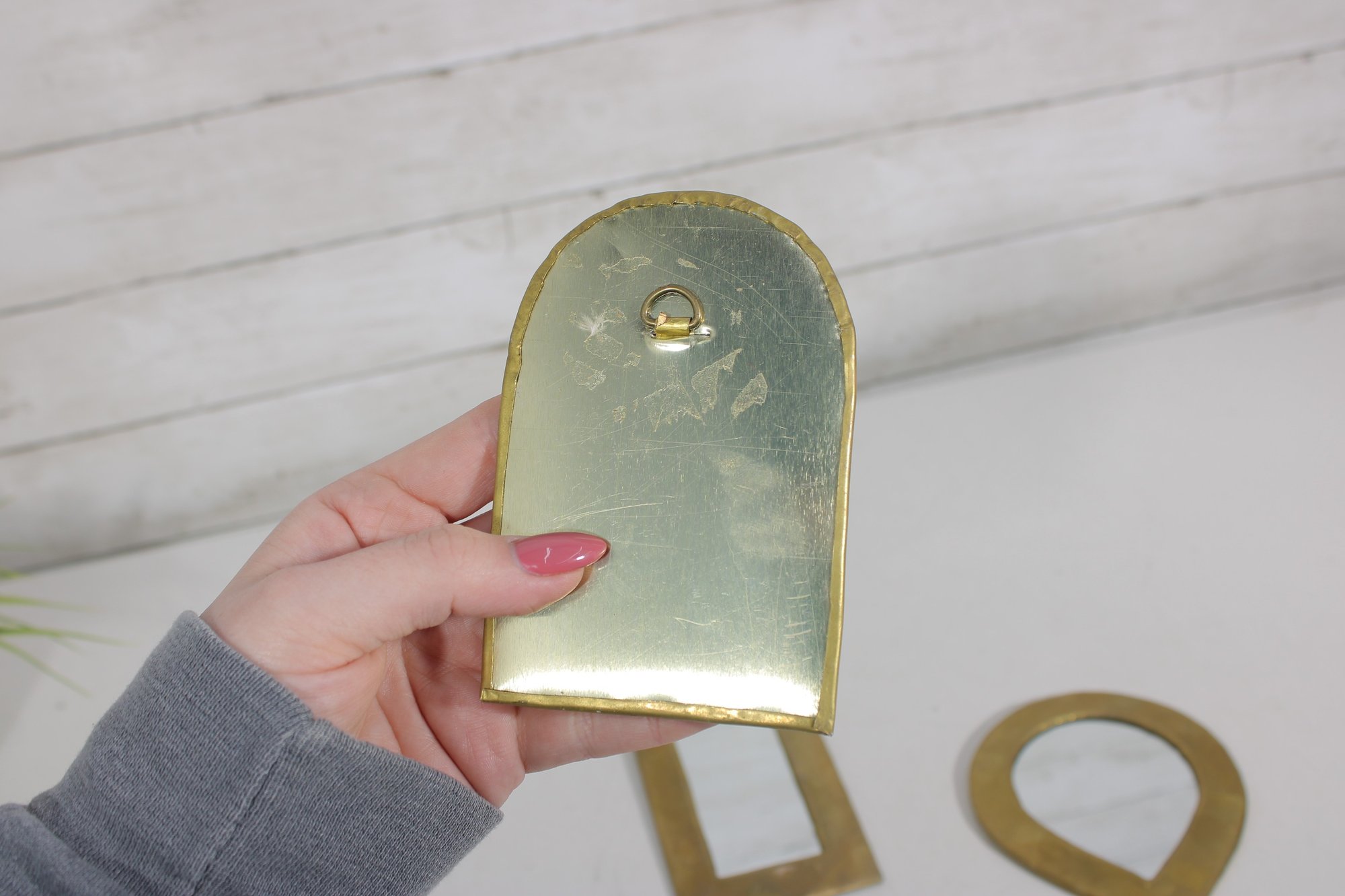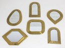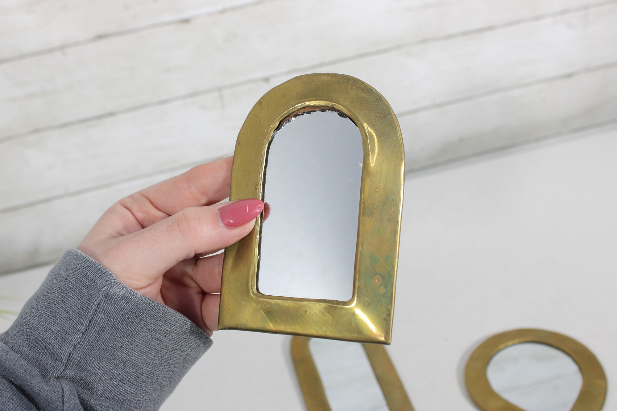 a stylish group lot of six vintage mini wall mirrors featuring solid brass frames in a variety of geometric and organic shapes. This unique set includes oval, arched, teardrop, square, and hexagonal designs, creating a visually and cohesive decorative grouping.