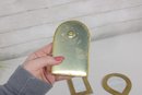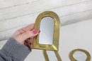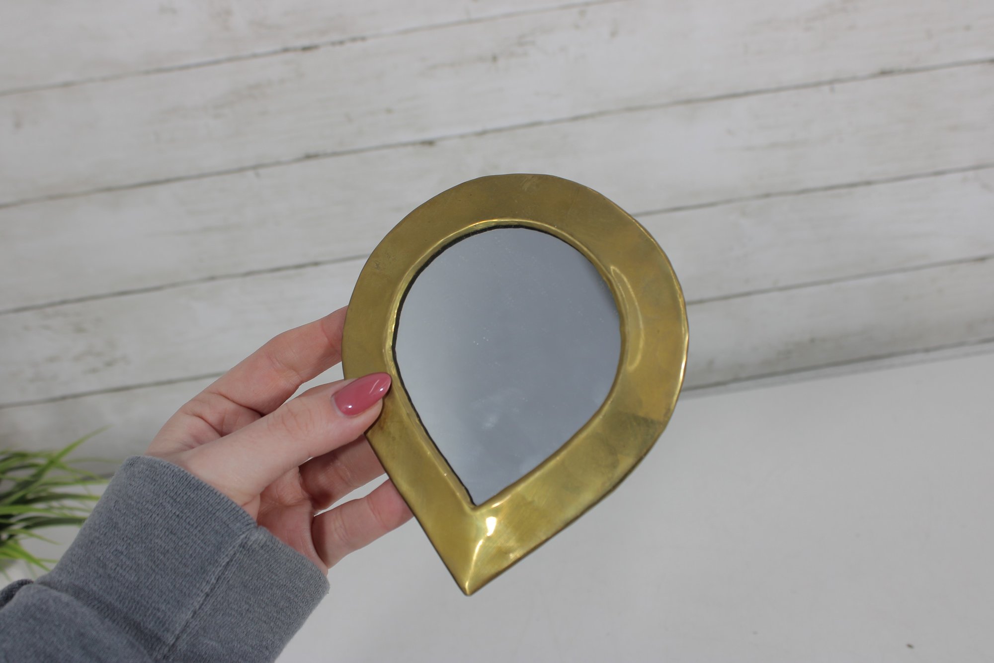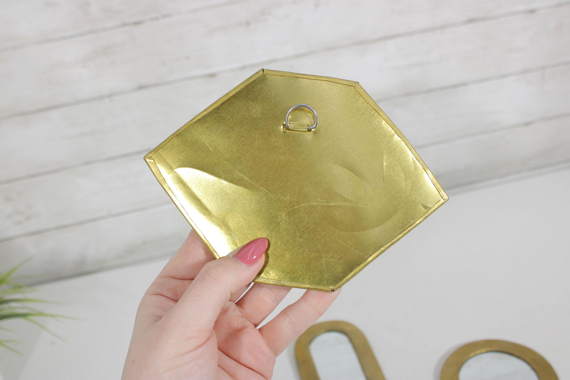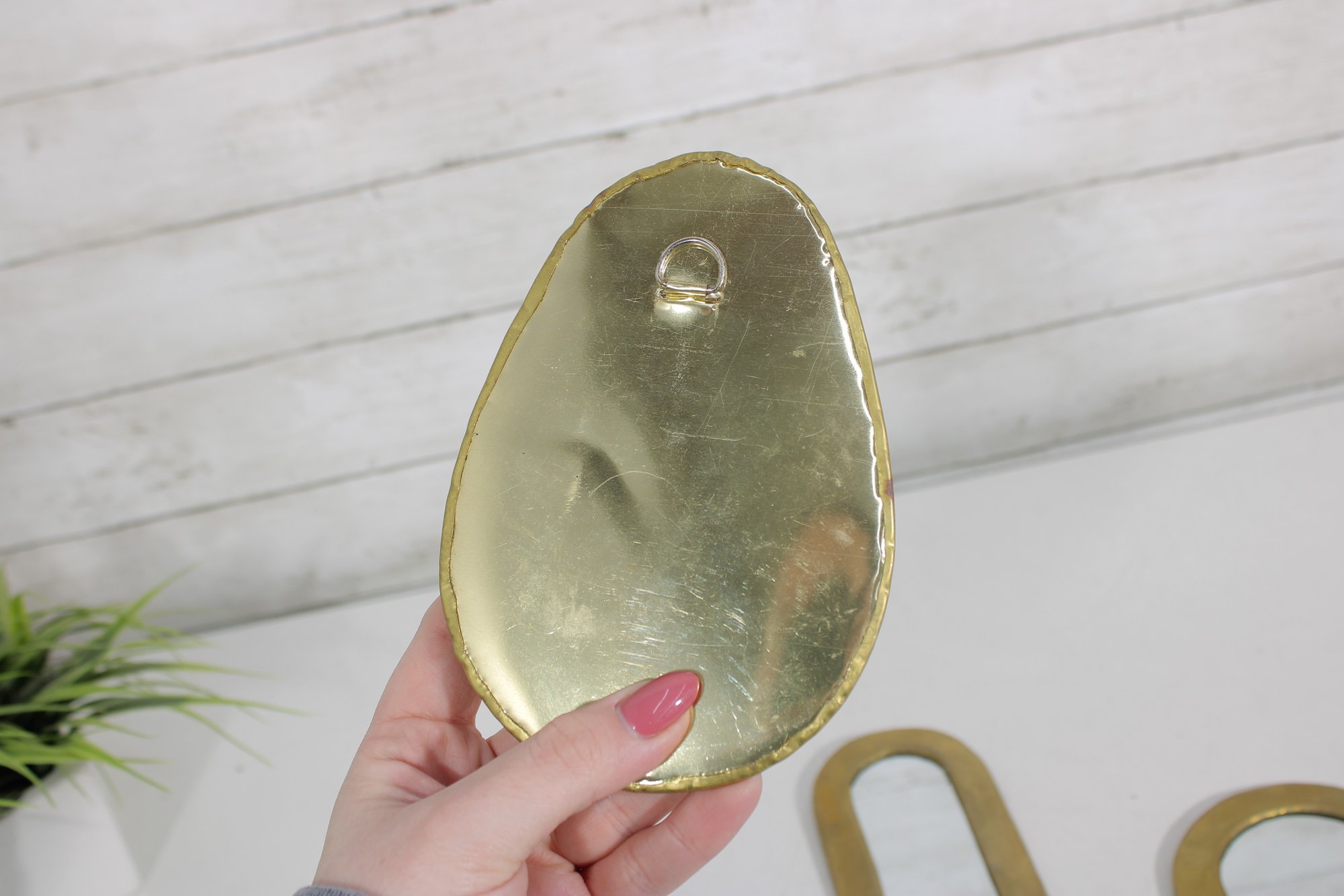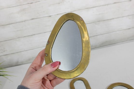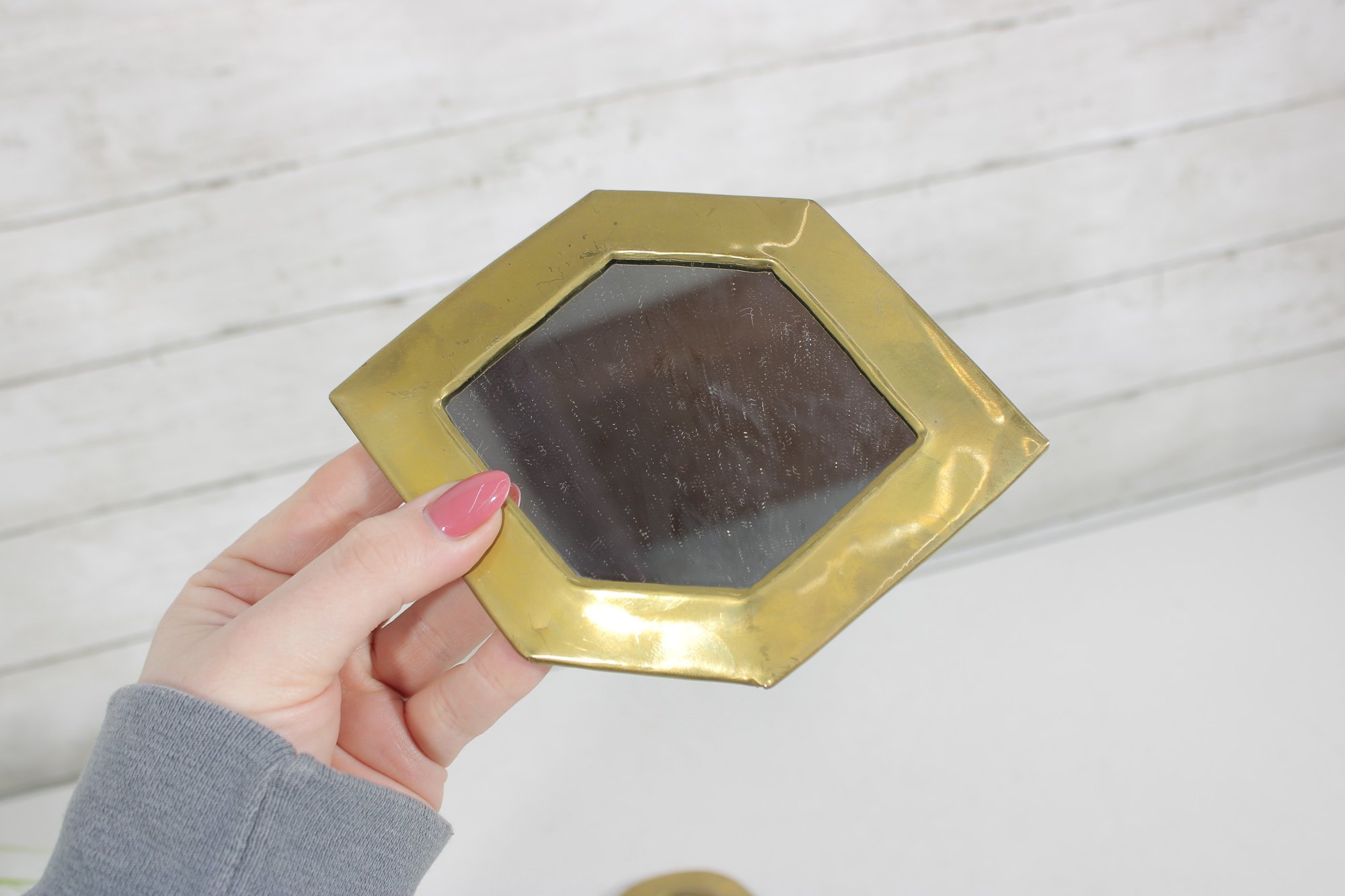 a stylish group lot of six vintage mini wall mirrors featuring solid brass frames in a variety of geometric and organic shapes. This unique set includes oval, arched, teardrop, square, and hexagonal designs, creating a visually and cohesive decorative grouping.