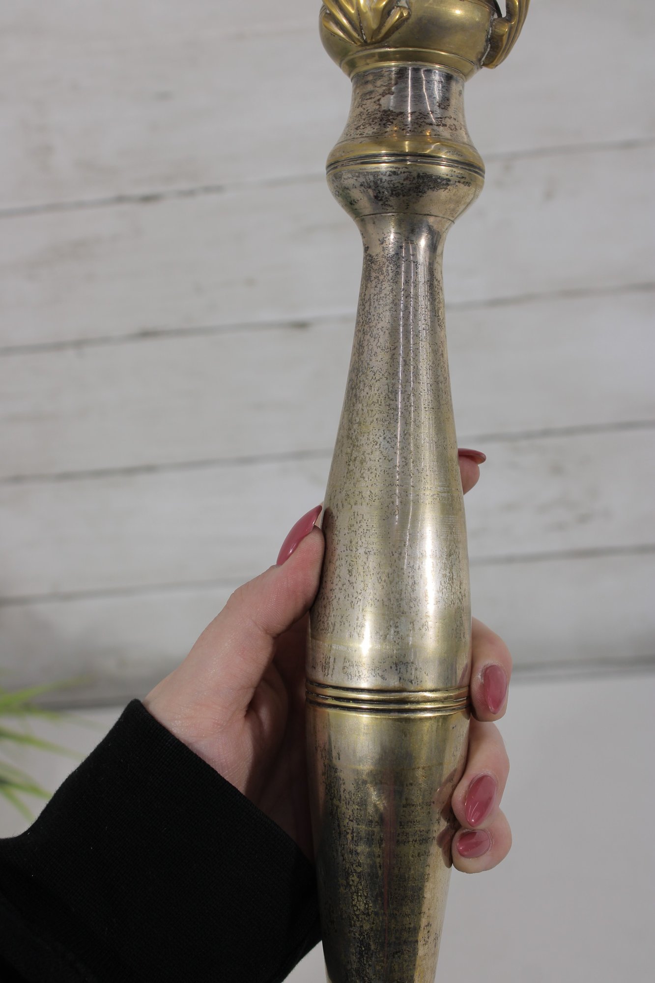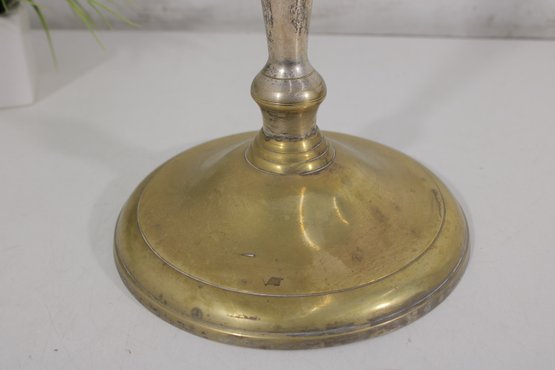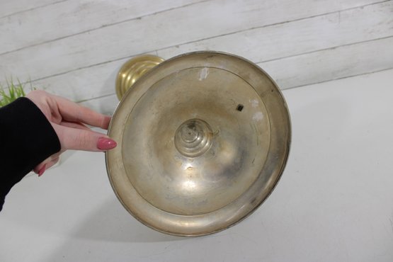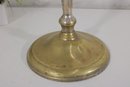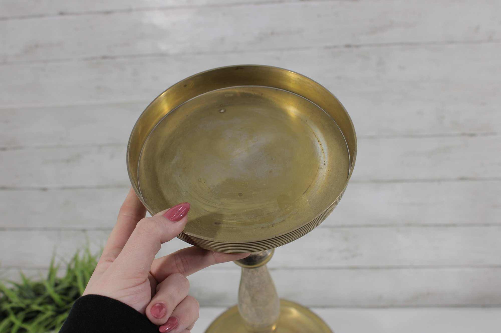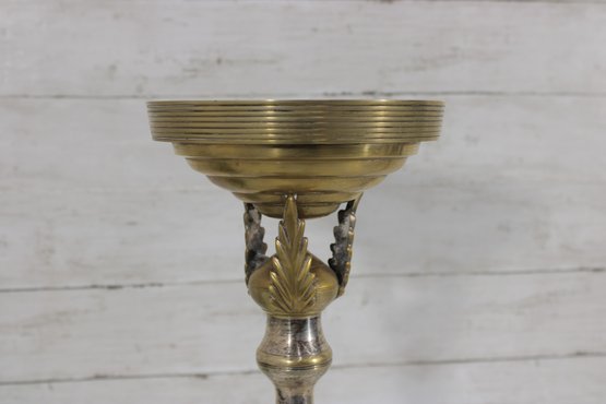 vintage brass pedestal stand designed for use as a candle holder or floral display stand. The piece features a tall, slender column with decorative detailing and a wide, tiered top bowl suitable for holding candles, arrangements, or decorative items.