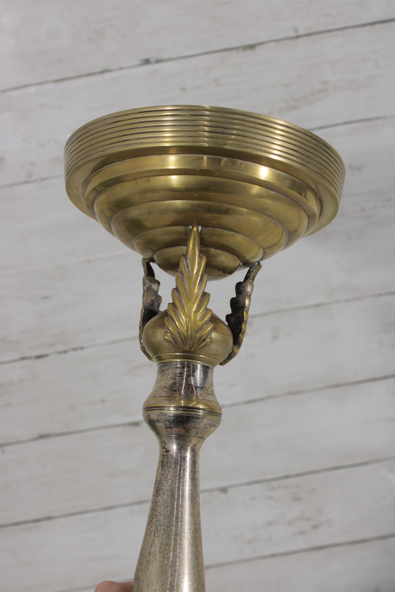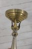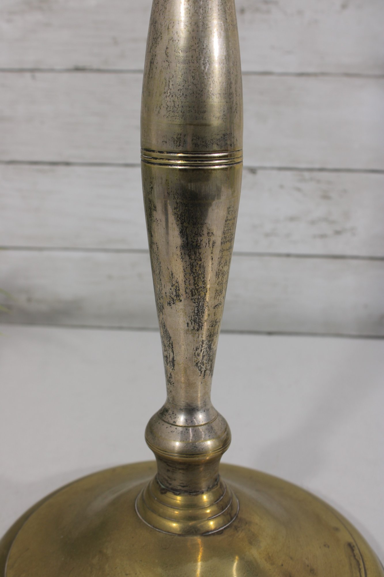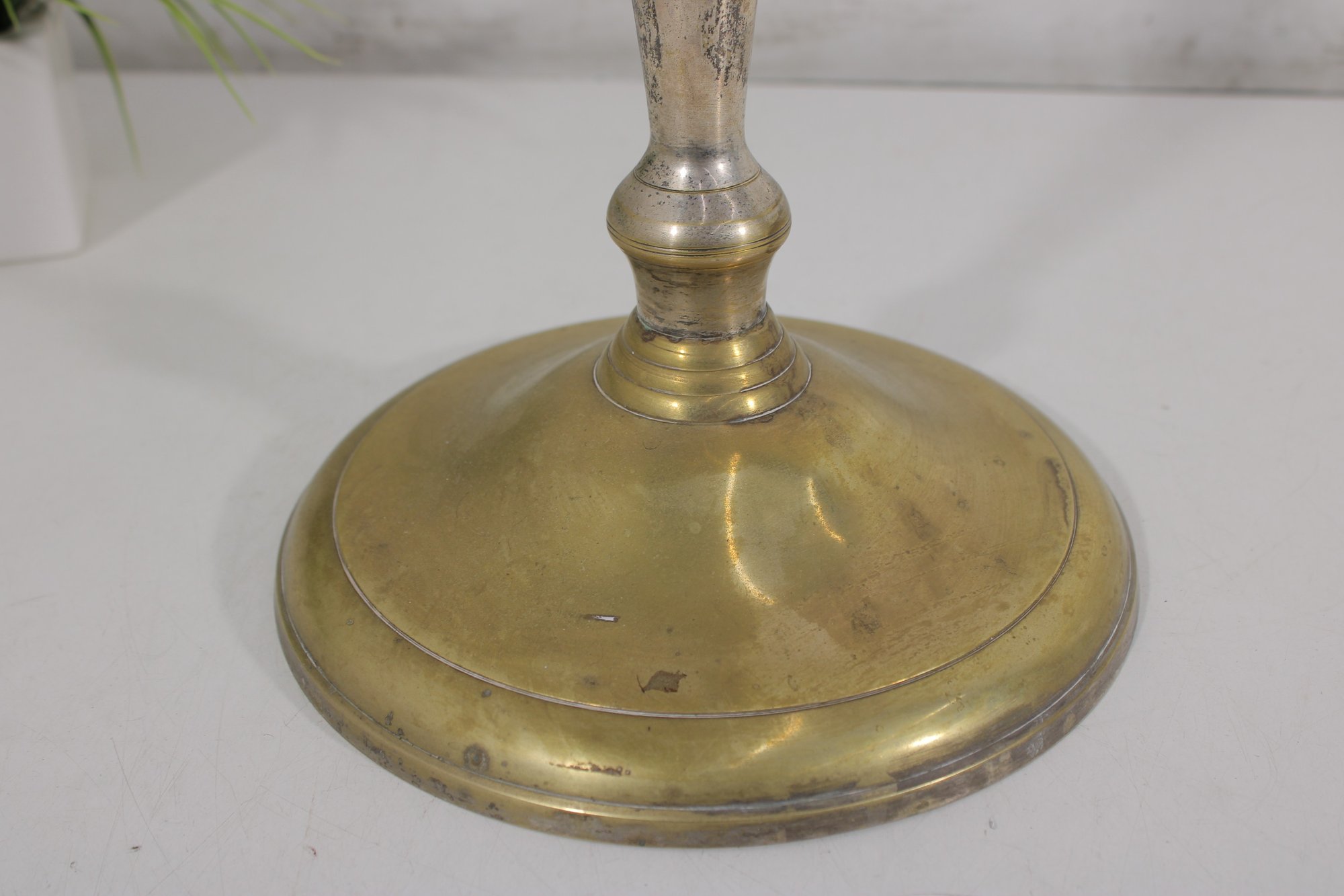 vintage brass pedestal stand designed for use as a candle holder or floral display stand. The piece features a tall, slender column with decorative detailing and a wide, tiered top bowl suitable for holding candles, arrangements, or decorative items.