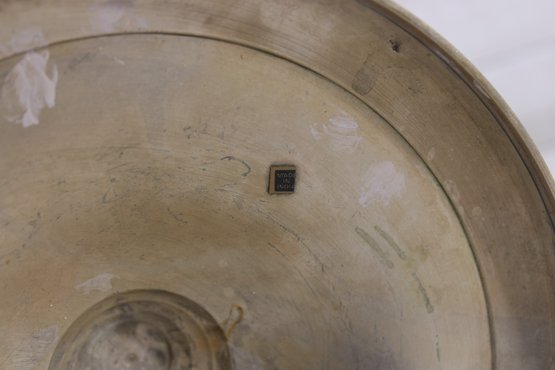 The top has a stepped, dish-like form, while the central column includes subtle engraved and sculptural accents. The wide round base provides stability and complements the overall classic design.