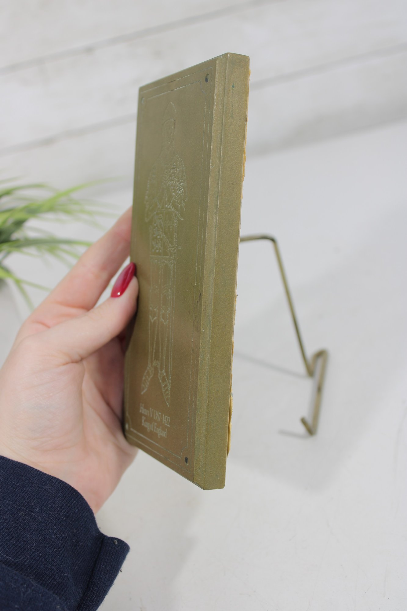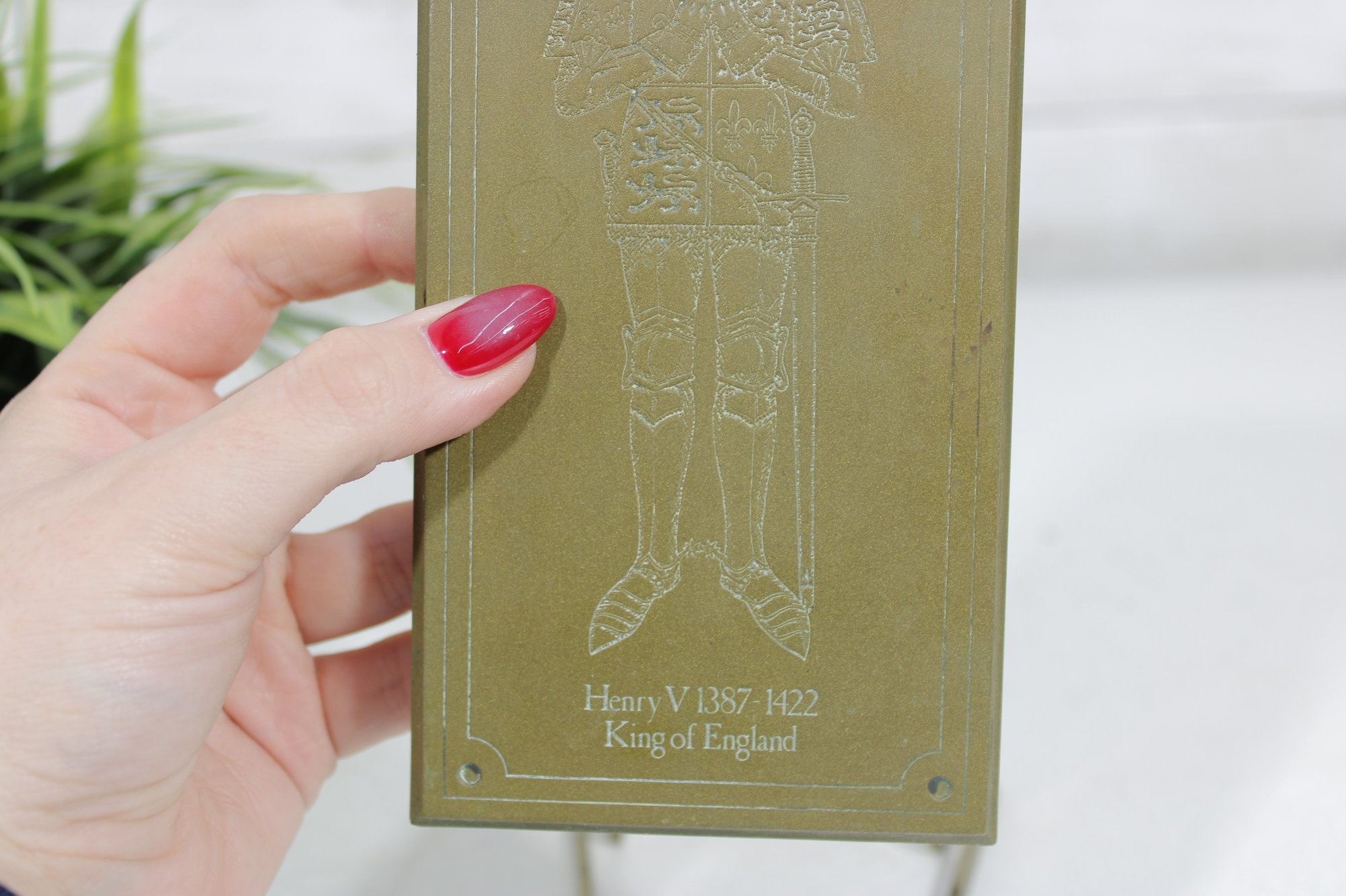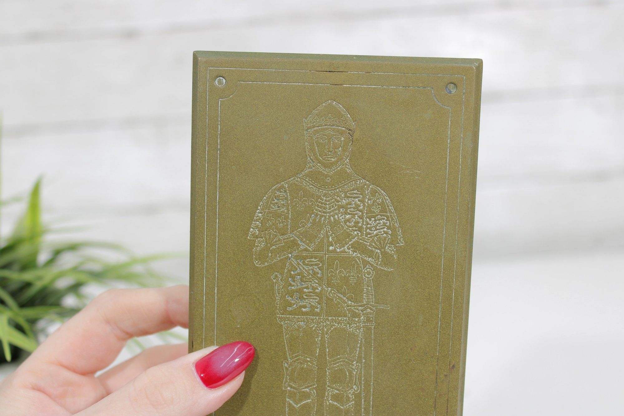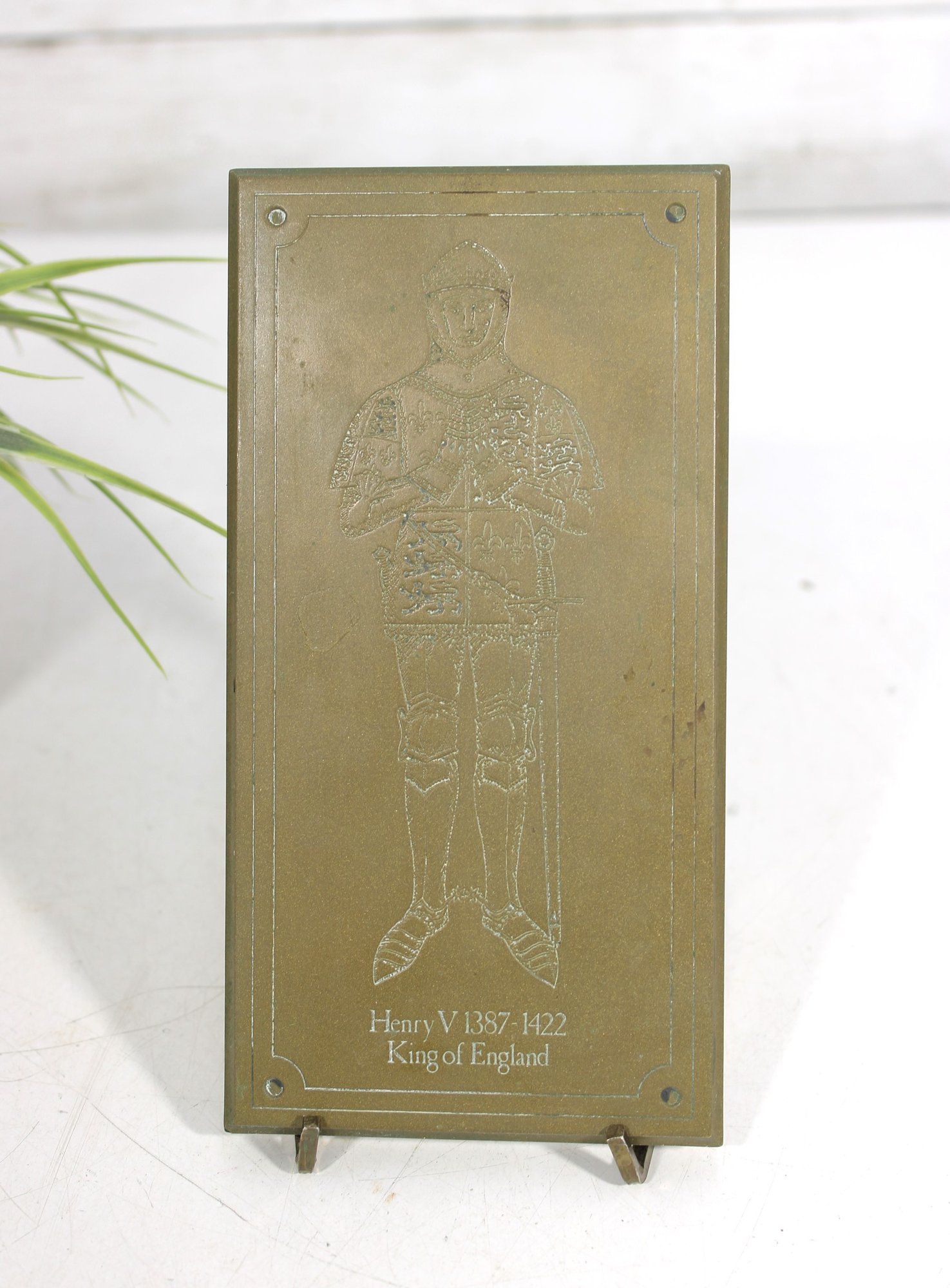 Vintage brass plaque depicting King Henry V of England, part of the “Great Britons” series. This decorative piece features an etched full-length figure of Henry V in armor, with fine detailing and a classic rectangular form.
