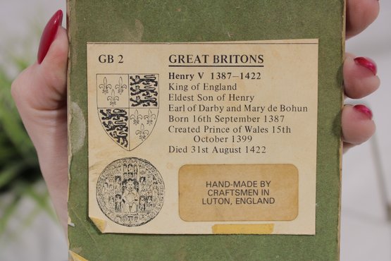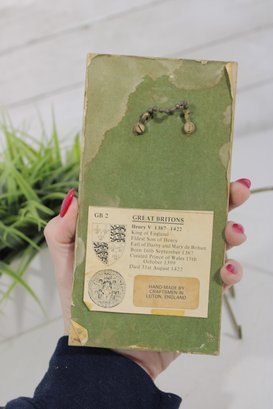 The reverse retains the original label identifying the subject and historical details, noting Henry V (1387–1422), along with maker information indicating it was hand-made by craftsmen in Luton, England. The plaque includes a hanging loop for wall display.