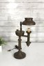 Beautiful vintage brass student-style electric table lamp featuring a traditional double-arm design with a metal shade and clear glass chimney. This lamp captures the look of an antique oil lamp but operates with modern electric convenience.