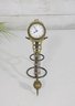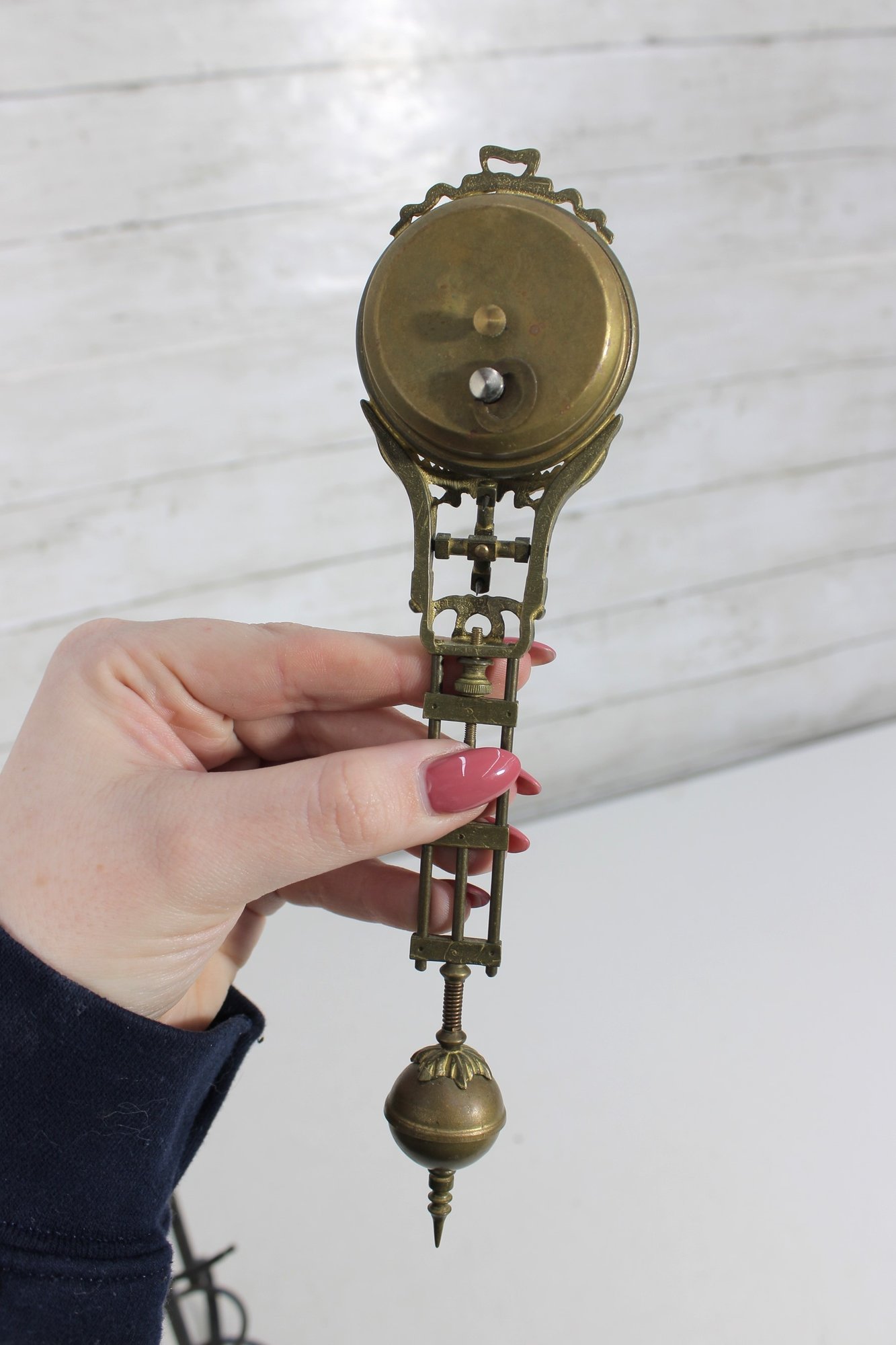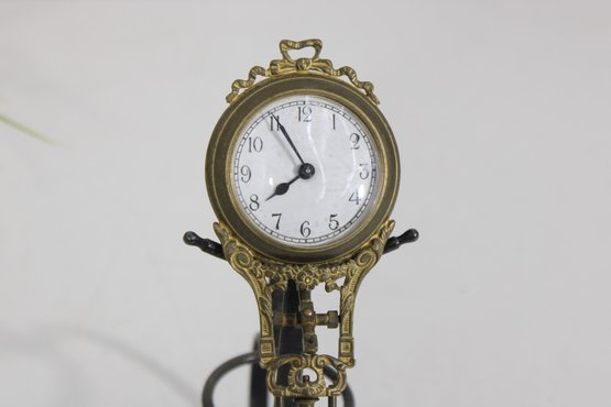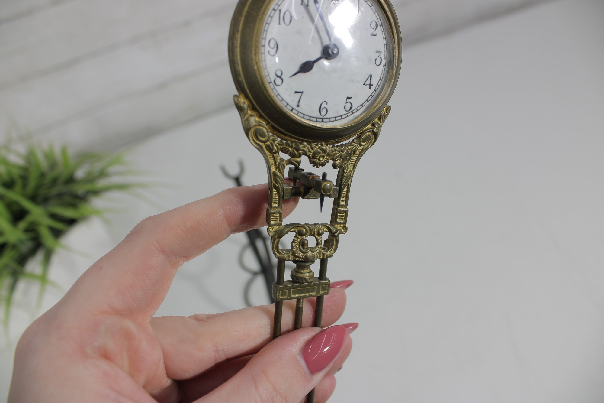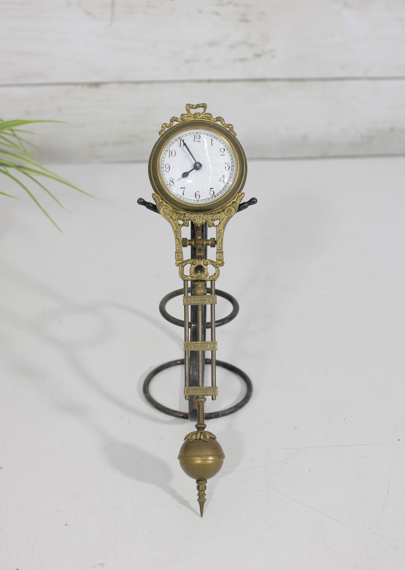 Charming vintage-style brass swinging pendulum clock featuring an ornate design and classic old-world appeal. Standing approximately 9 inches tall, this decorative timepiece showcases a detailed round clock face with Roman numerals, suspended above a visible pendulum element for added visual interest.