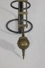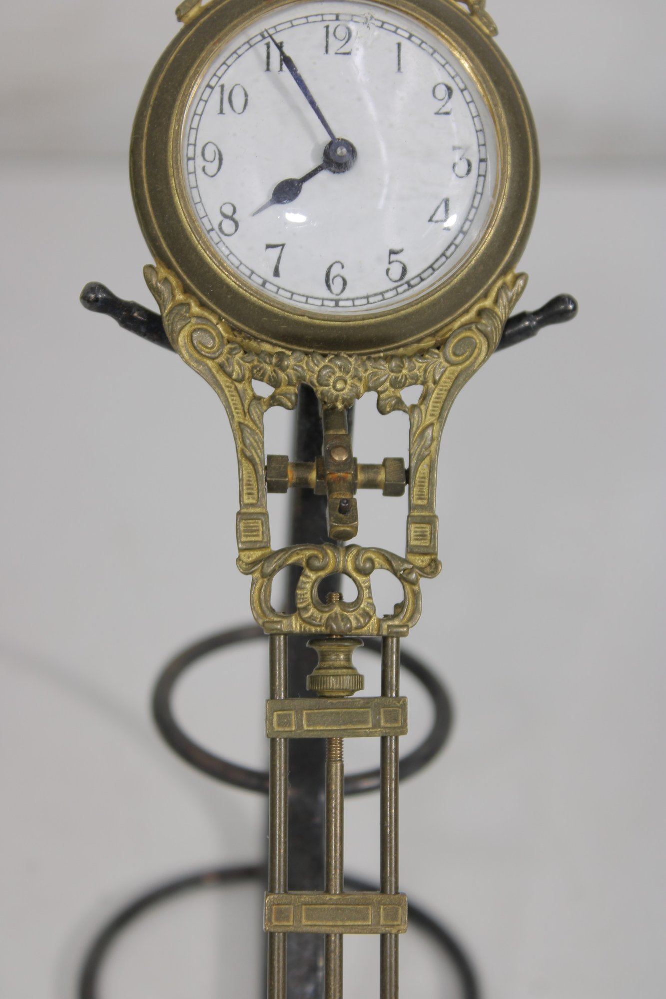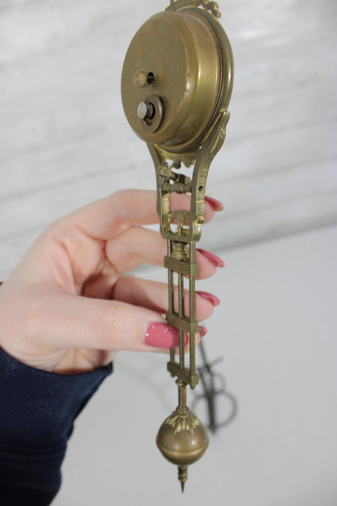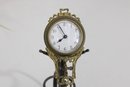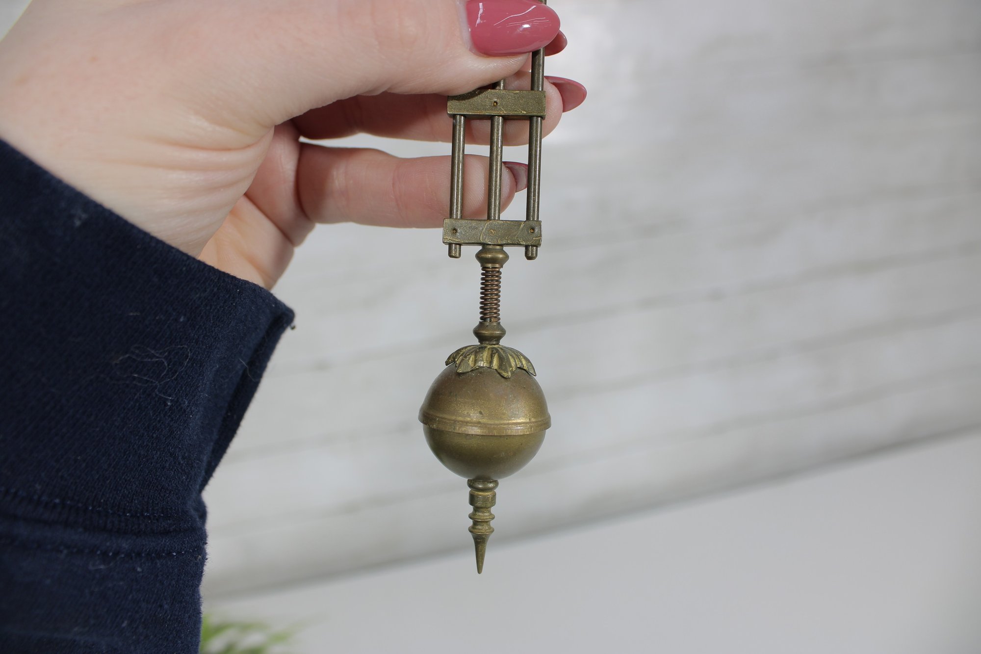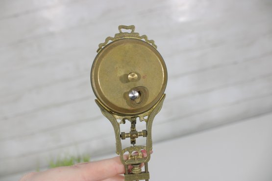 Charming vintage-style brass swinging pendulum clock featuring an ornate design and classic old-world appeal. Standing approximately 9 inches tall, this decorative timepiece showcases a detailed round clock face with Roman numerals, suspended above a visible pendulum element for added visual interest.